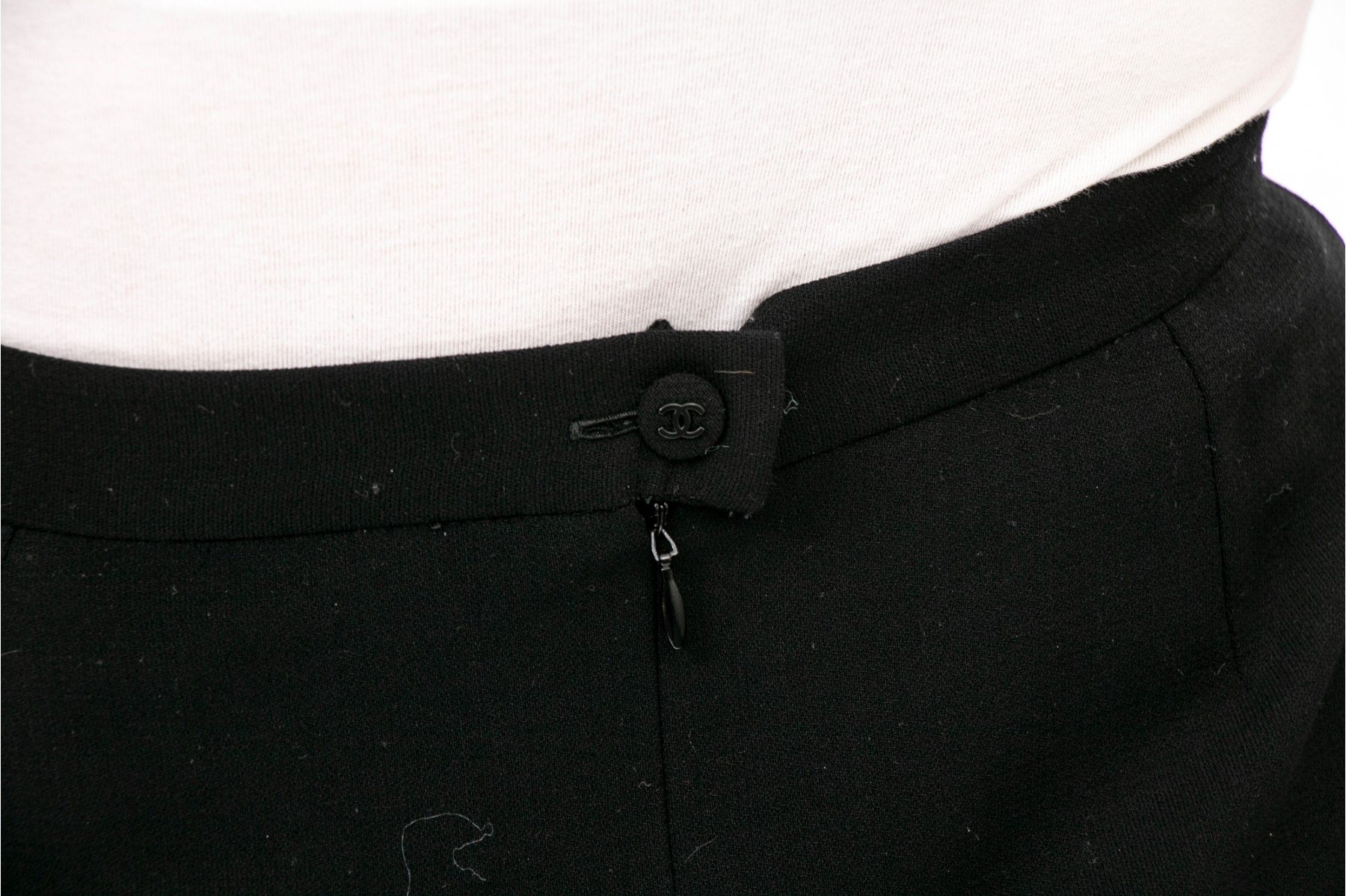 CHANEL black wool skirt sits at waist and hits above the knee. Fully lined.