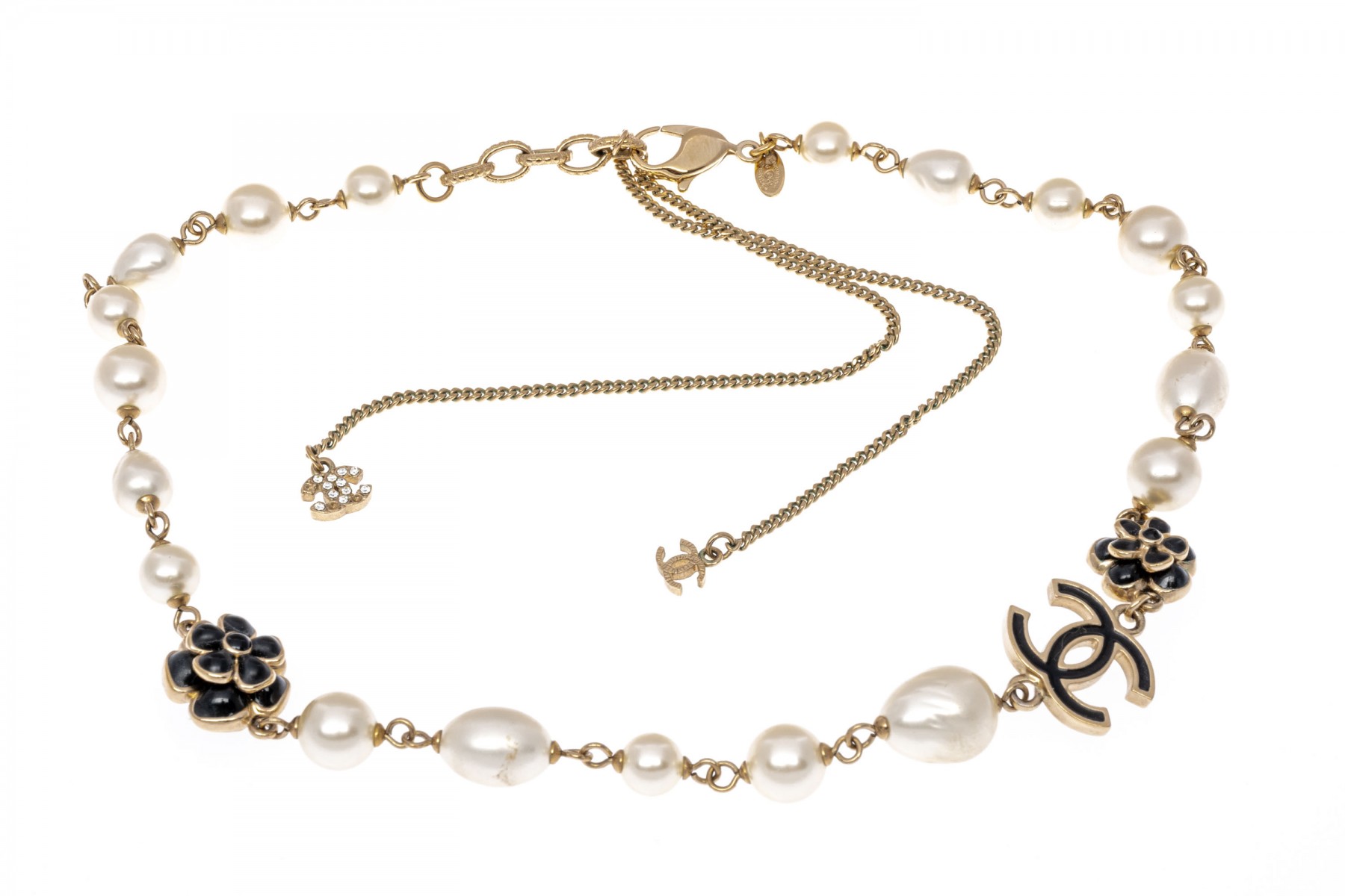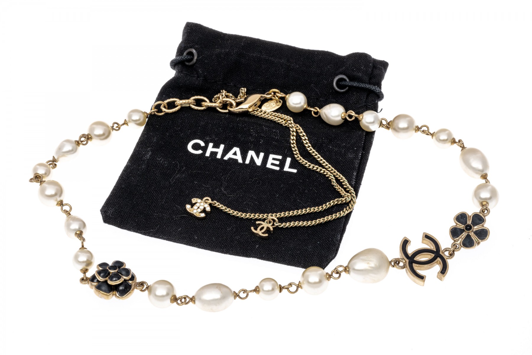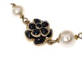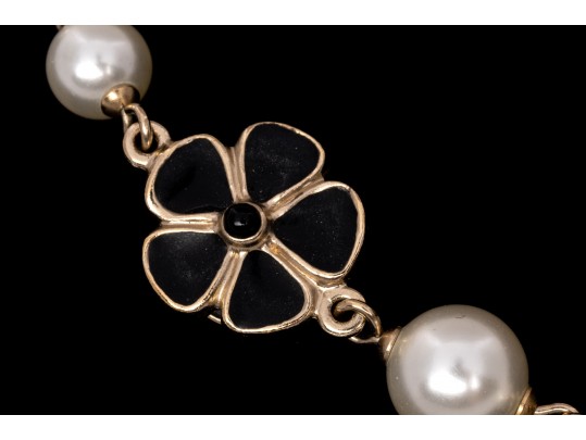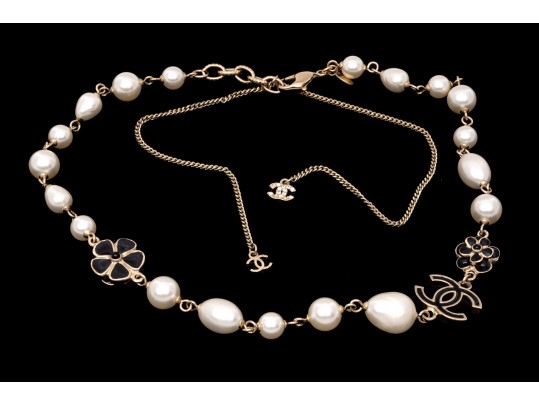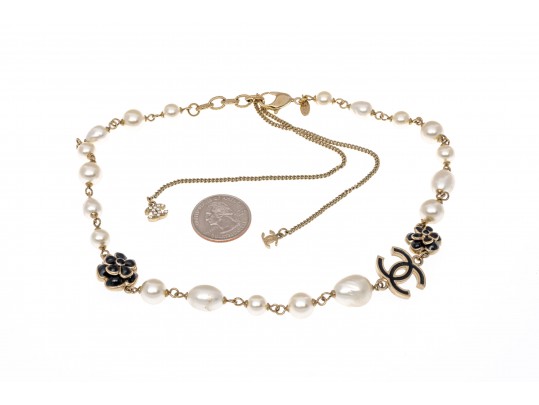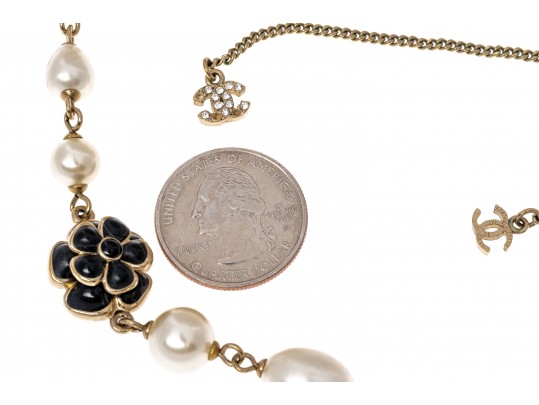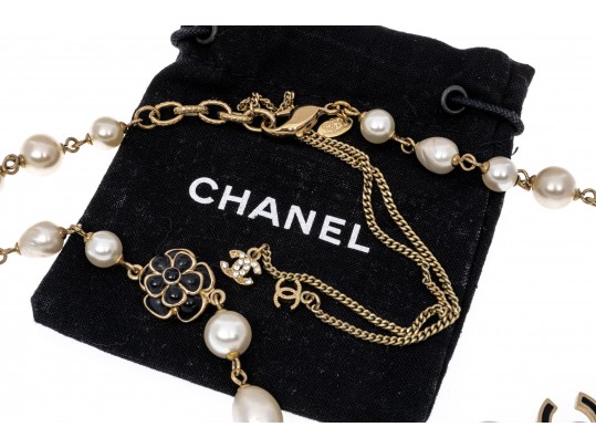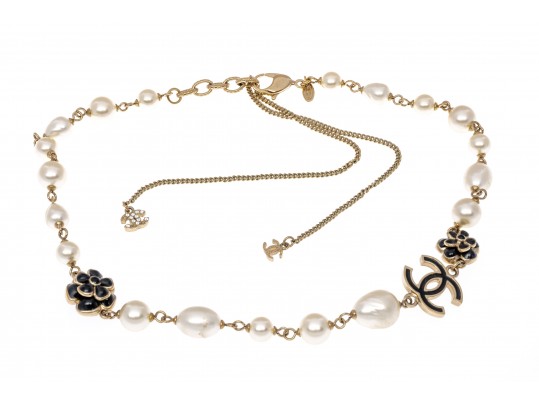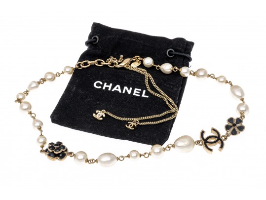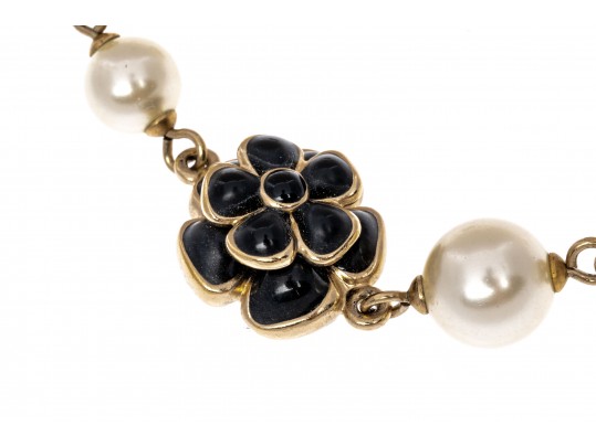 A Chanel necklace of faux pearls. Set with the pearls are two black camellia flowers and Chanel's interlocking 'C' logo. The piece is adjustable and has two asymmetrical tassels down the back, also with the interlocking 'C' logo for added detail. Lobster claw clasp.