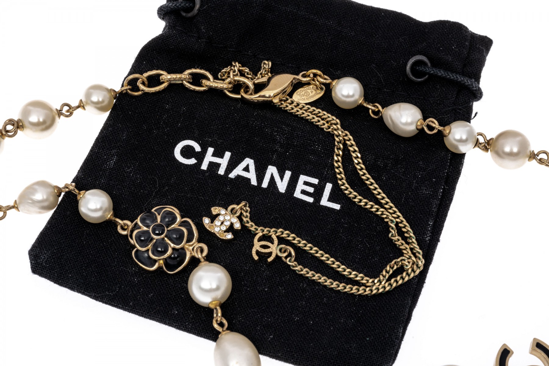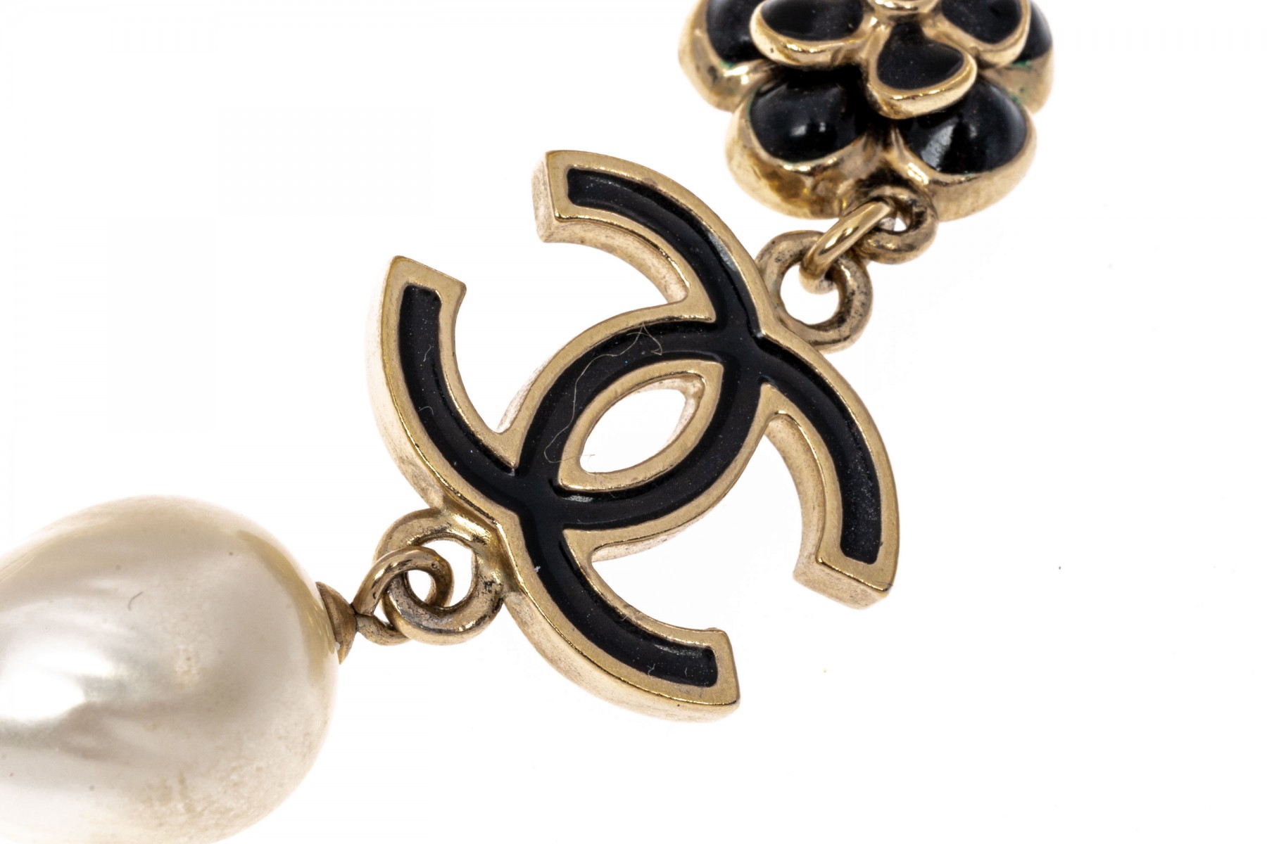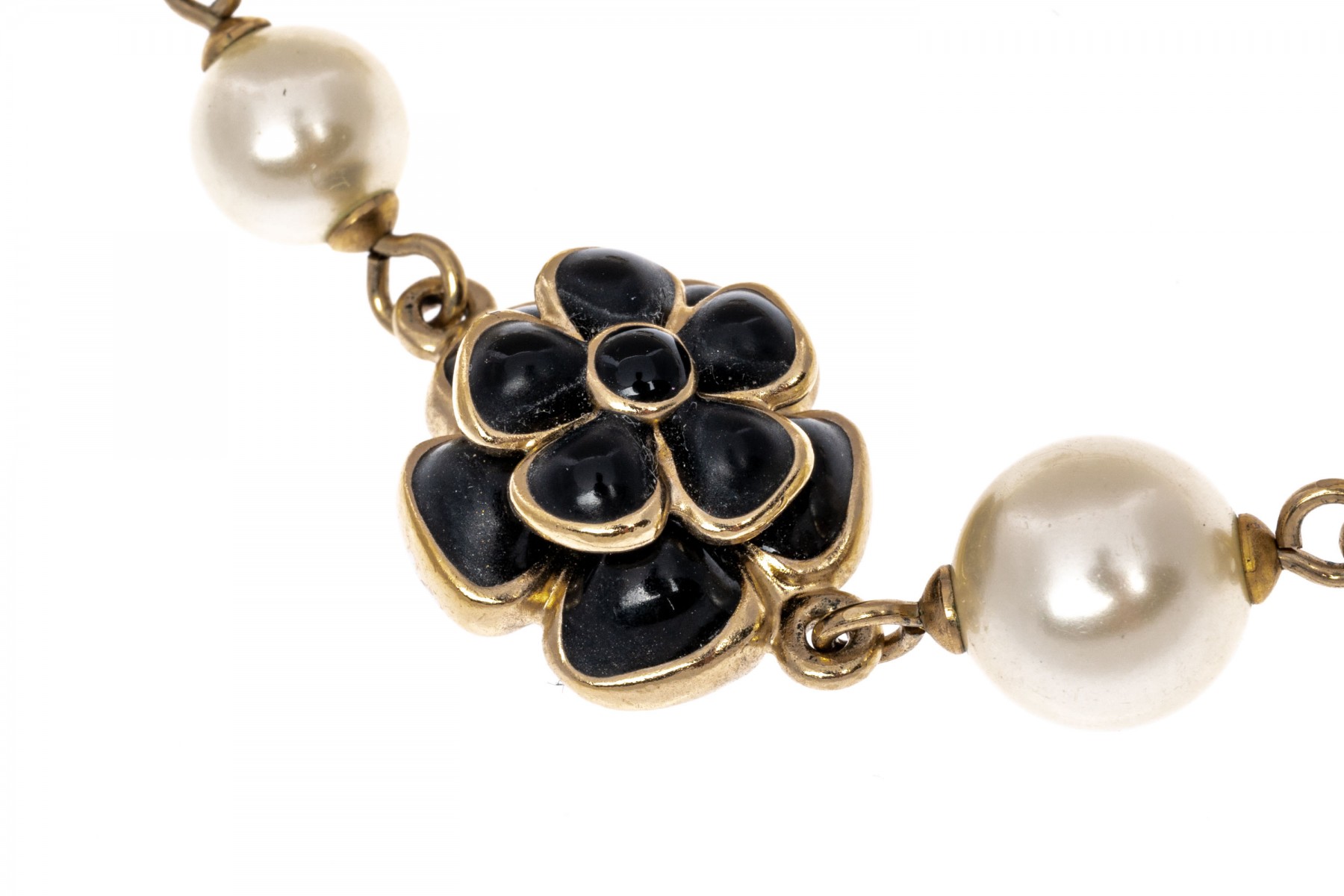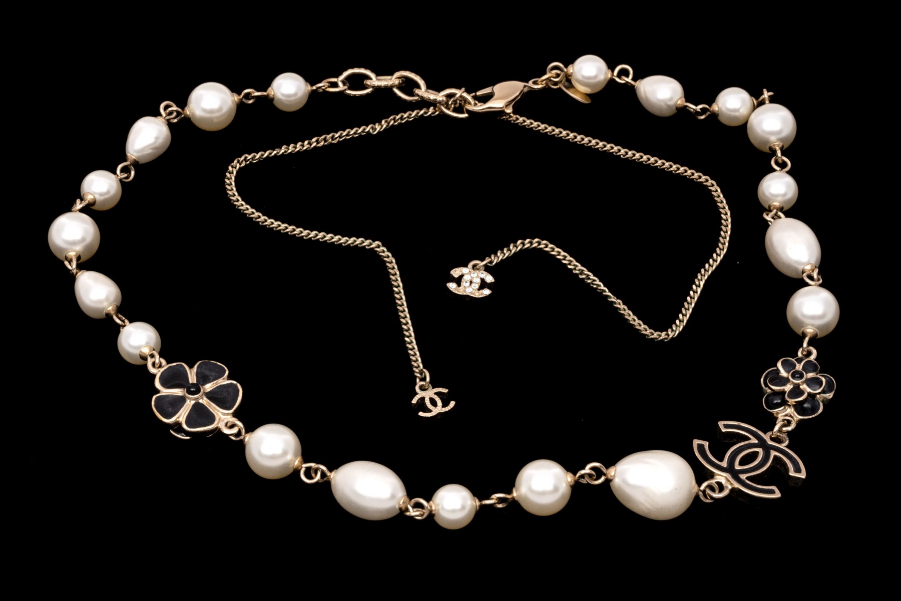 A Chanel necklace of faux pearls. Set with the pearls are two black camellia flowers and Chanel's interlocking 'C' logo. The piece is adjustable and has two asymmetrical tassels down the back, also with the interlocking 'C' logo for added detail. Lobster claw clasp.