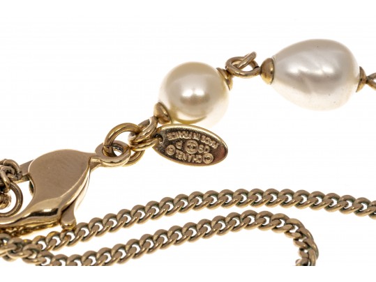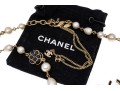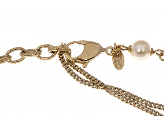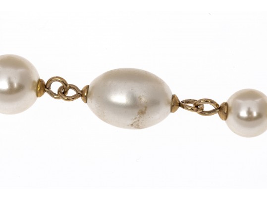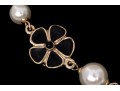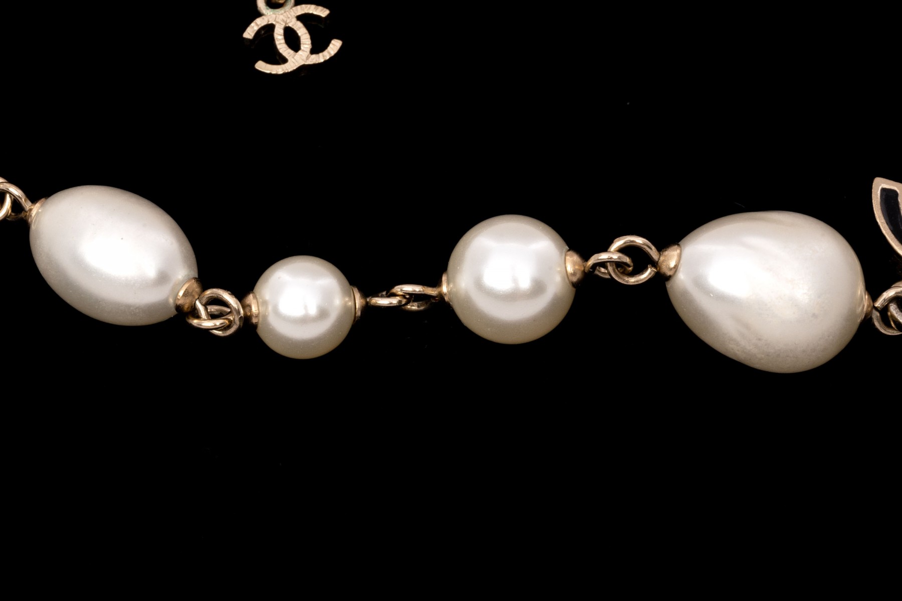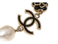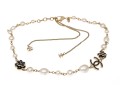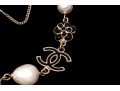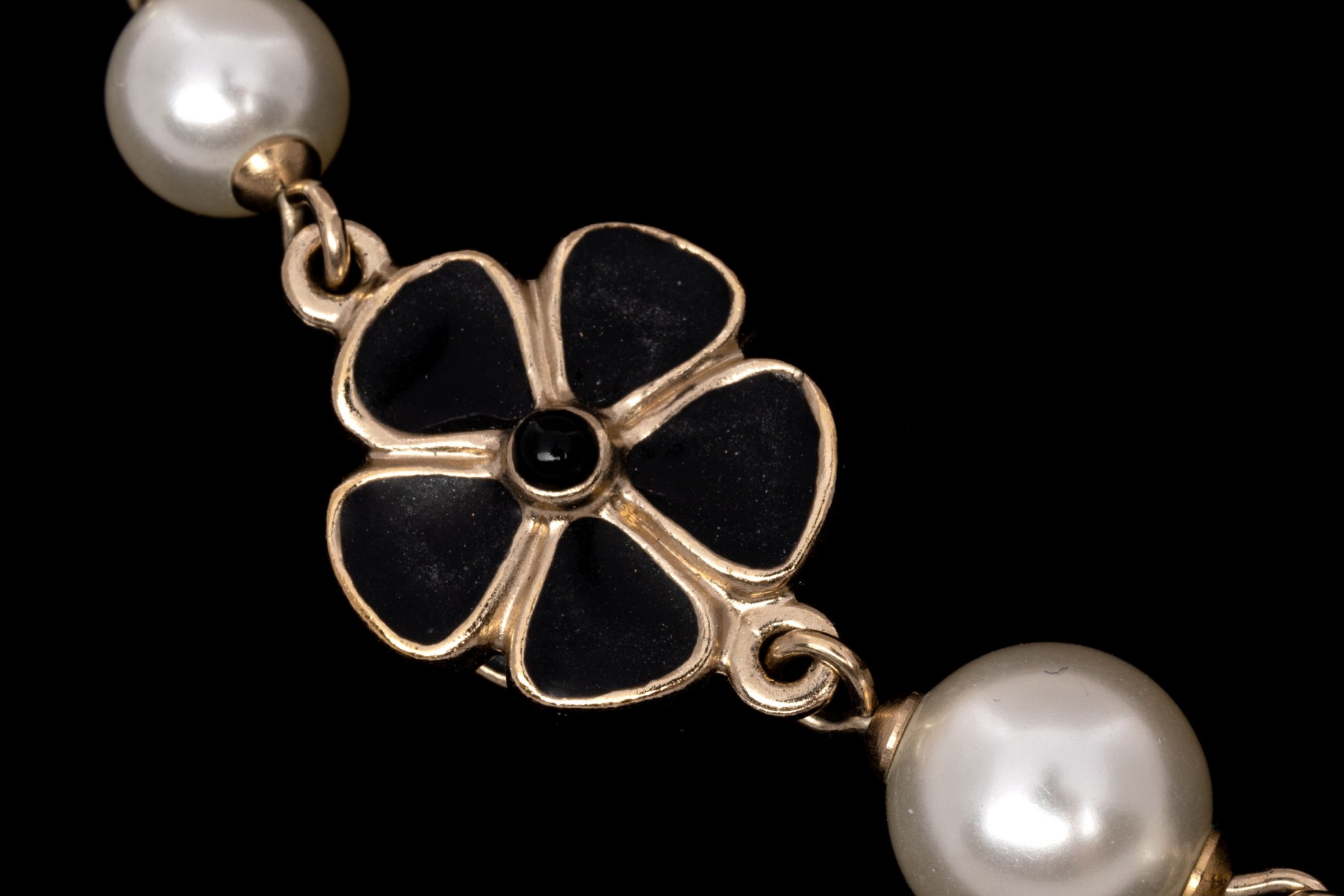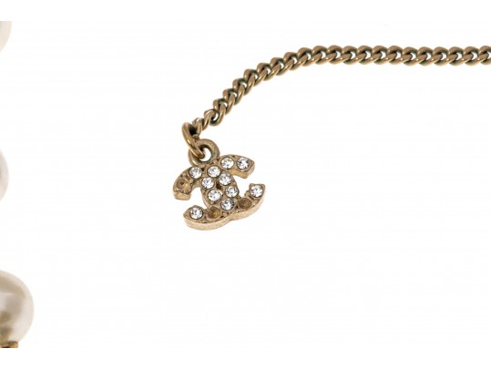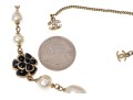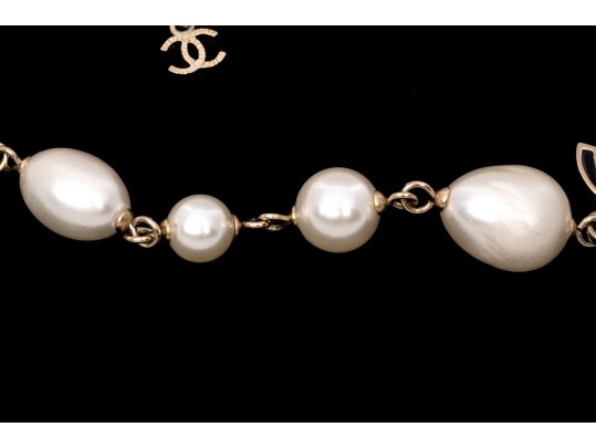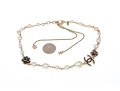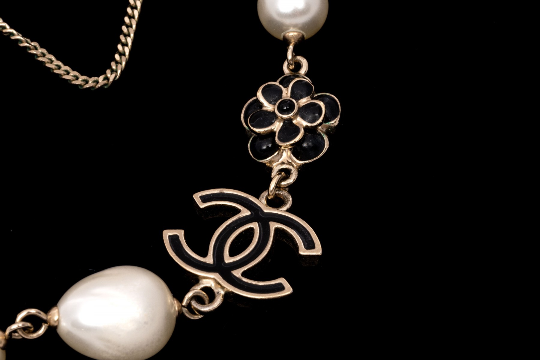A Chanel necklace of faux pearls. Set with the pearls are two black camellia flowers and Chanel's interlocking 'C' logo. The piece is adjustable and has two asymmetrical tassels down the back, also with the interlocking 'C' logo for added detail. Lobster claw clasp.
