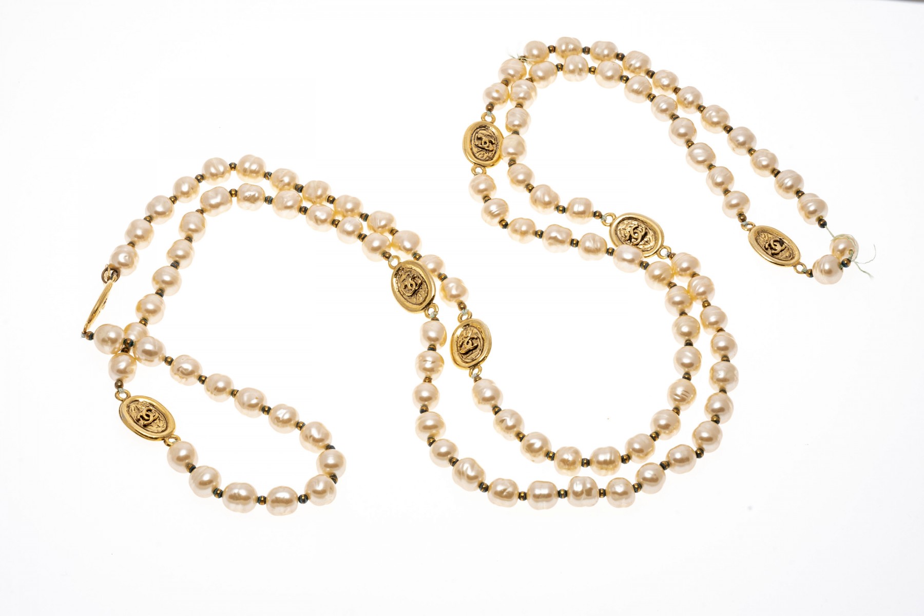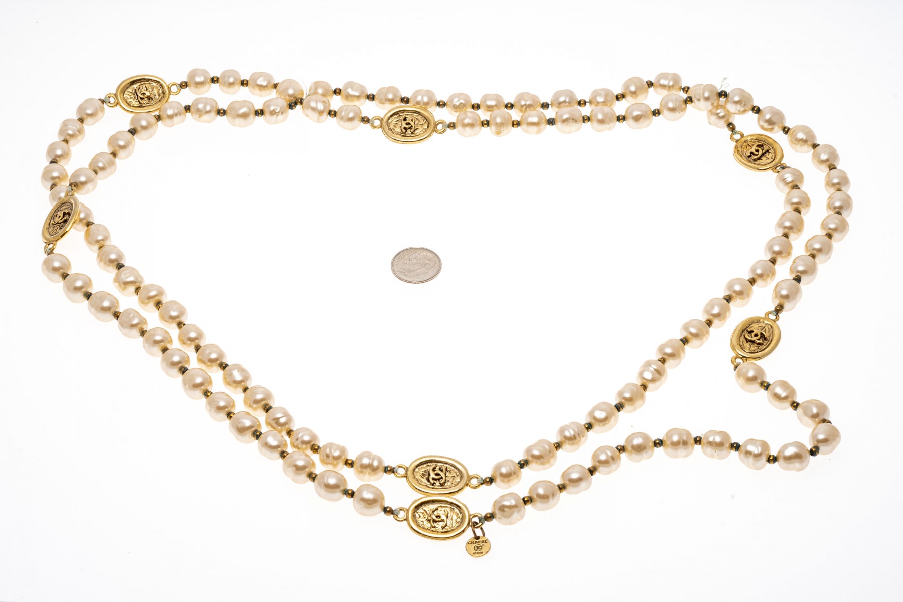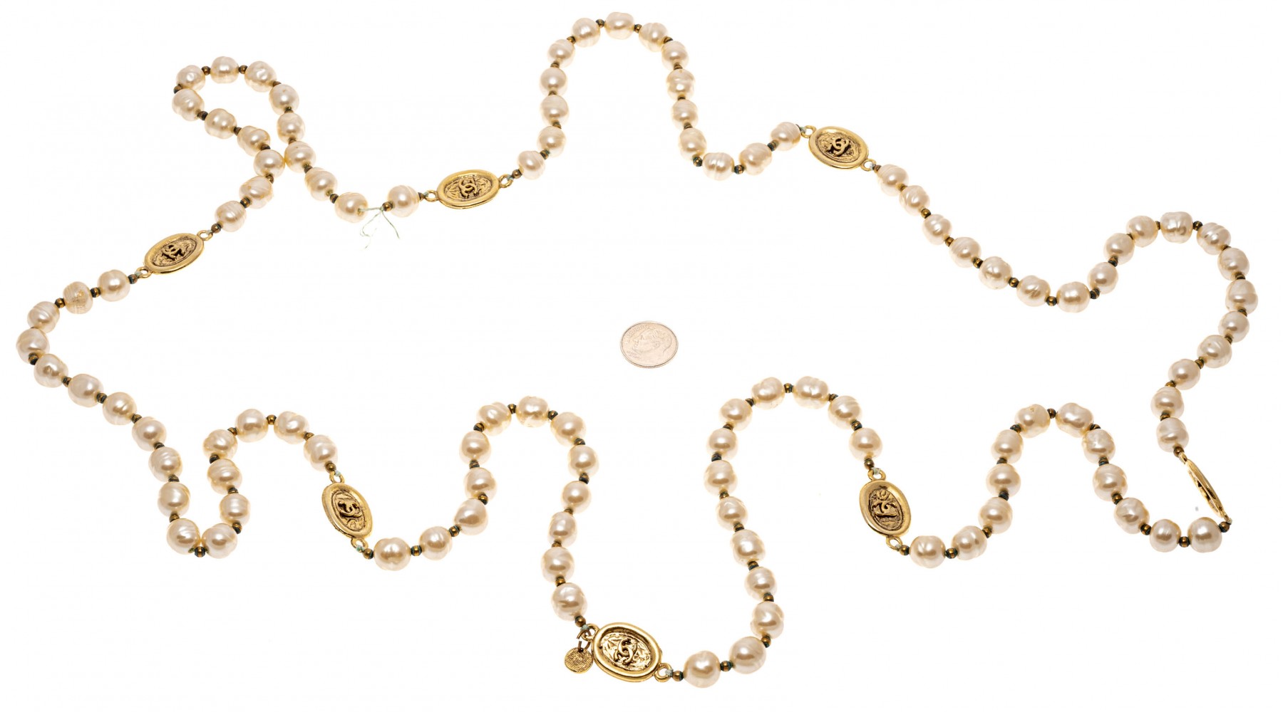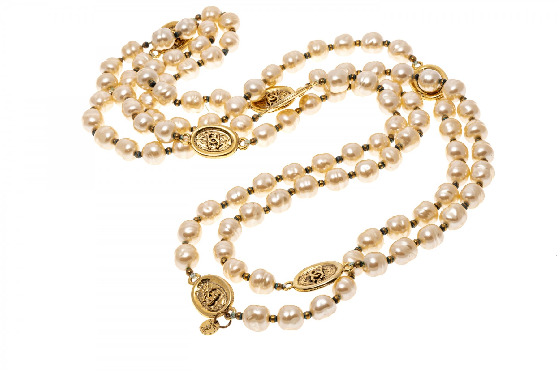 A strung necklace of faux pearls by Chanel. With the pearls are beads stamped with the Chanel double 'C' logo. No clasps, the necklace is an eternity strand.