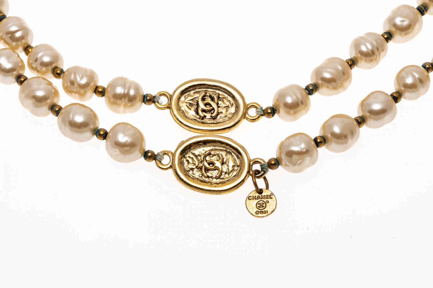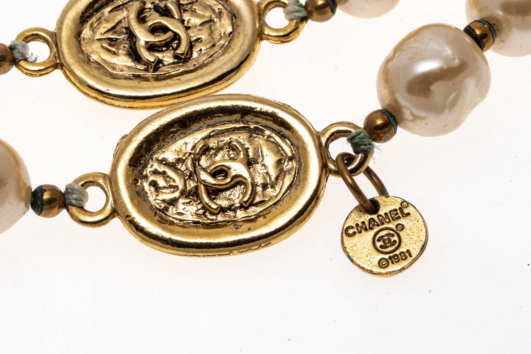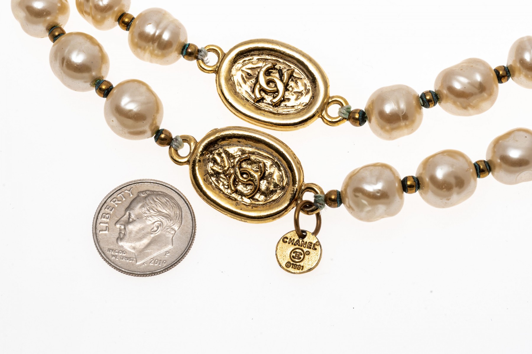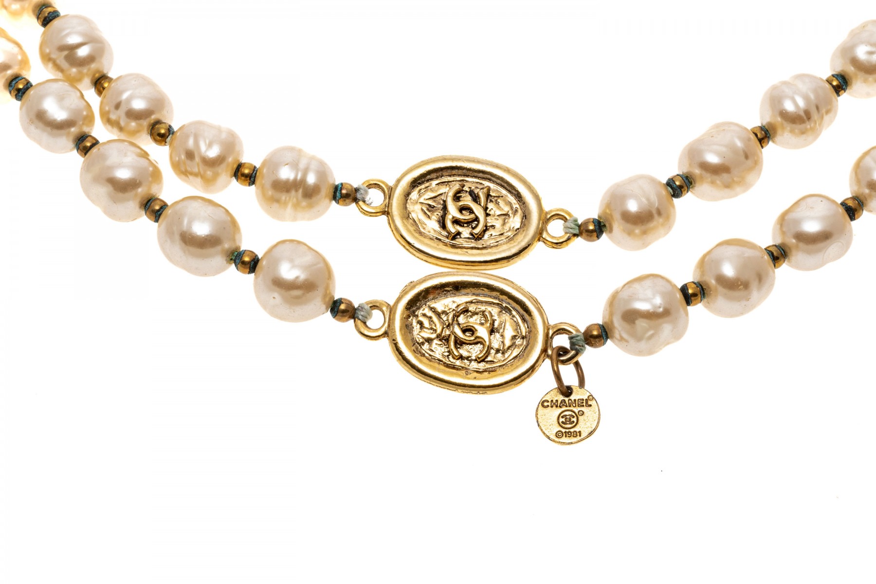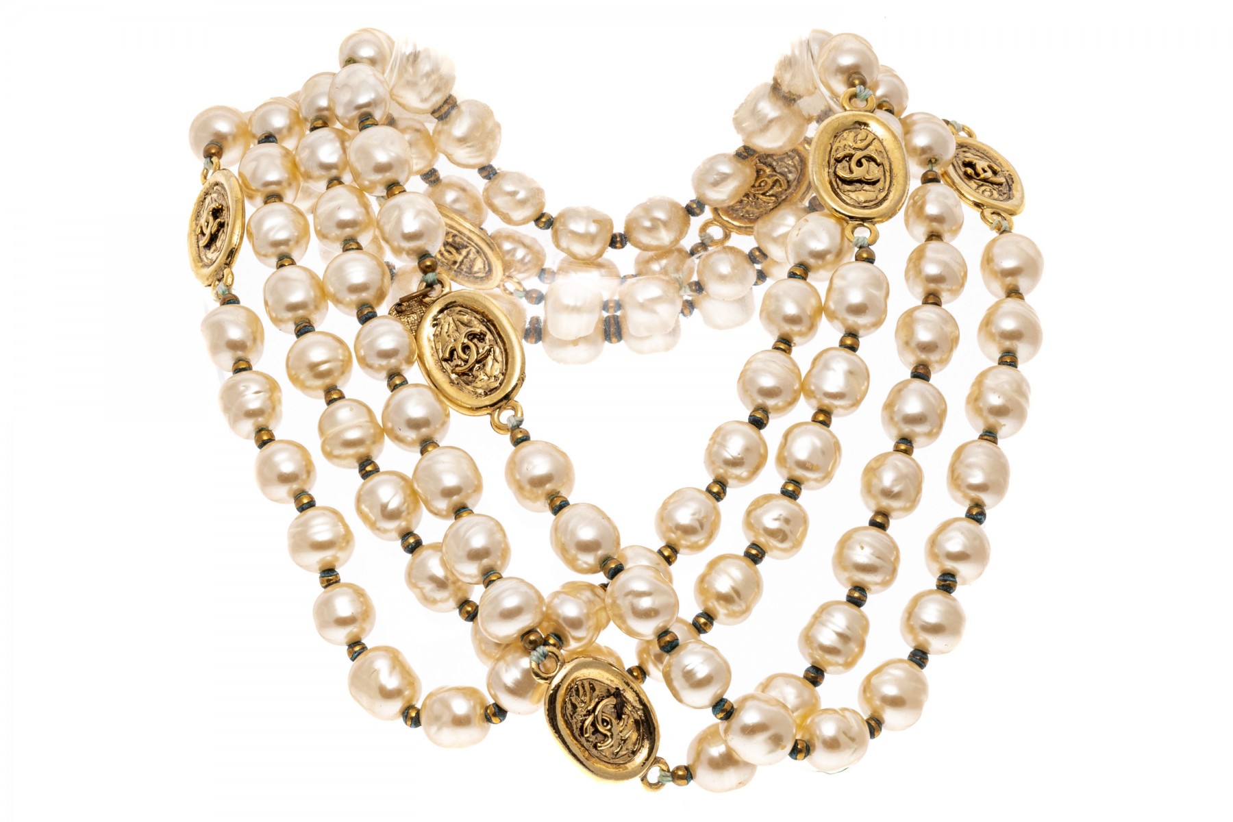 A strung necklace of faux pearls by Chanel. With the pearls are beads stamped with the Chanel double 'C' logo. No clasps, the necklace is an eternity strand.