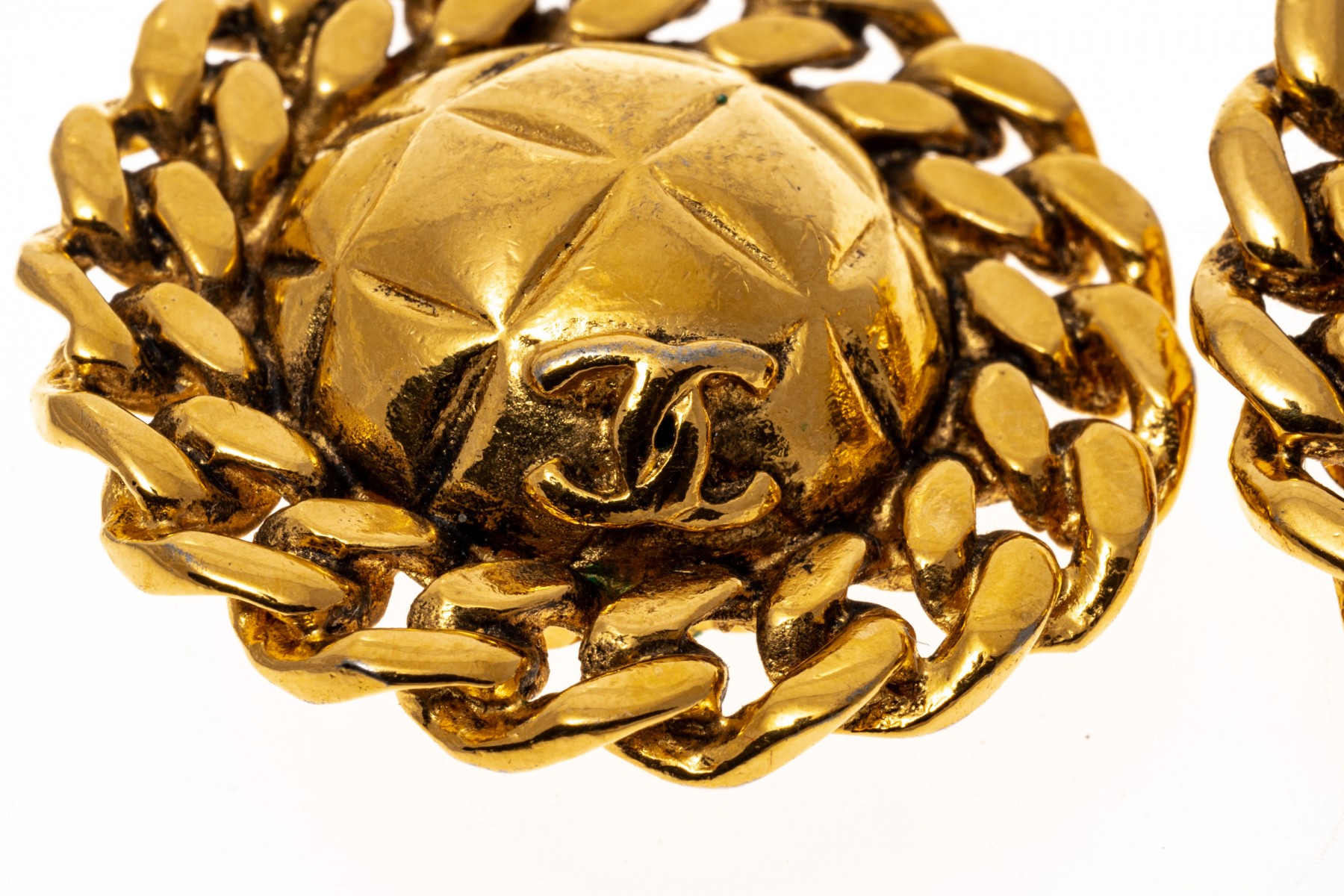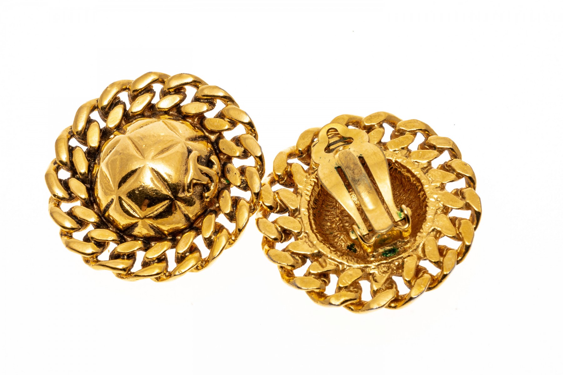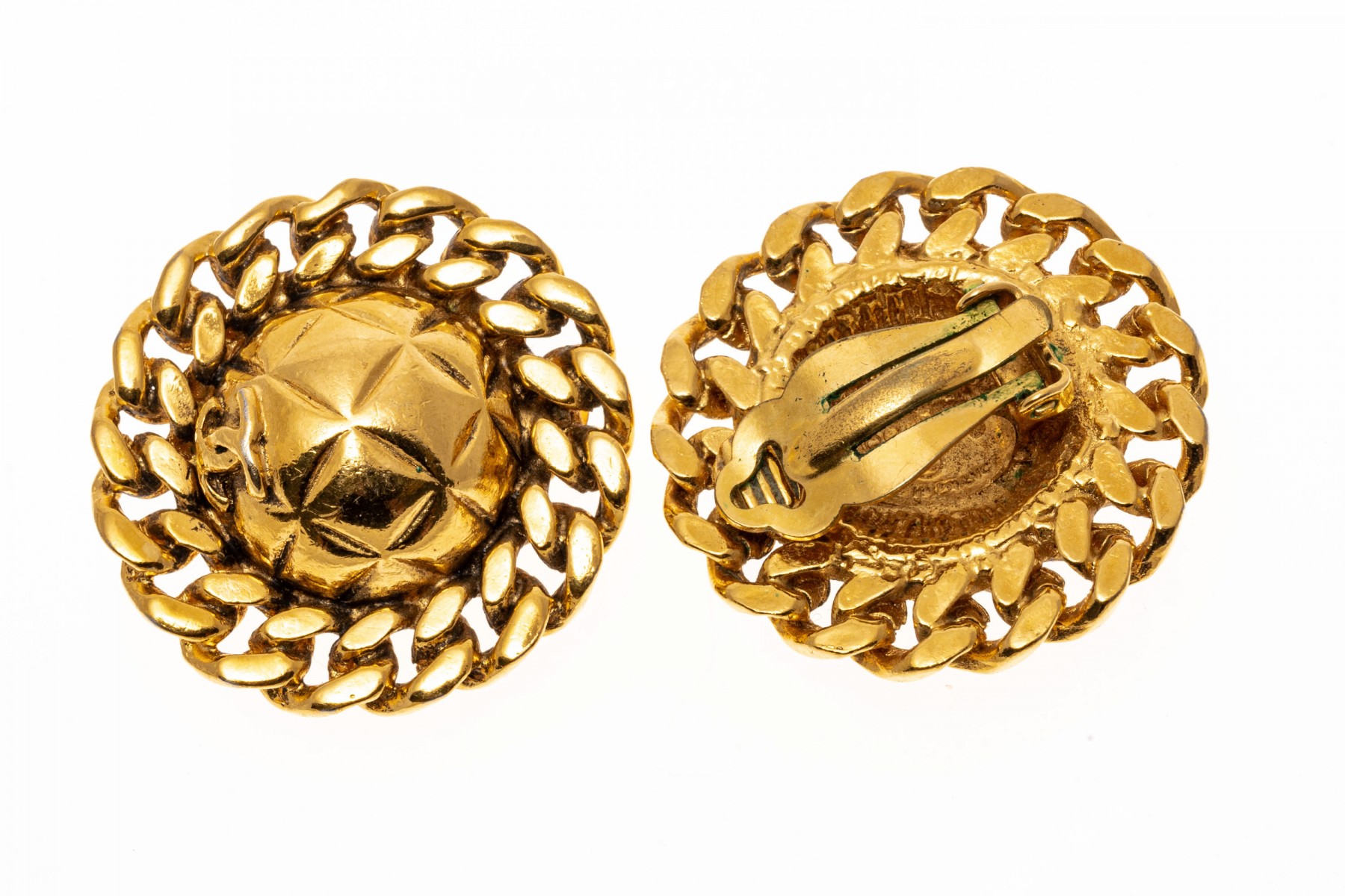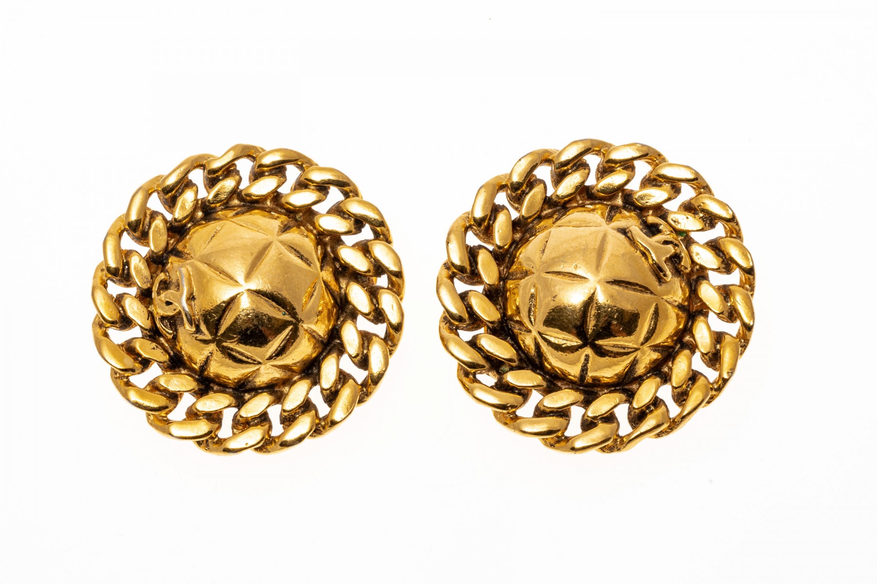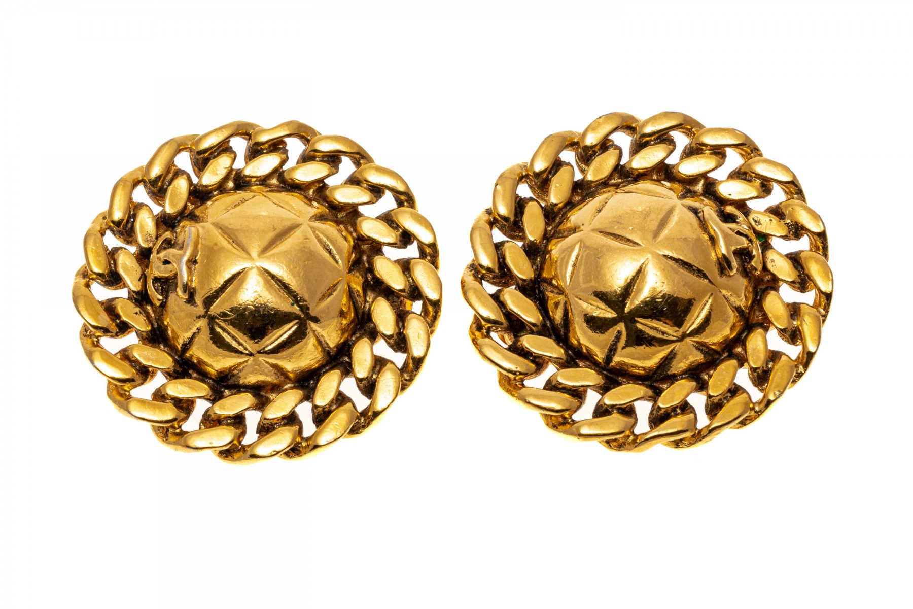 Chanel, France round quilted and chain motif gold tone costume earrings, clip on style backs