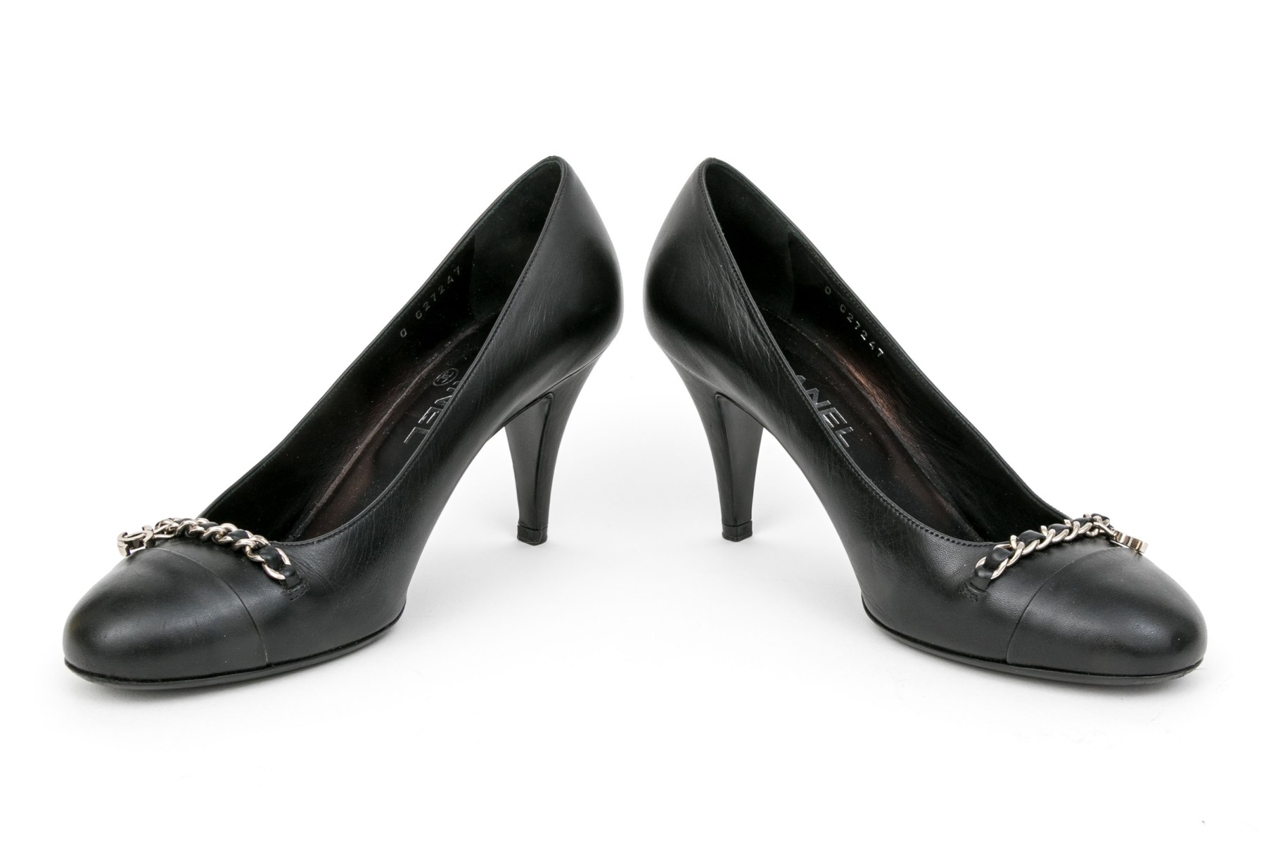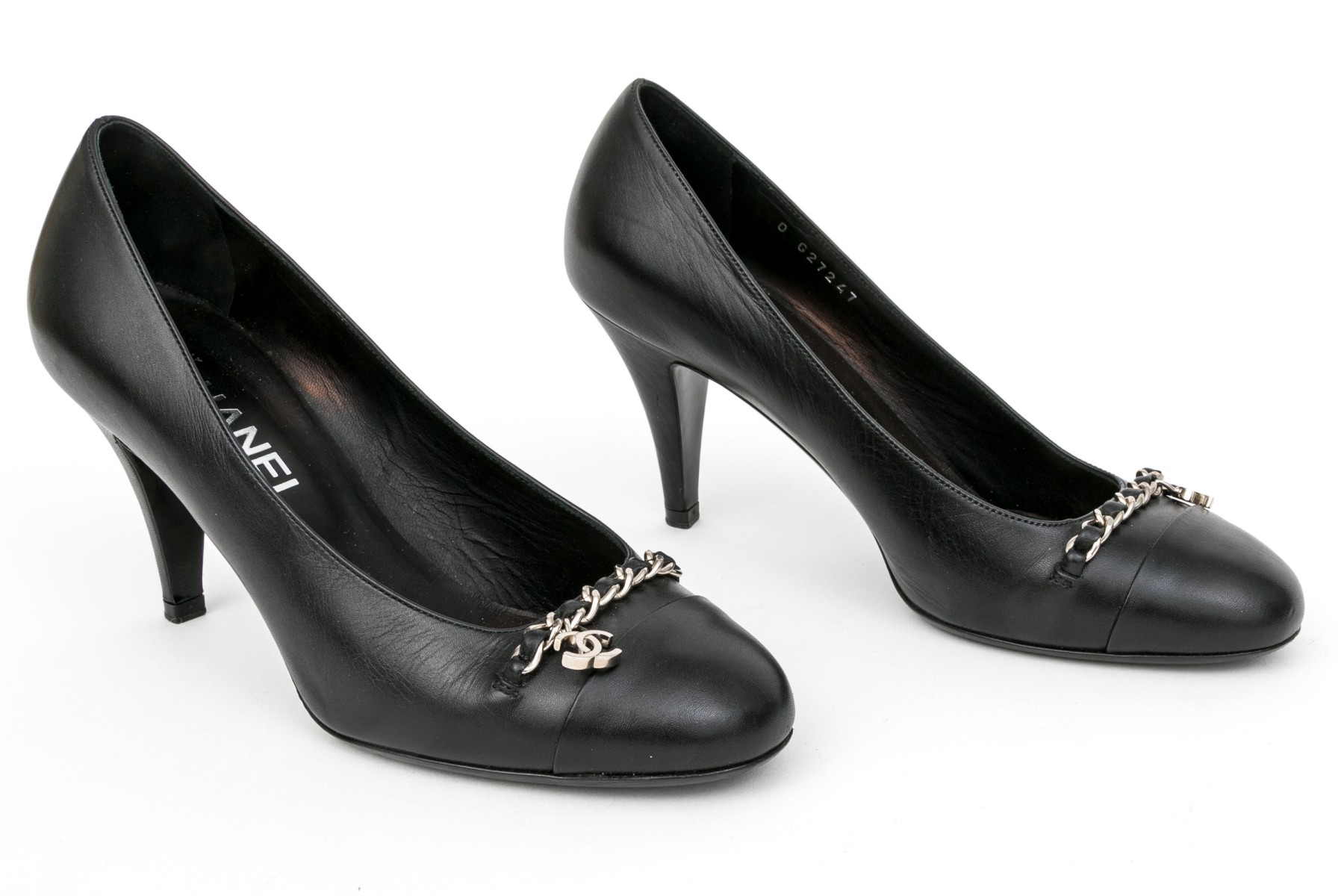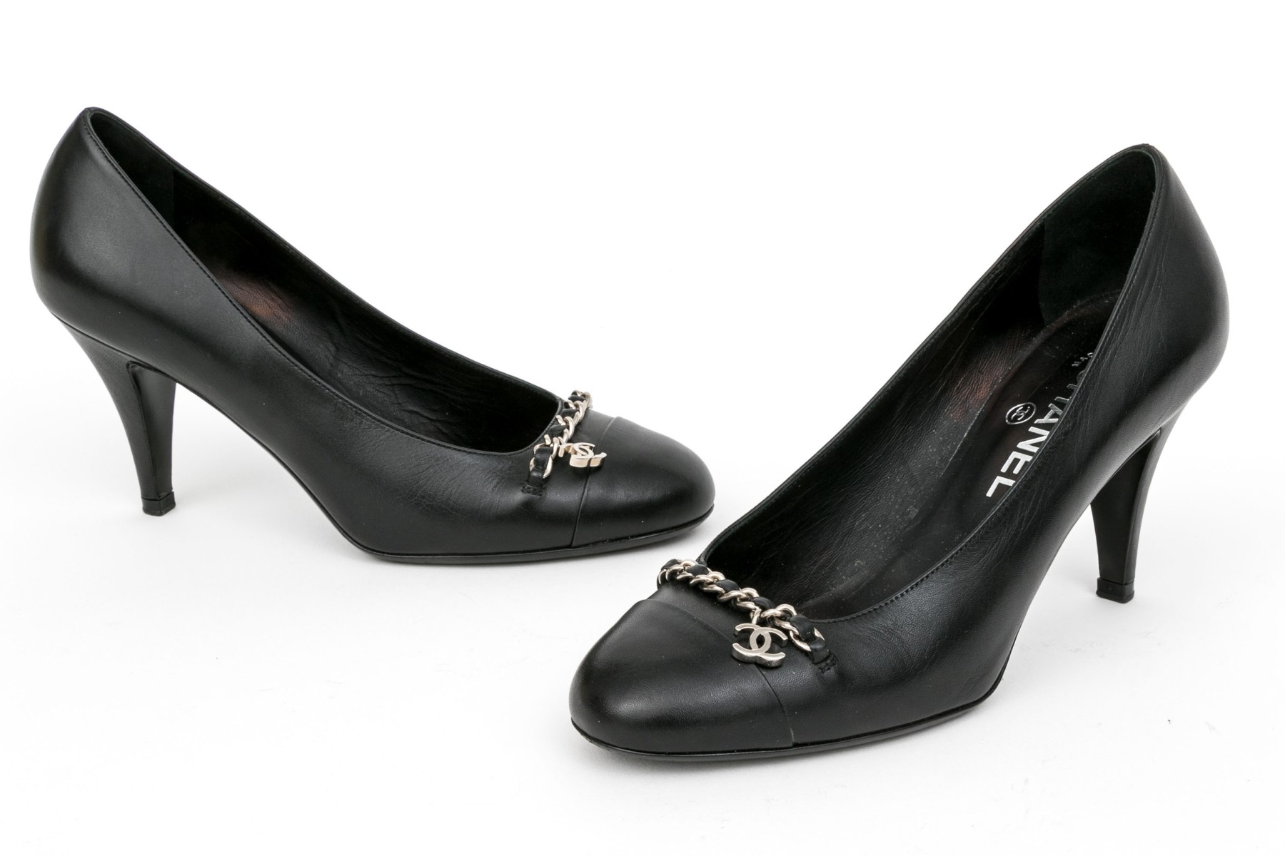 Chanel handsome black leather chain motif pumps, size 37 1/2