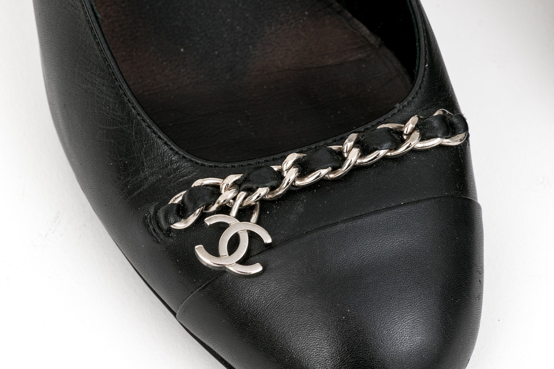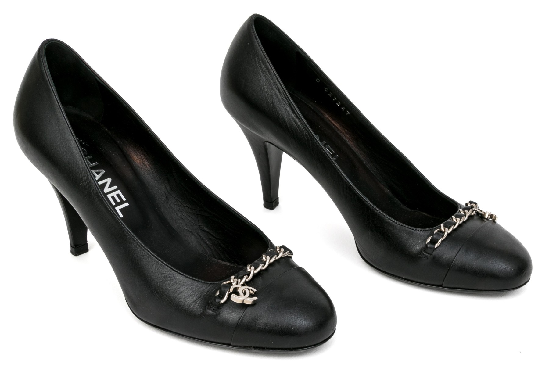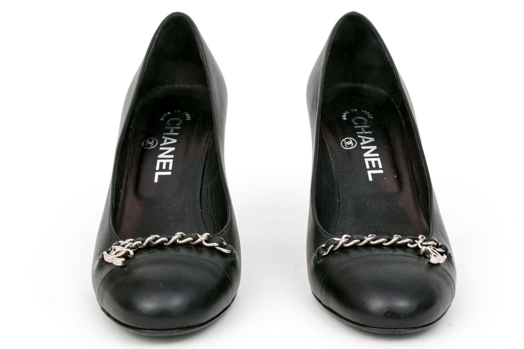 Chanel handsome black leather chain motif pumps, size 37 1/2