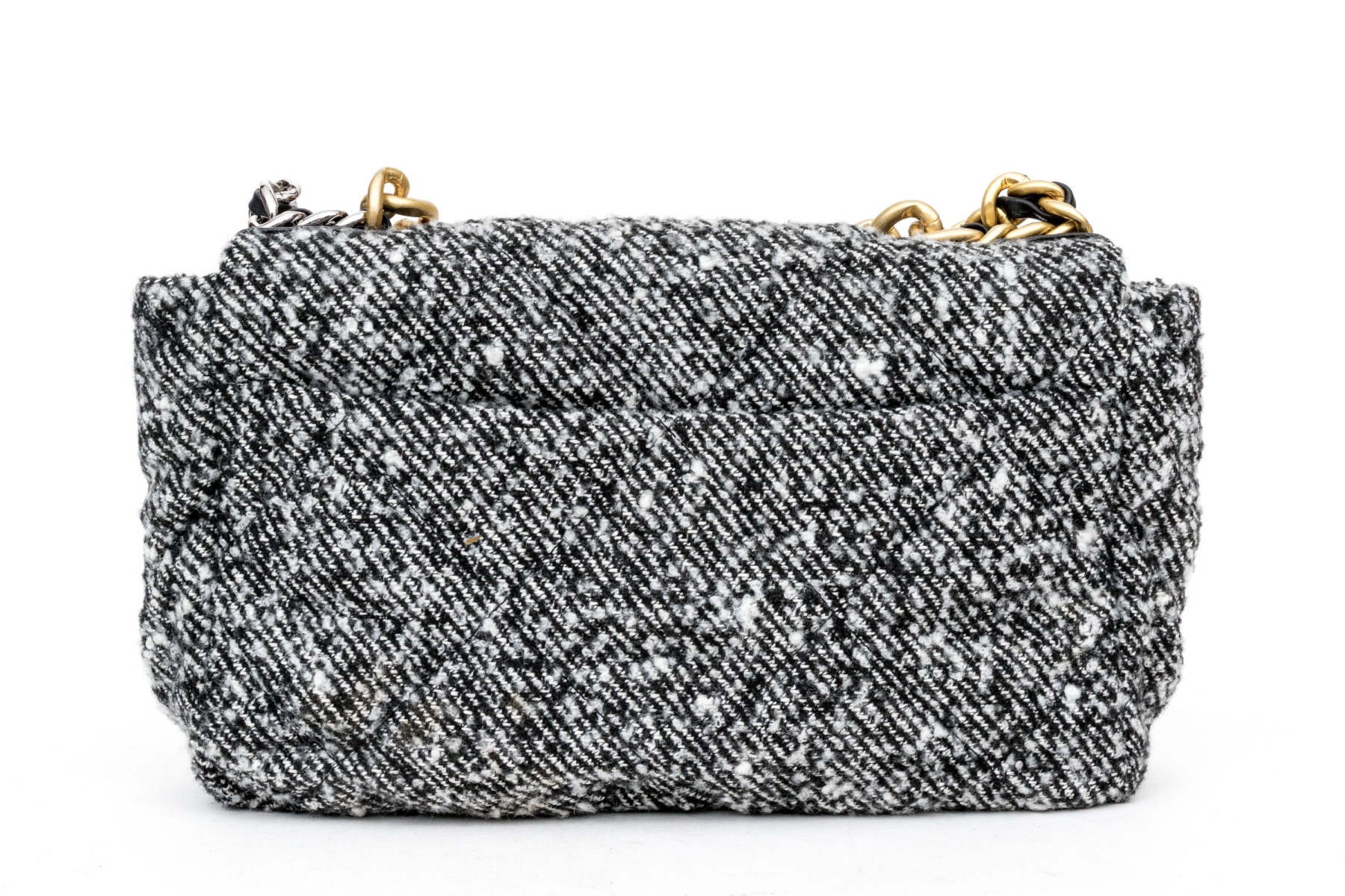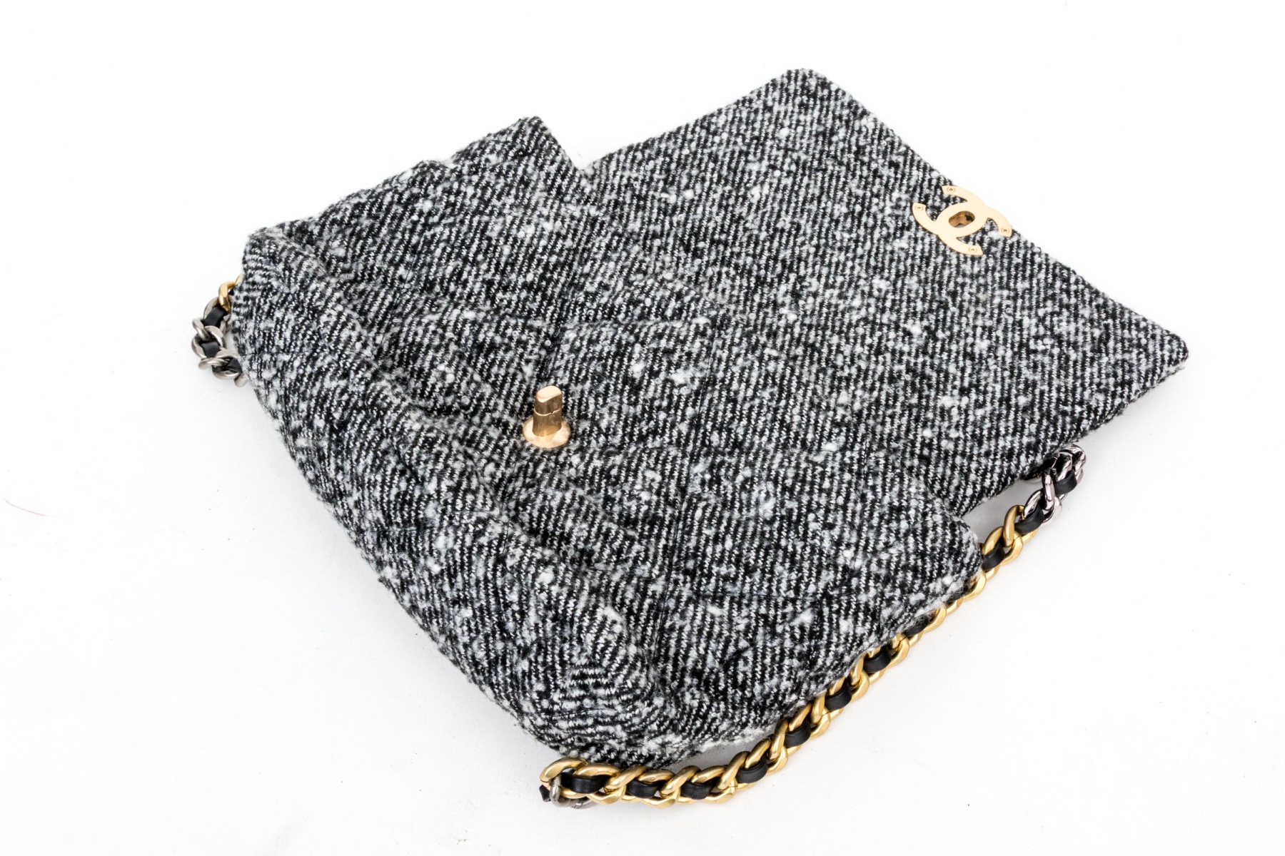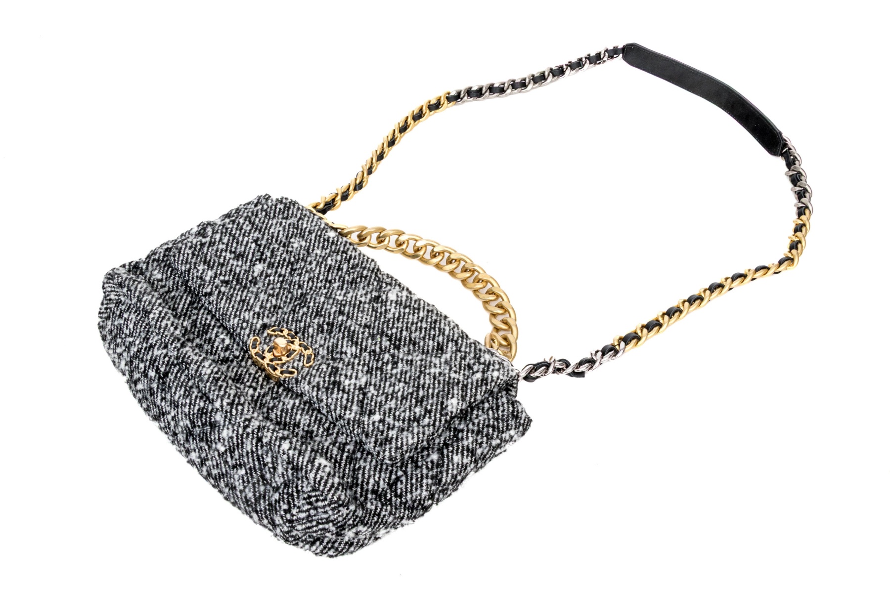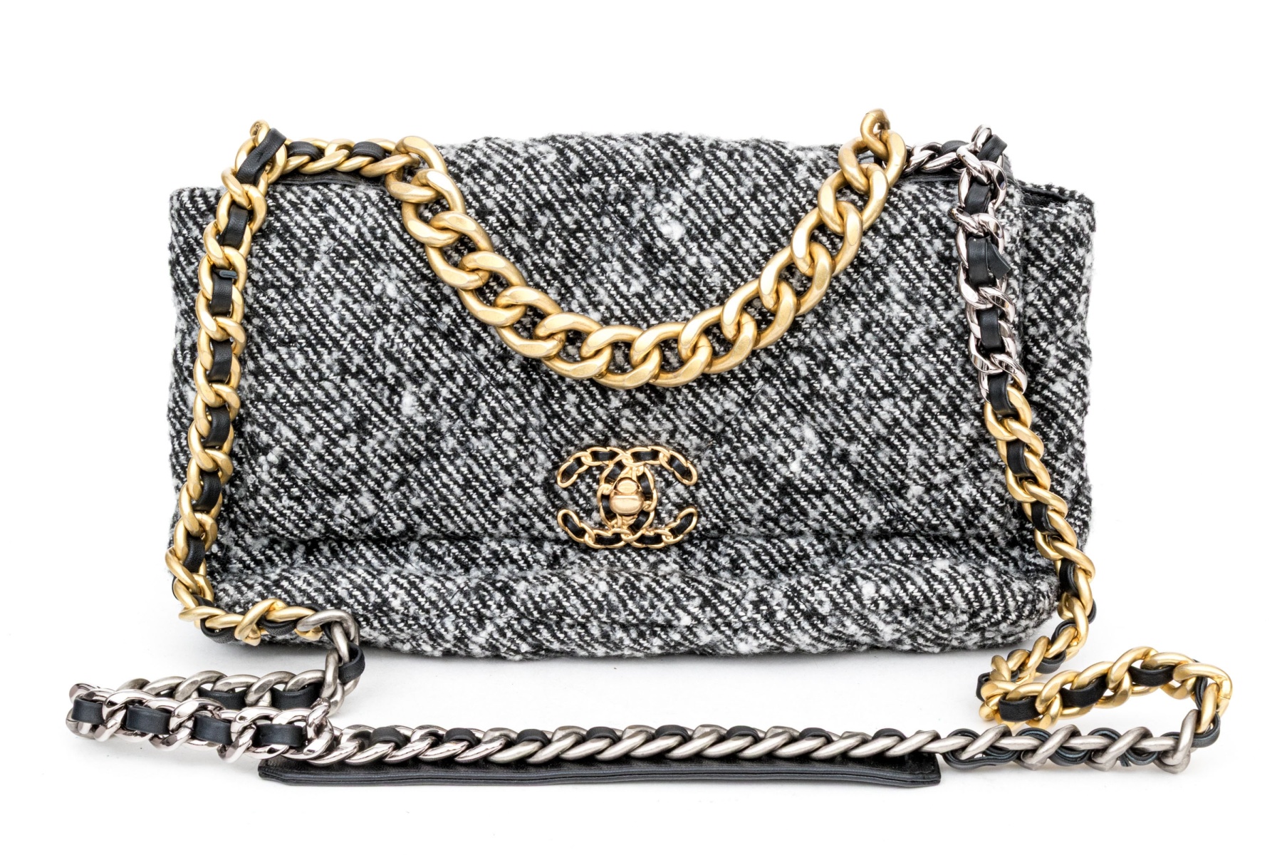 This is a Chanel 19 Flap Bag in grey tweed with a mixed-metal chain strap and a CC logo