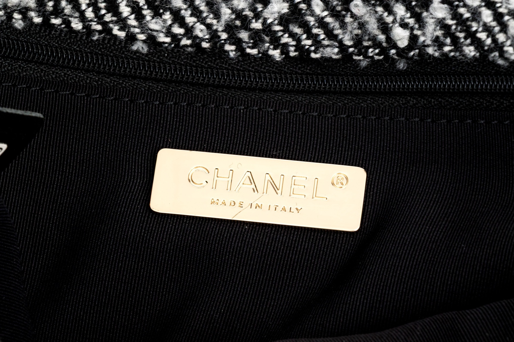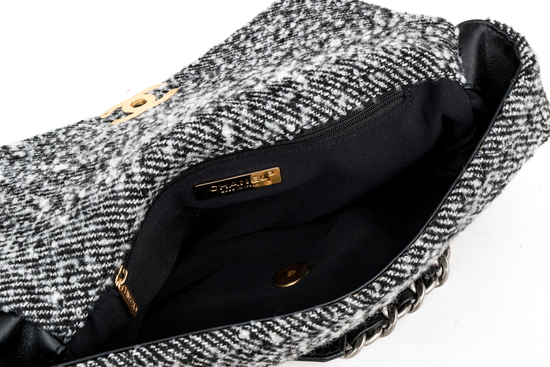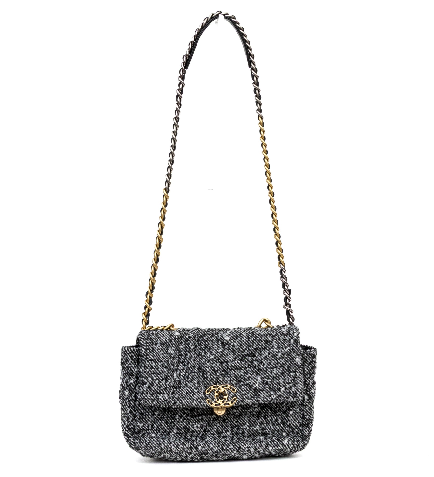 This is a Chanel 19 Flap Bag in grey tweed with a mixed-metal chain strap and a CC logo