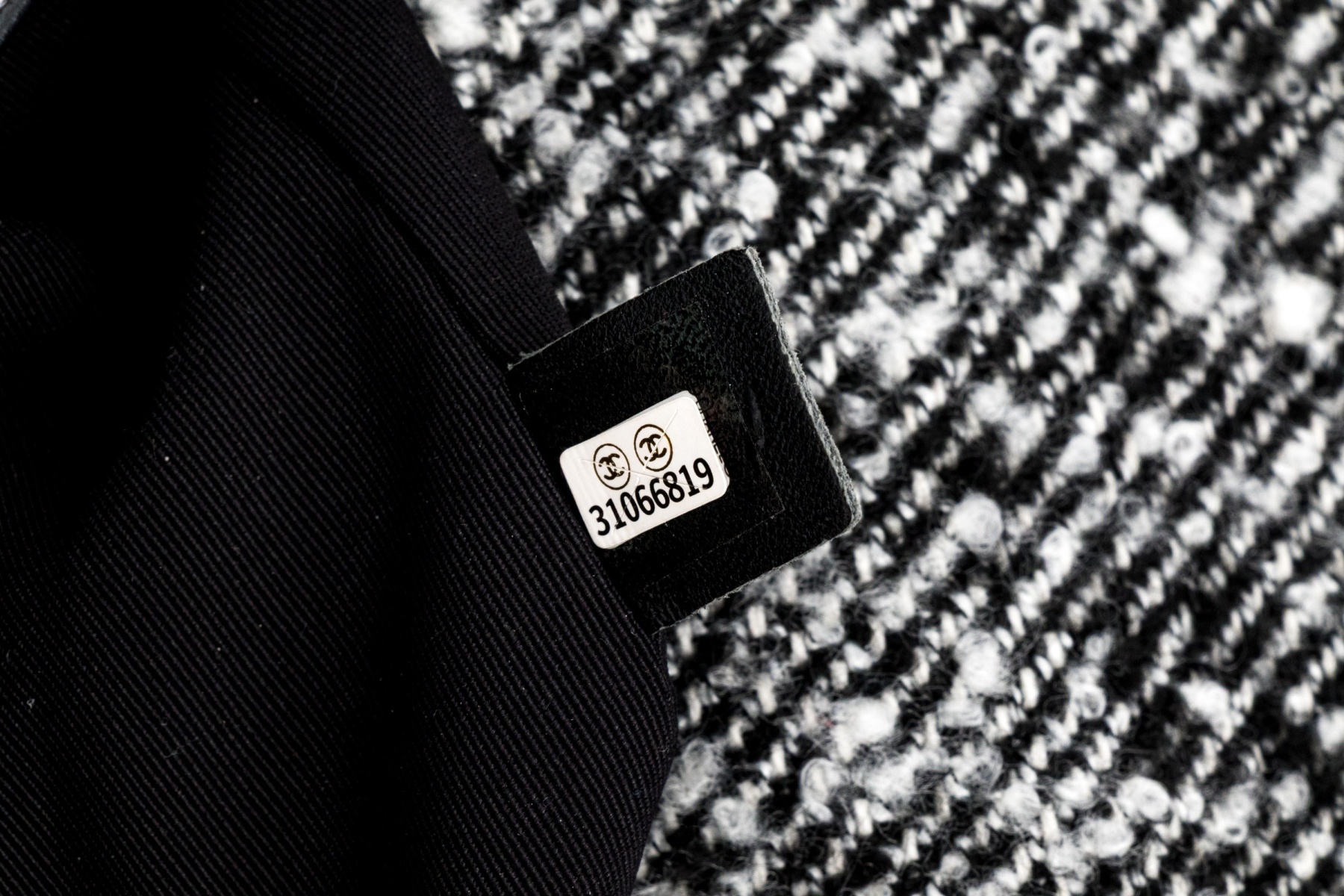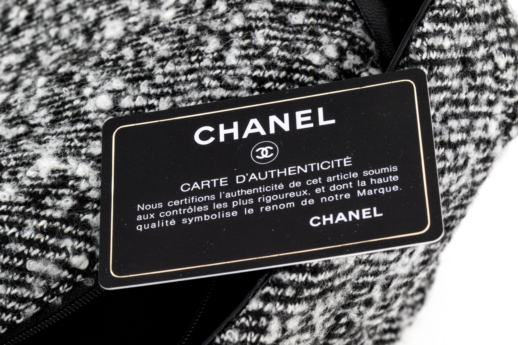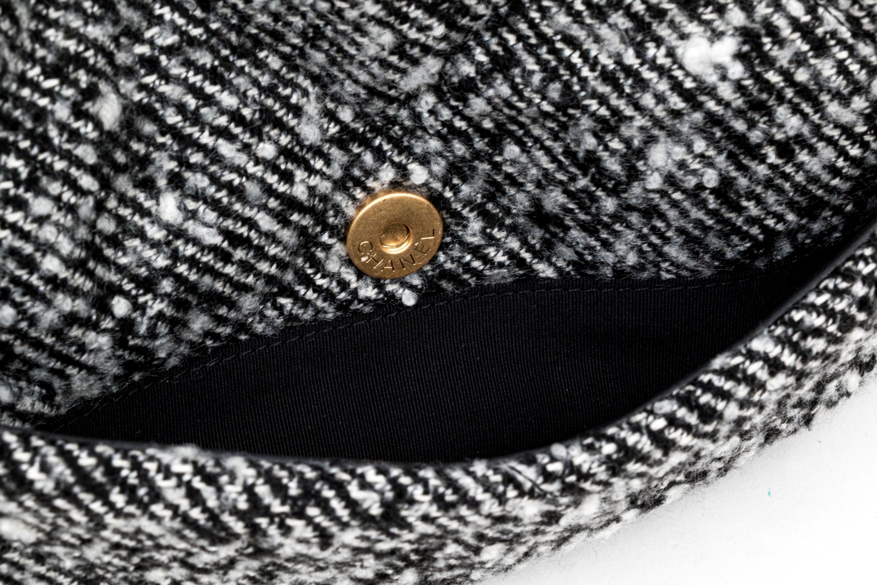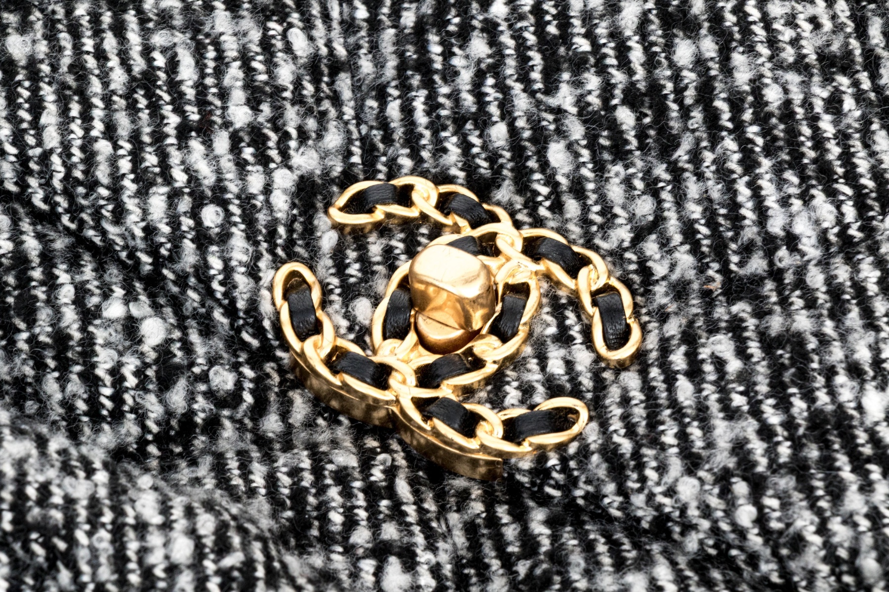This is a Chanel 19 Flap Bag in grey tweed with a mixed-metal chain strap and a CC logo