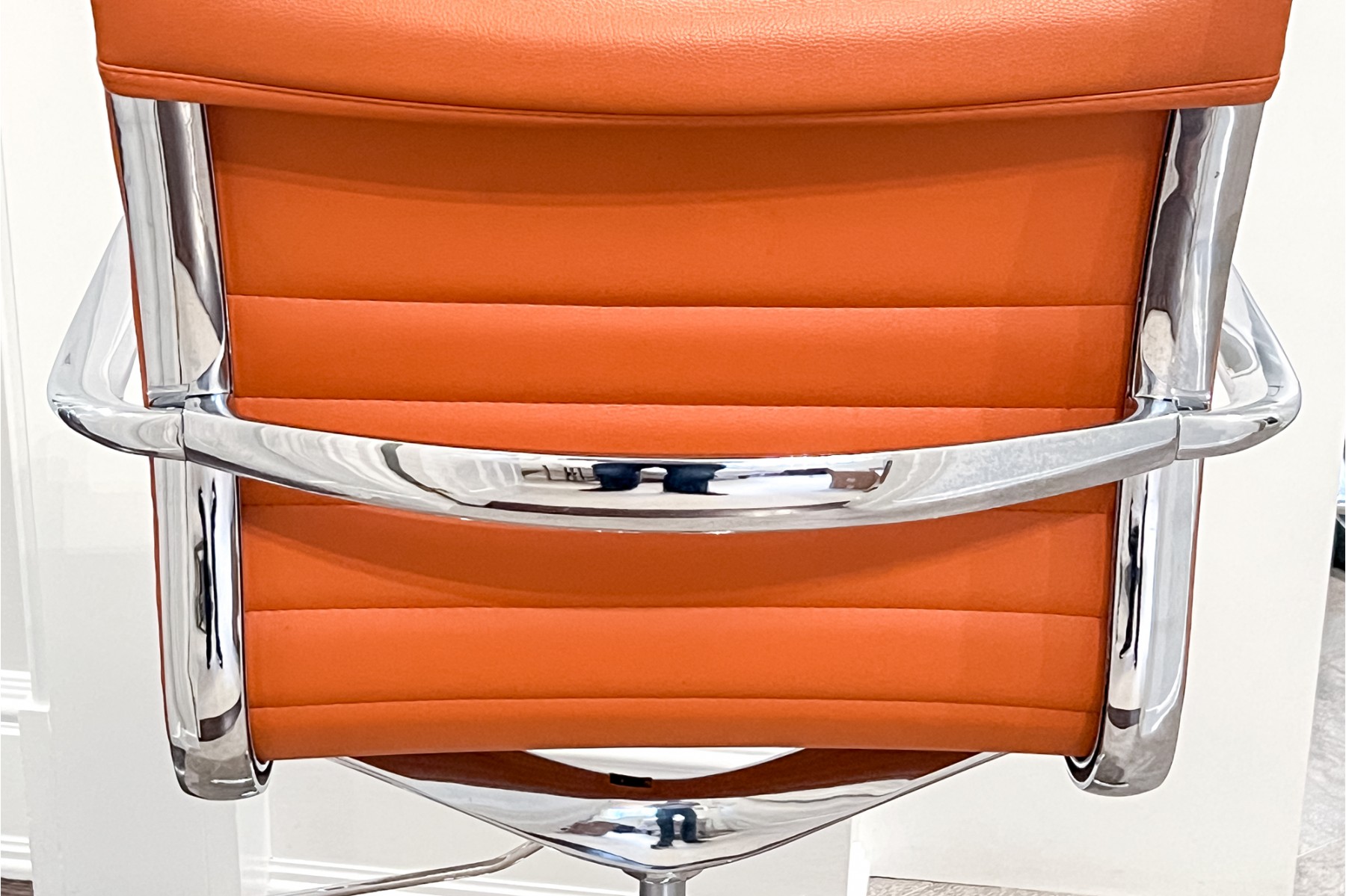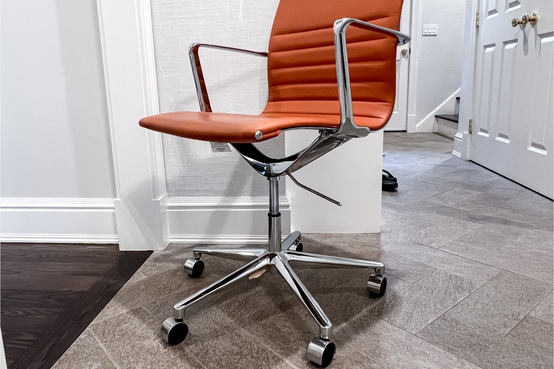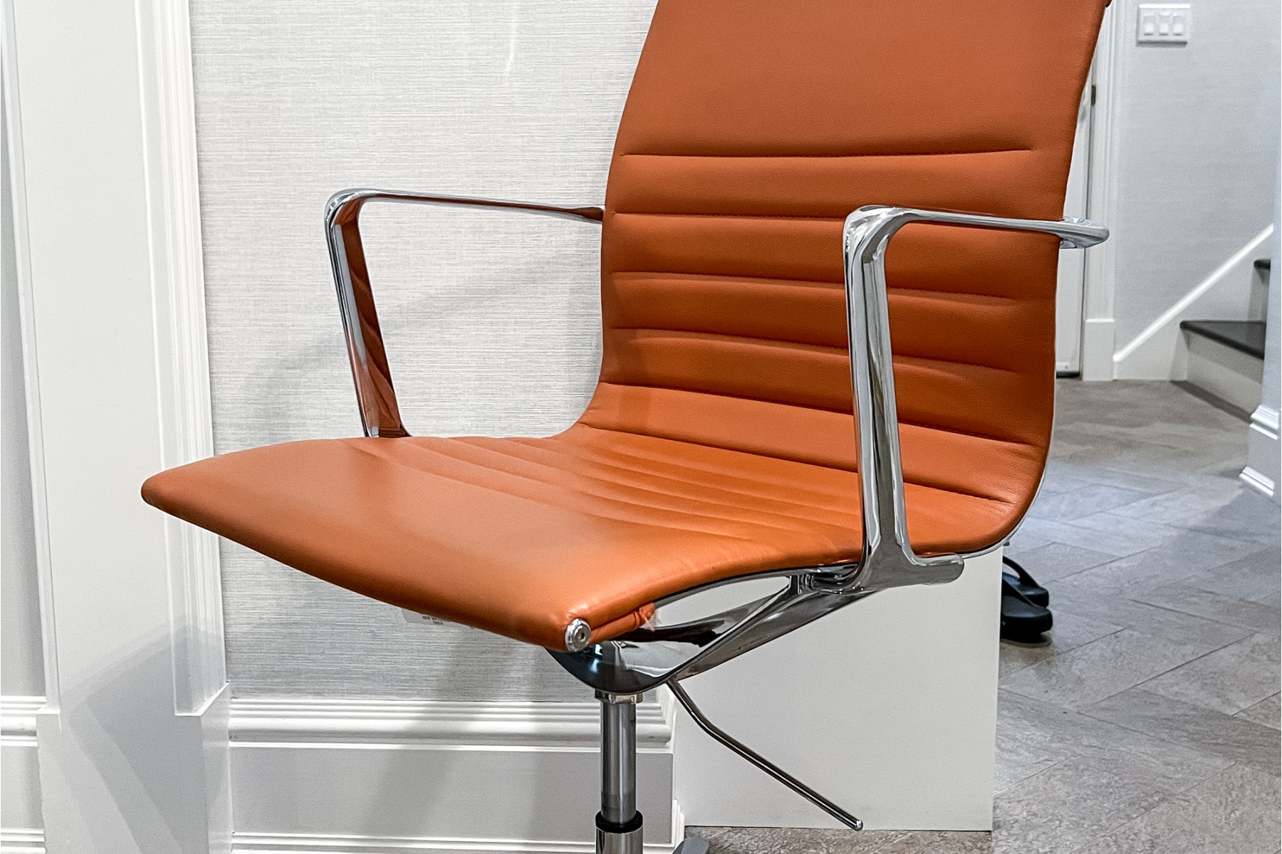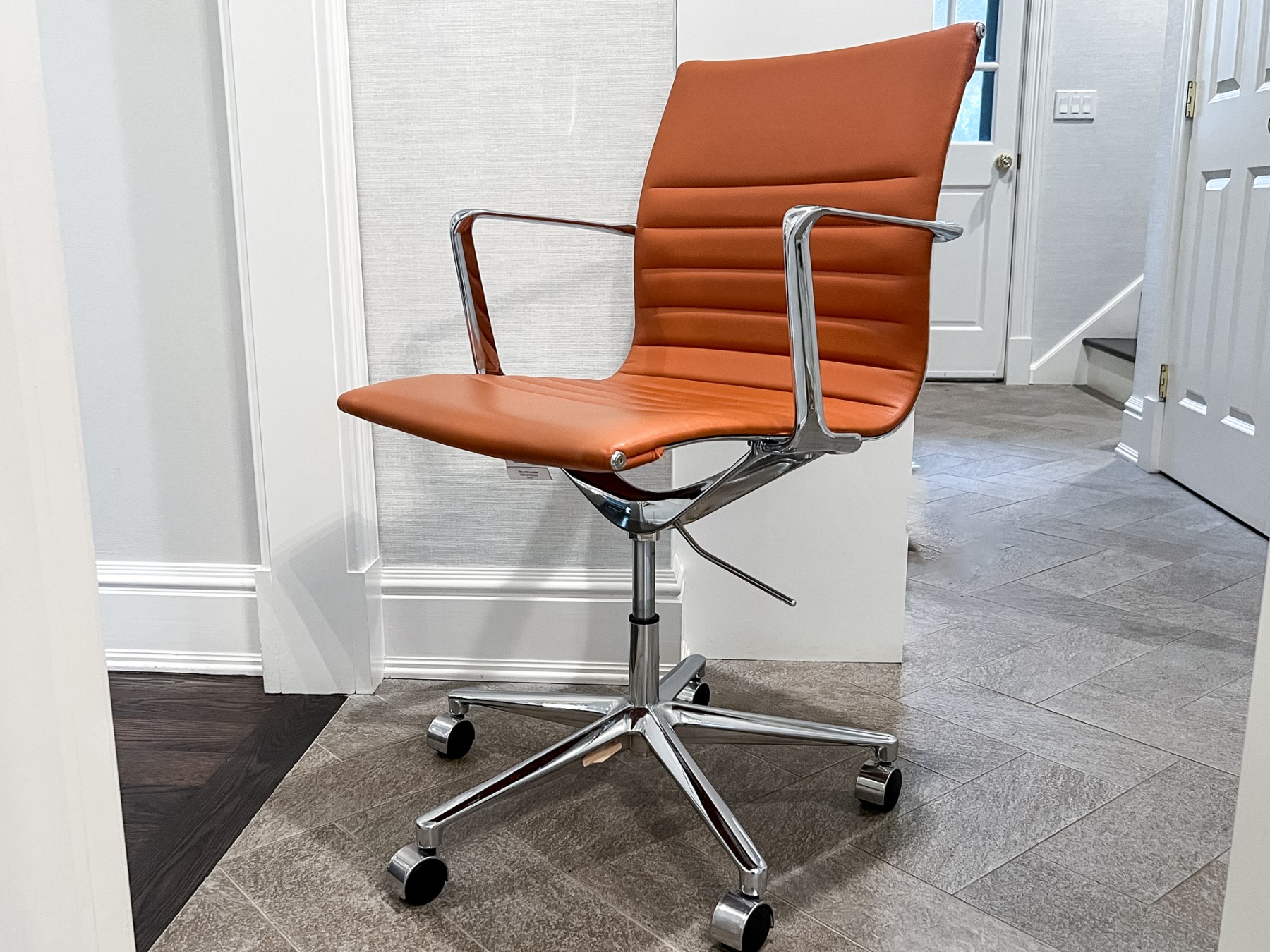 Elevate your workspace with this channeled cognac leather office chair, exuding an air of sophistication and comfort. Its adjustable steel base ensures that you can tailor it to your preferences