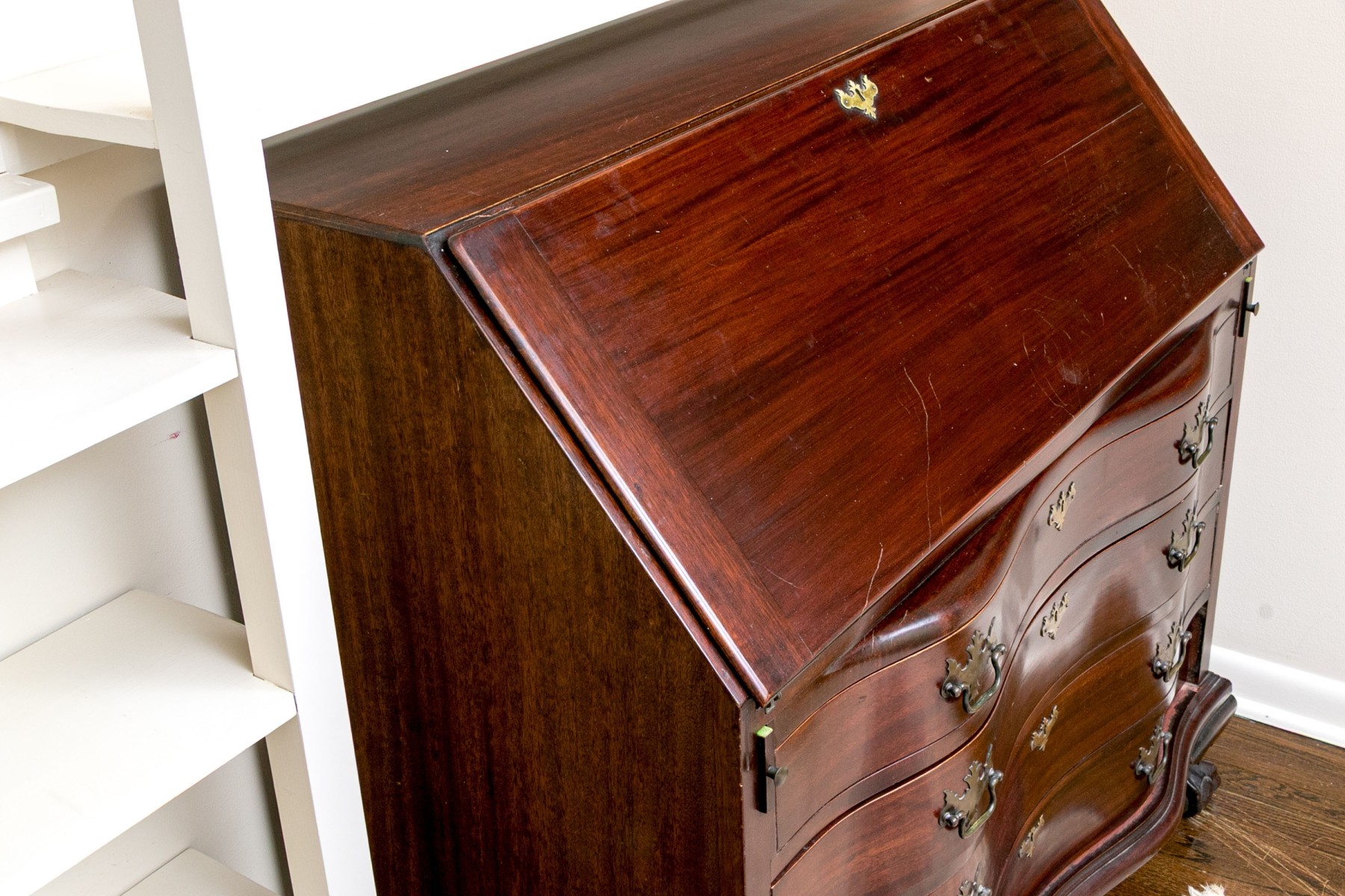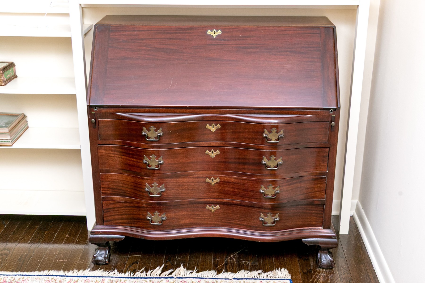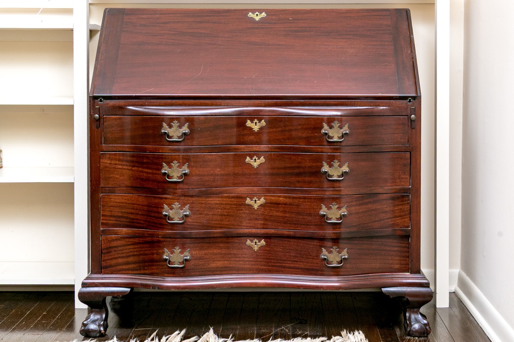 A handsome Charak Furniture Georgian style secretary in a rich dark brown finish. The chest stands upon carved front ball and claw feet with four drawers all with brass escutcheons and two batwing brass drawer pulls. The drawers are serpentine form with the top drawer having two pull slides to support the tilt top desk. Interior with numerous open compartments and diminutive drawers. Stamped Charak Furniture, Boston, Mass. to the interior of the upper drawer below the drop leaf.