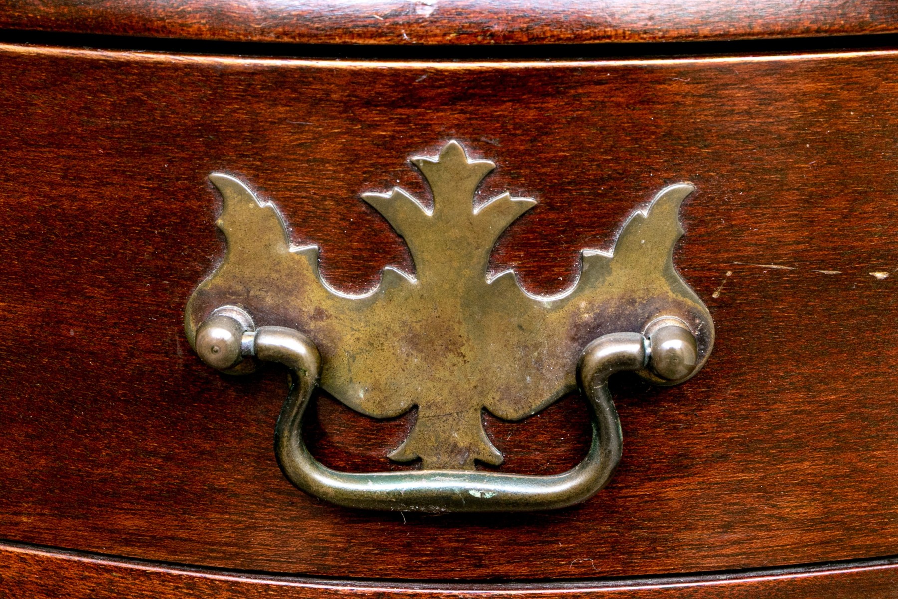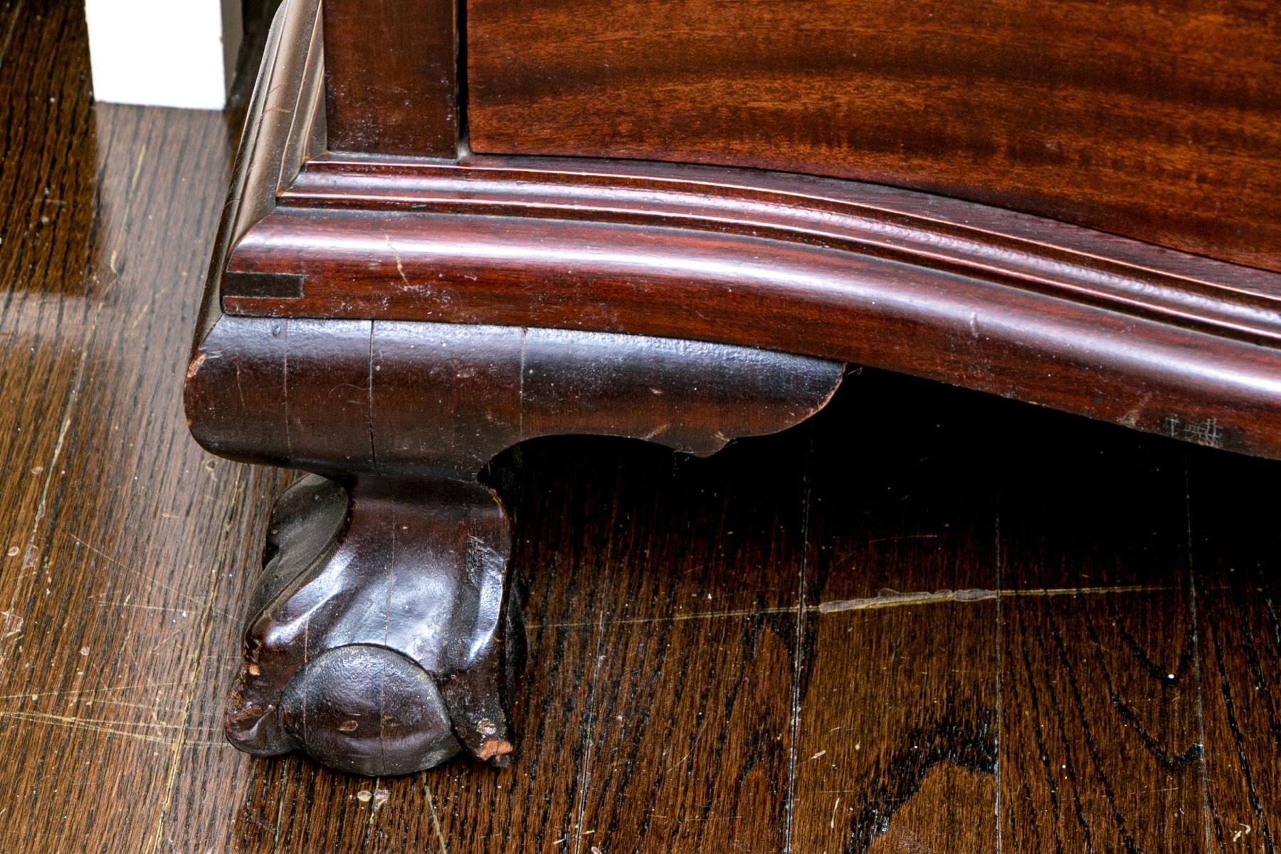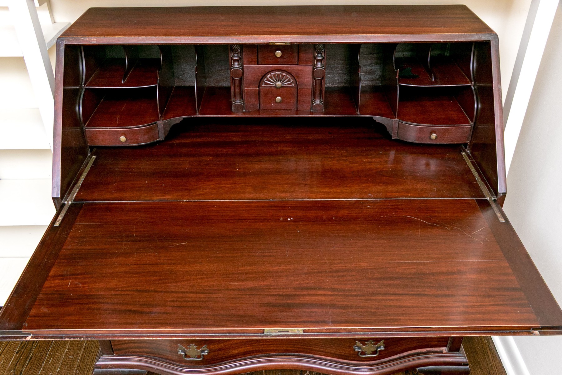 A handsome Charak Furniture Georgian style secretary in a rich dark brown finish. The chest stands upon carved front ball and claw feet with four drawers all with brass escutcheons and two batwing brass drawer pulls. The drawers are serpentine form with the top drawer having two pull slides to support the tilt top desk. Interior with numerous open compartments and diminutive drawers. Stamped Charak Furniture, Boston, Mass. to the interior of the upper drawer below the drop leaf.