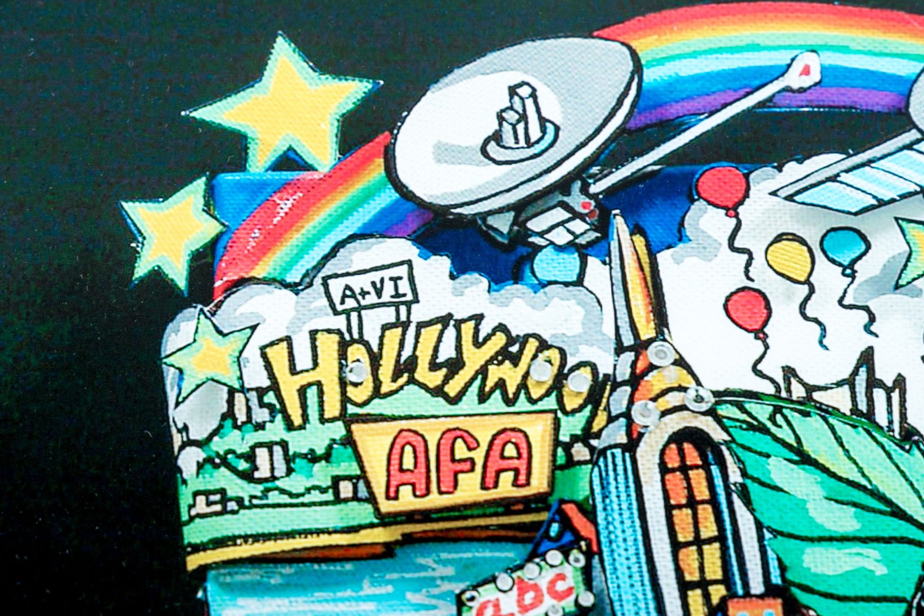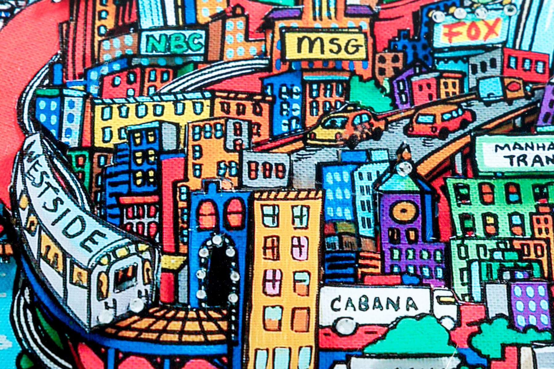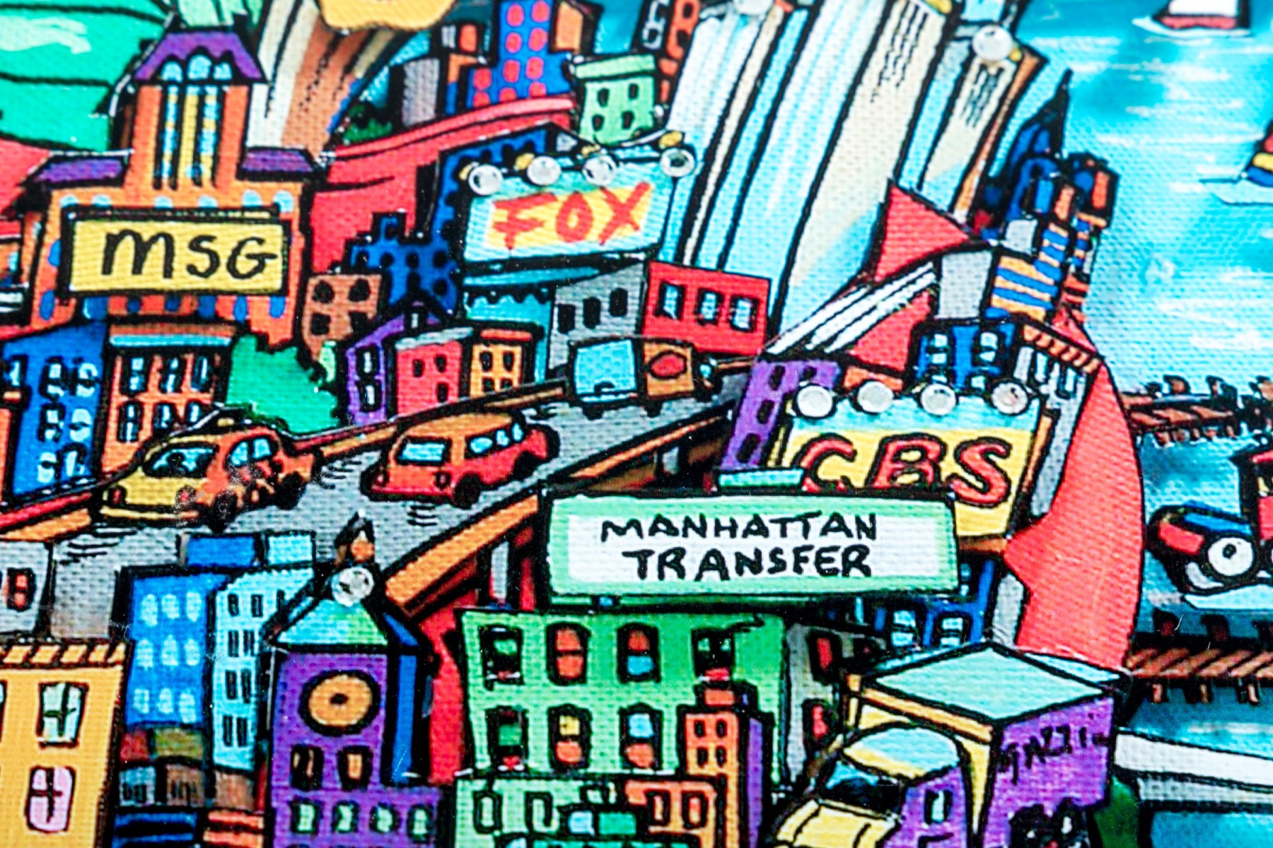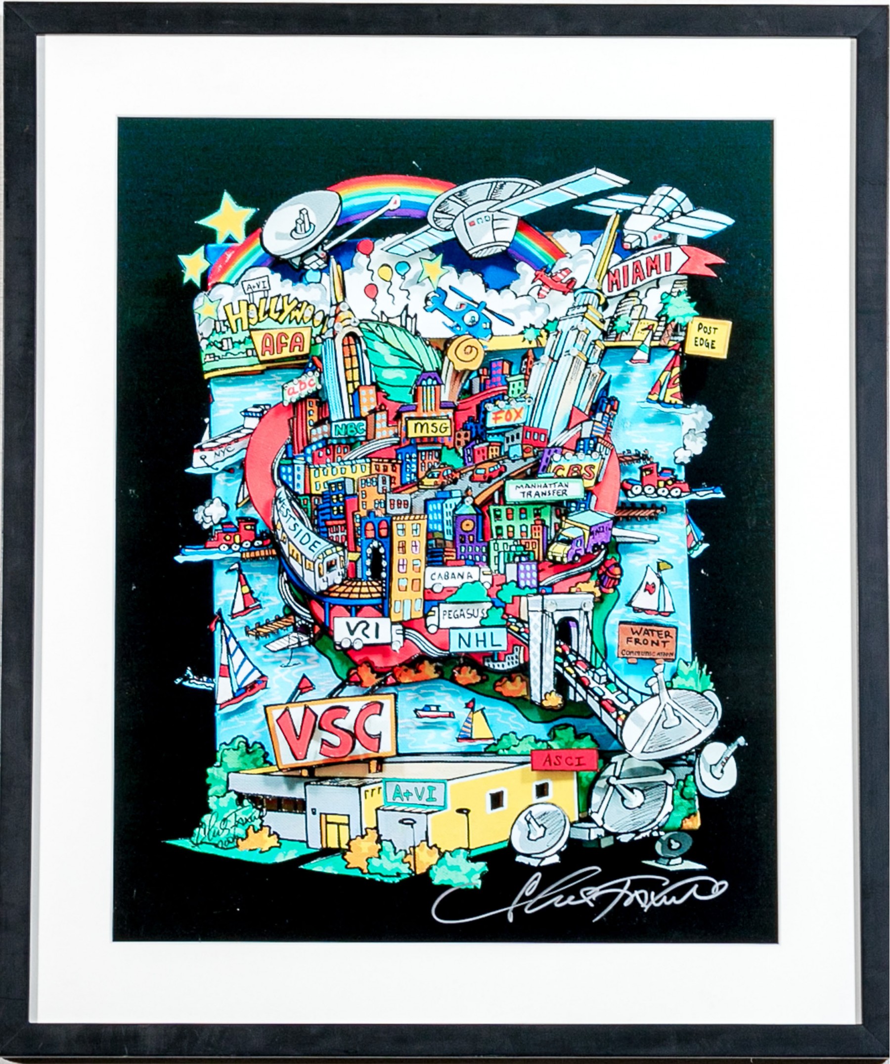 Signed lower right. A busy colorful composition featuring buildings in Manhattan and the Brooklyn Bridge with Hollywood and Miami at the top. Presented in a black frame with glass.