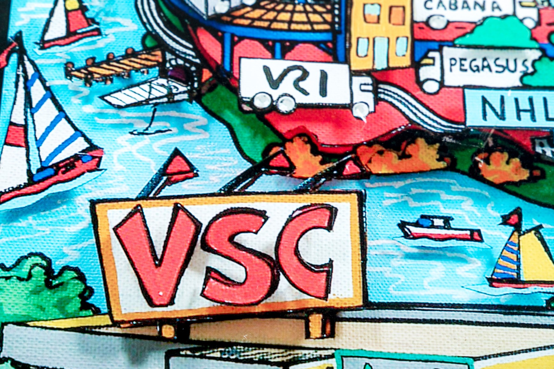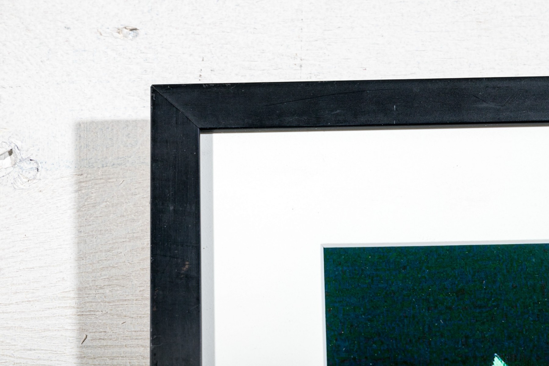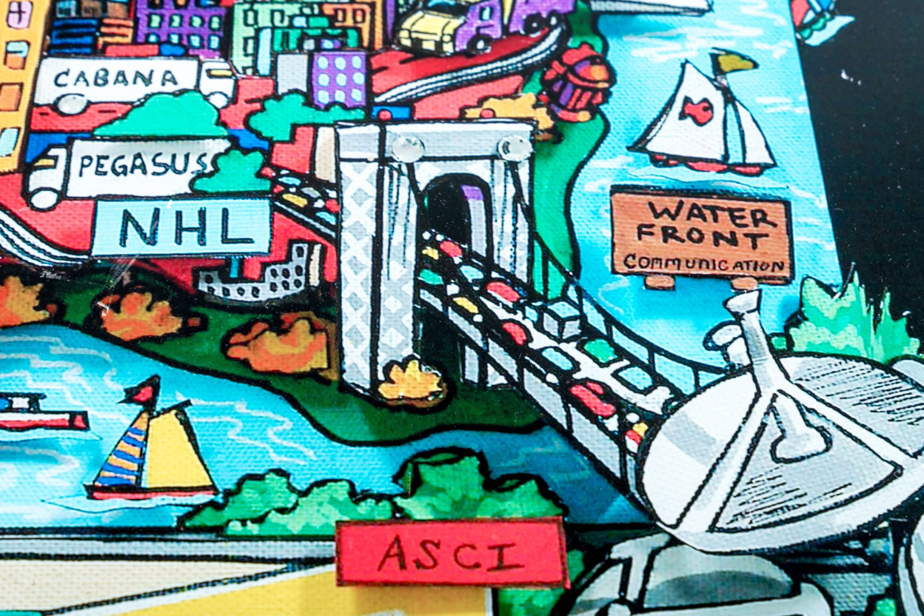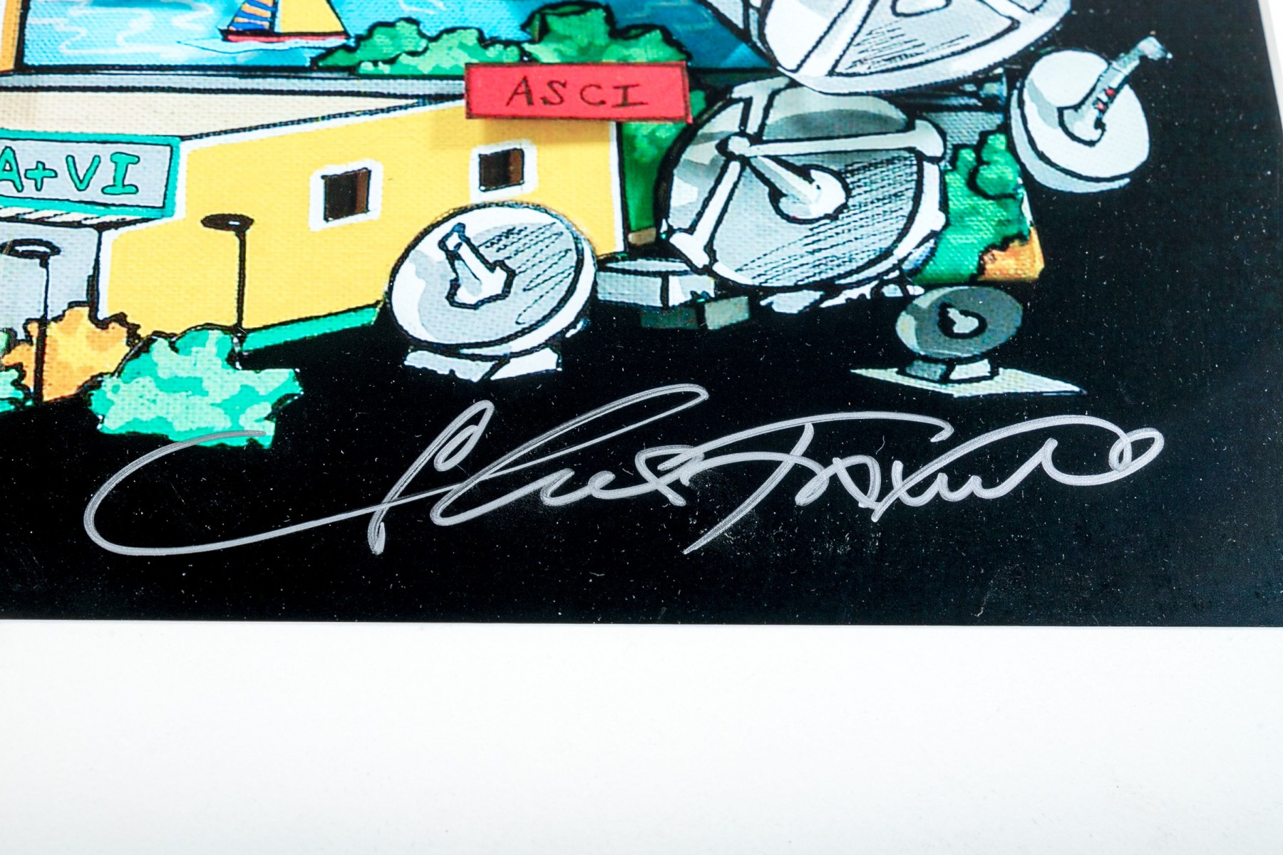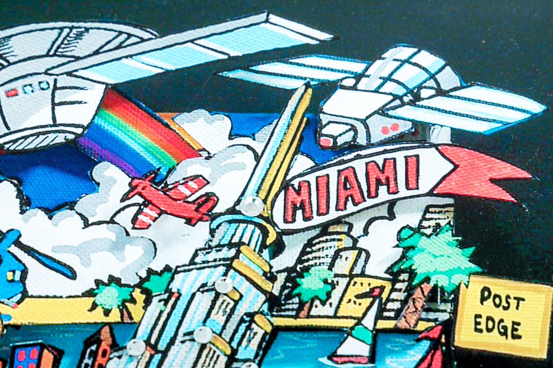 Signed lower right. A busy colorful composition featuring buildings in Manhattan and the Brooklyn Bridge with Hollywood and Miami at the top. Presented in a black frame with glass.