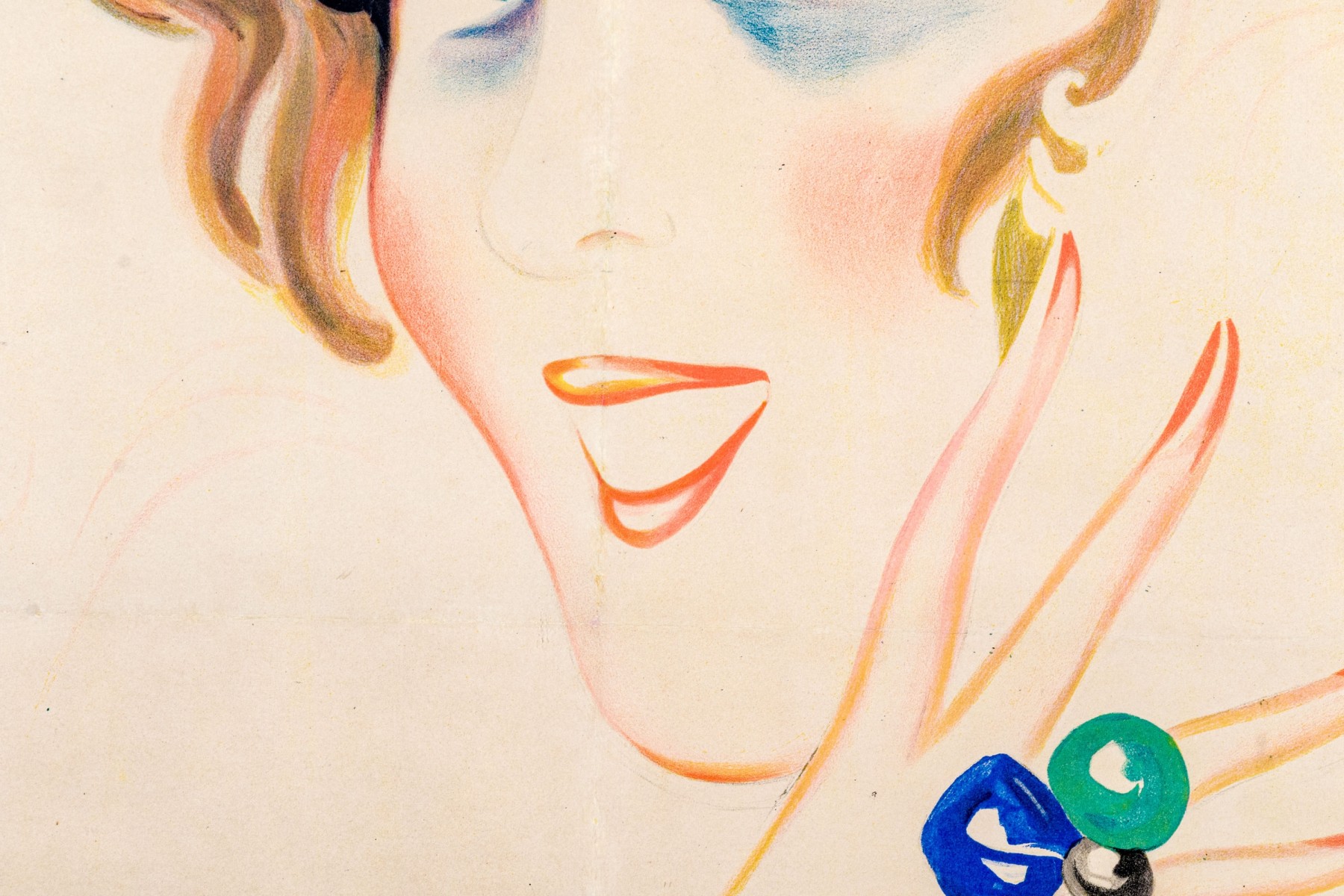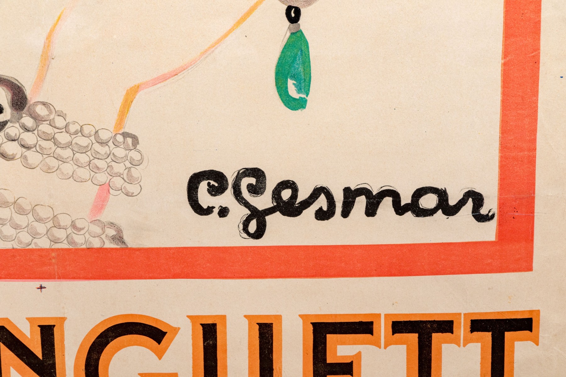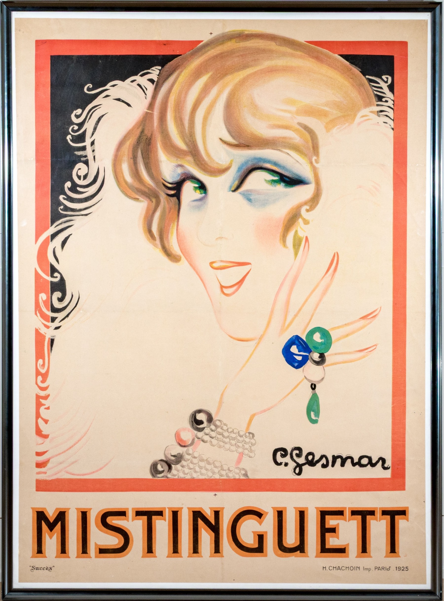 Charles Gesmar (French, 1900-1928) poster print depicting the titled actress Jeanne Florentine Bourgeois (French, 1873-1956) wearing a lush white feather boa while showing off pearl bracelets and a blue and green ring.