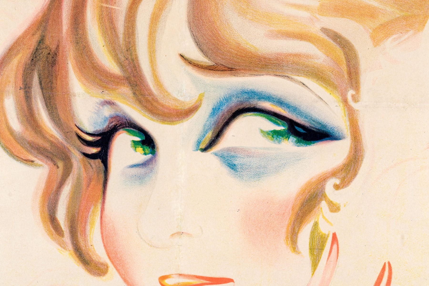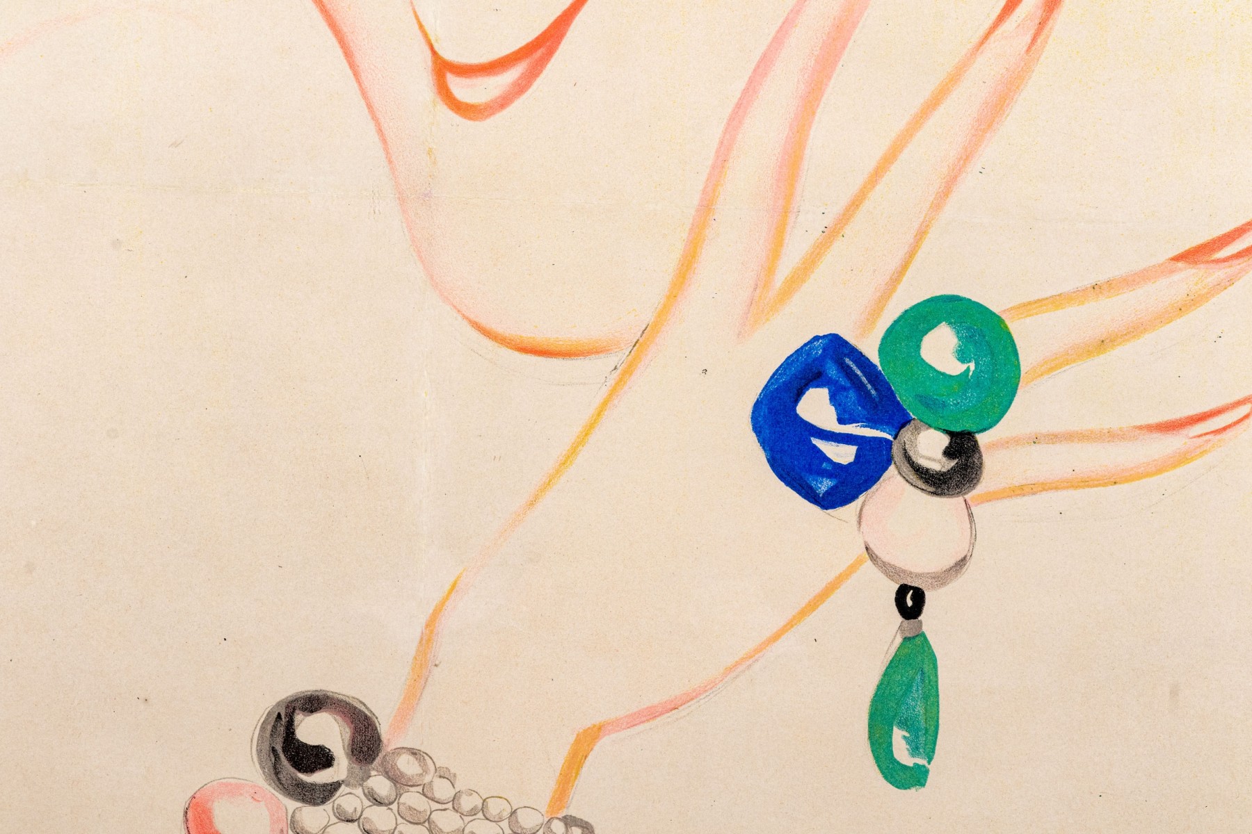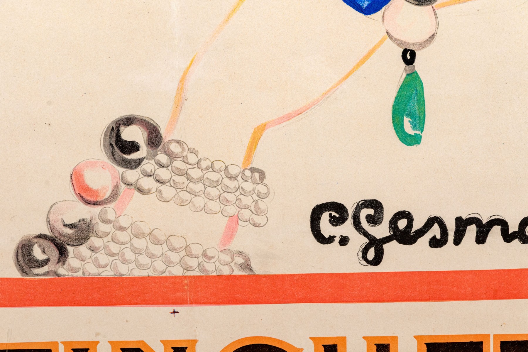 Charles Gesmar (French, 1900-1928) poster print depicting the titled actress Jeanne Florentine Bourgeois (French, 1873-1956) wearing a lush white feather boa while showing off pearl bracelets and a blue and green ring.