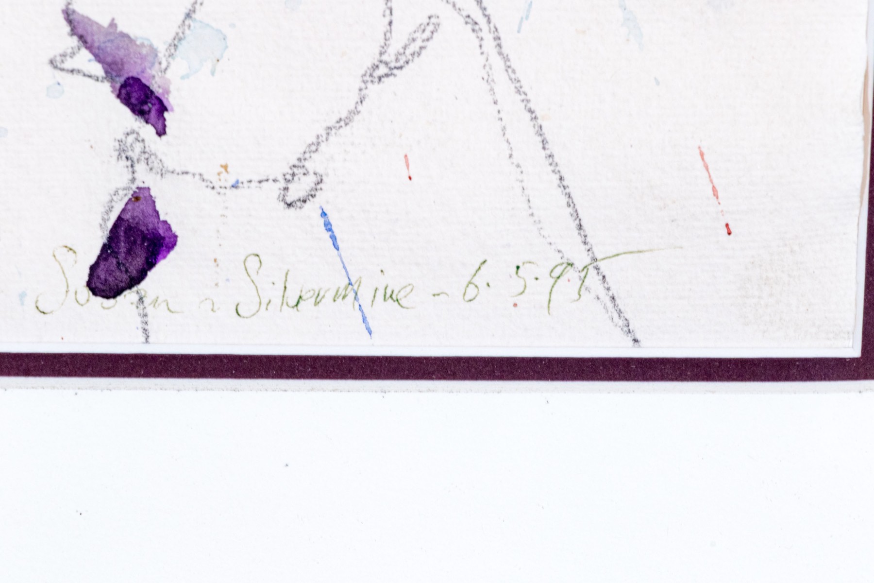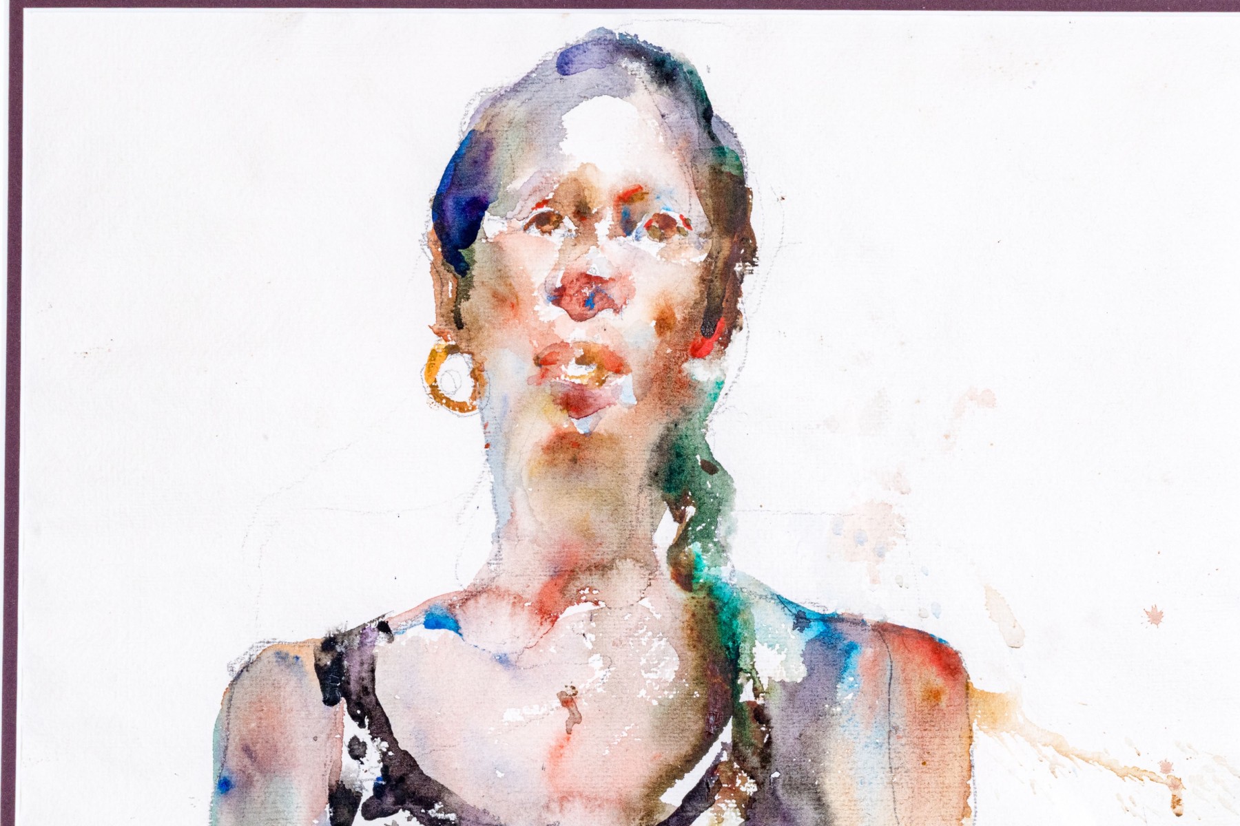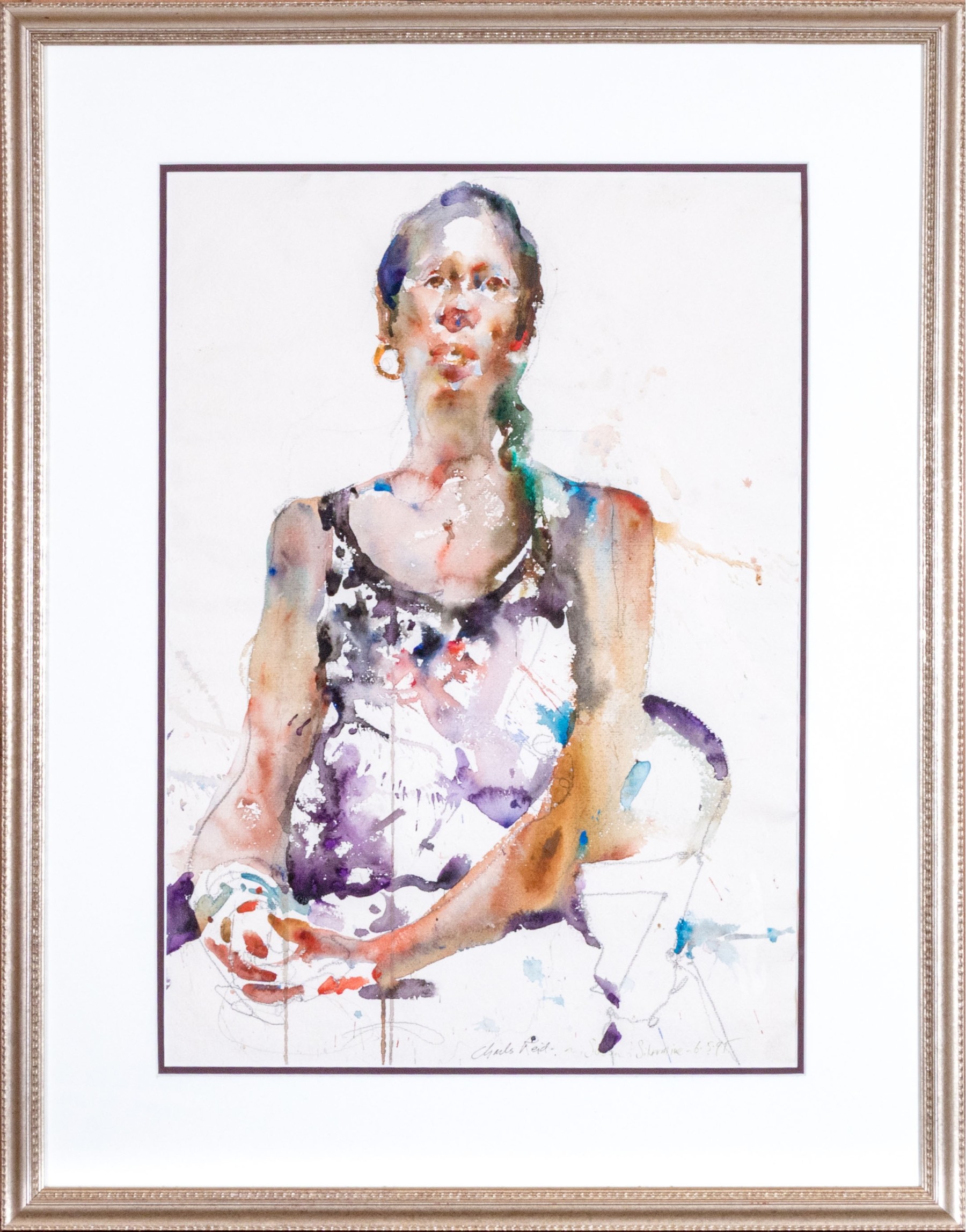 Charles Reid (American, 1937-2019) watercolor painting on paper portrait of Elizabeth Meissner Gaynor (American [Southport, CT], 1928-2024) seated while wearing a purple tank top. Beautifully rendered with great expressionist detail. Signed lower center and marked Susan Silvermine 6.5.95 lower right.