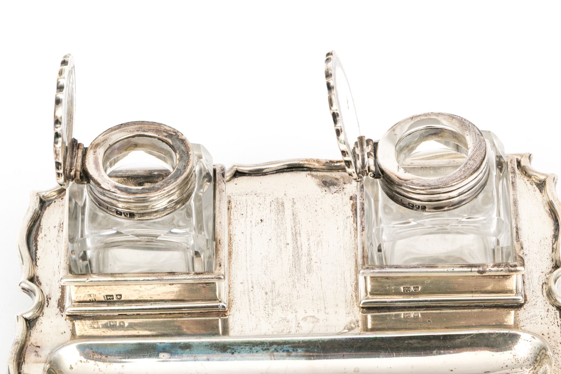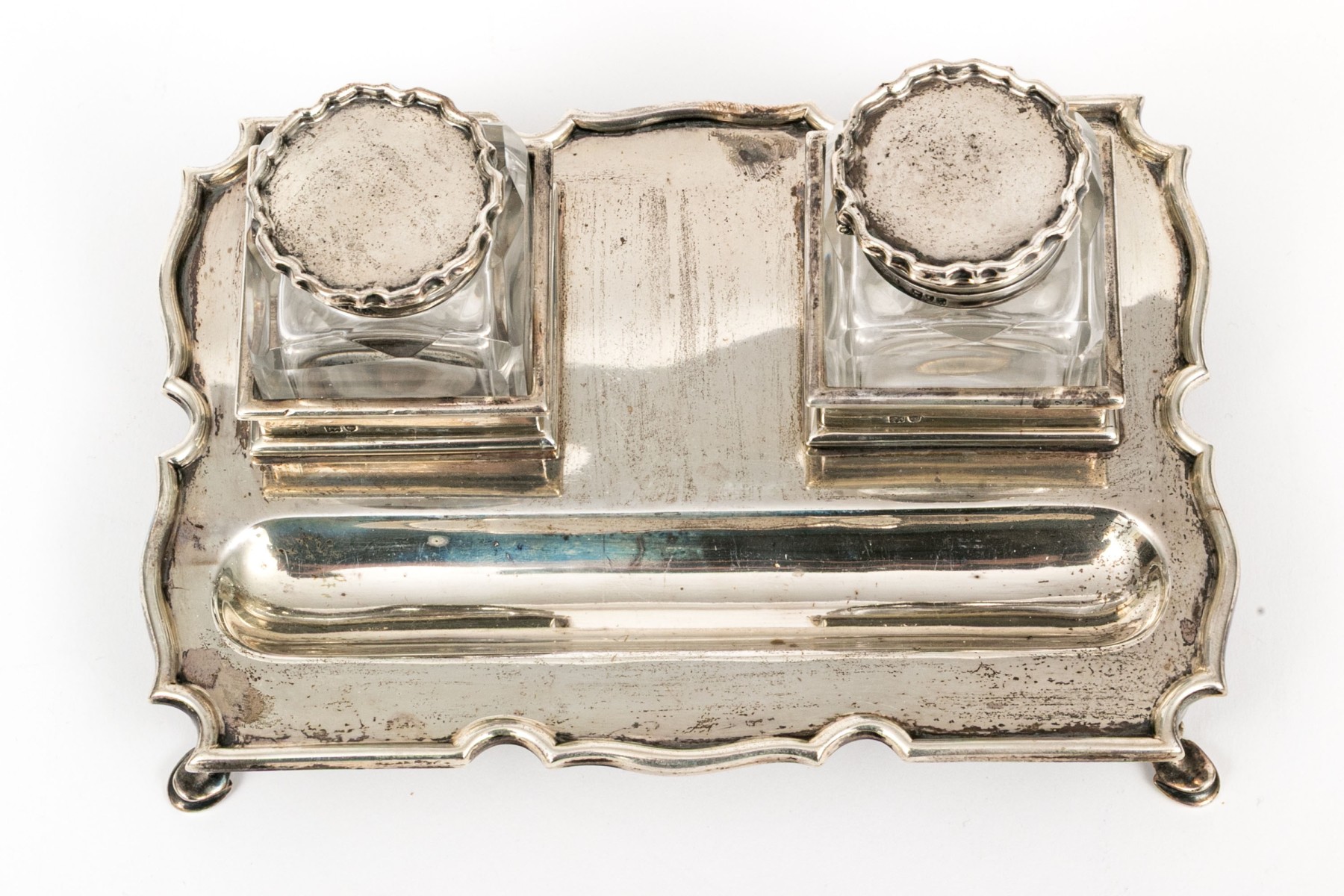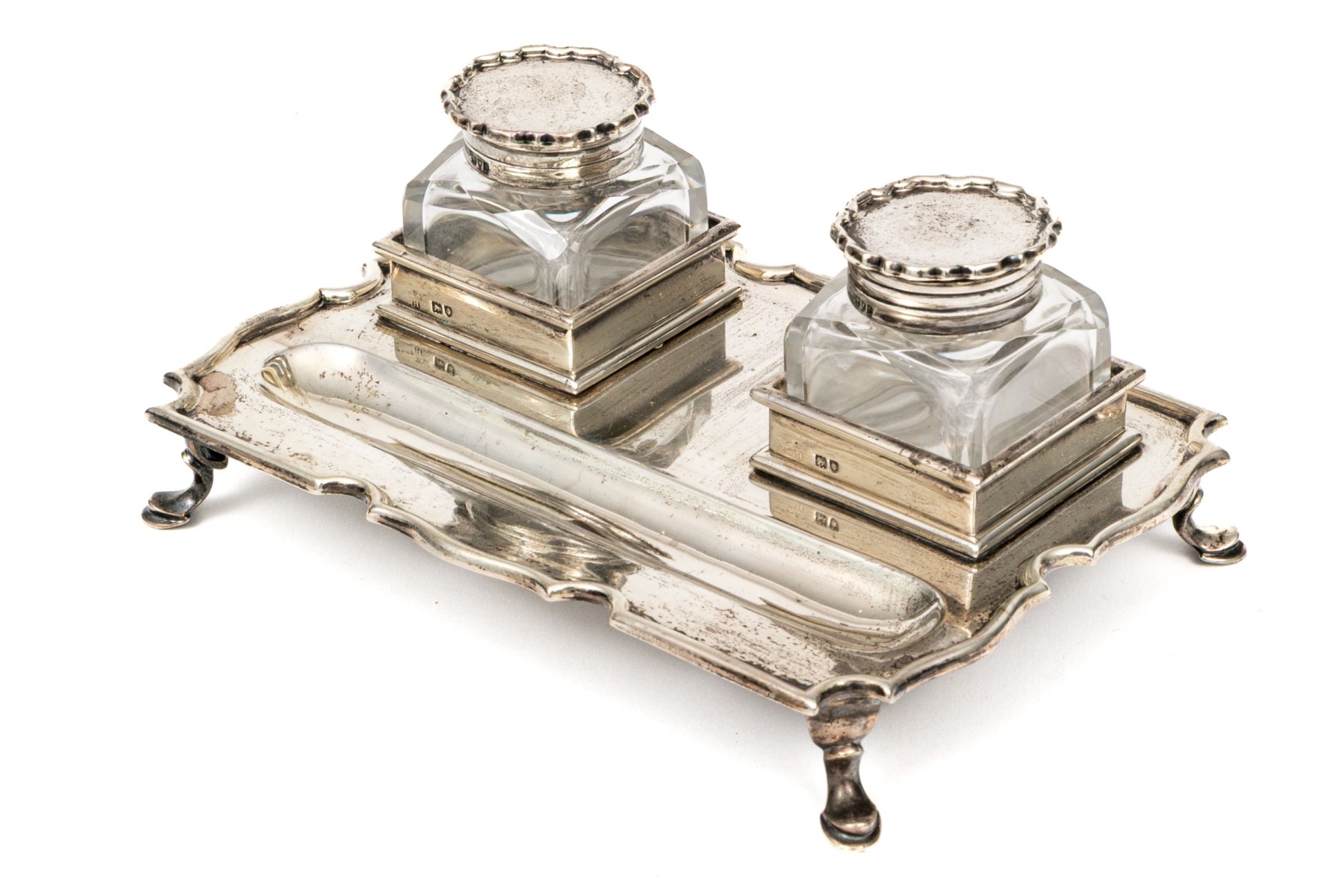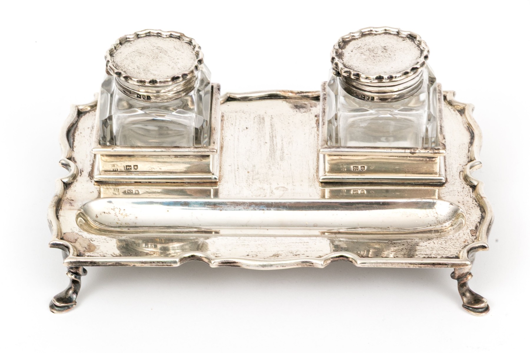 An antique English sterling silver footed ink standish. With the stand having four hoof feet with shaped, rectangular frame with oval ink well and two applied stations for for the crystal bottles with hinged sterling silver lids.