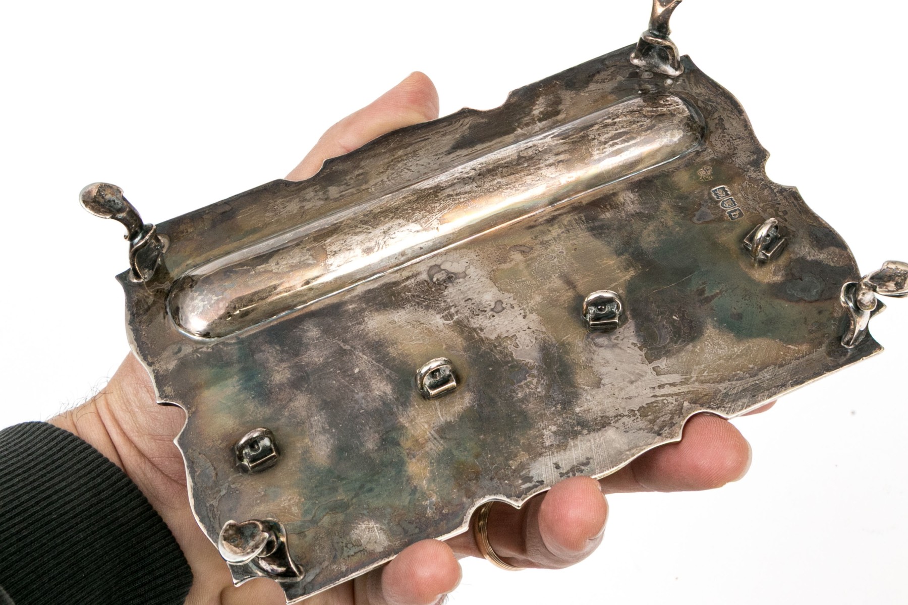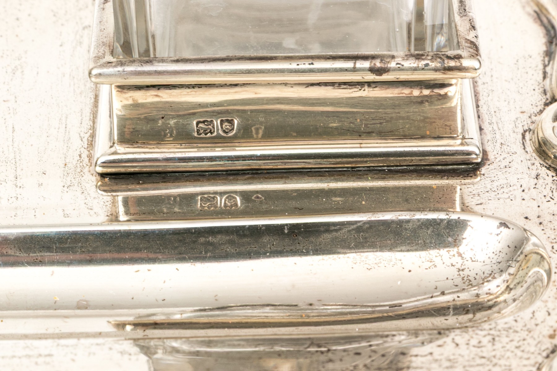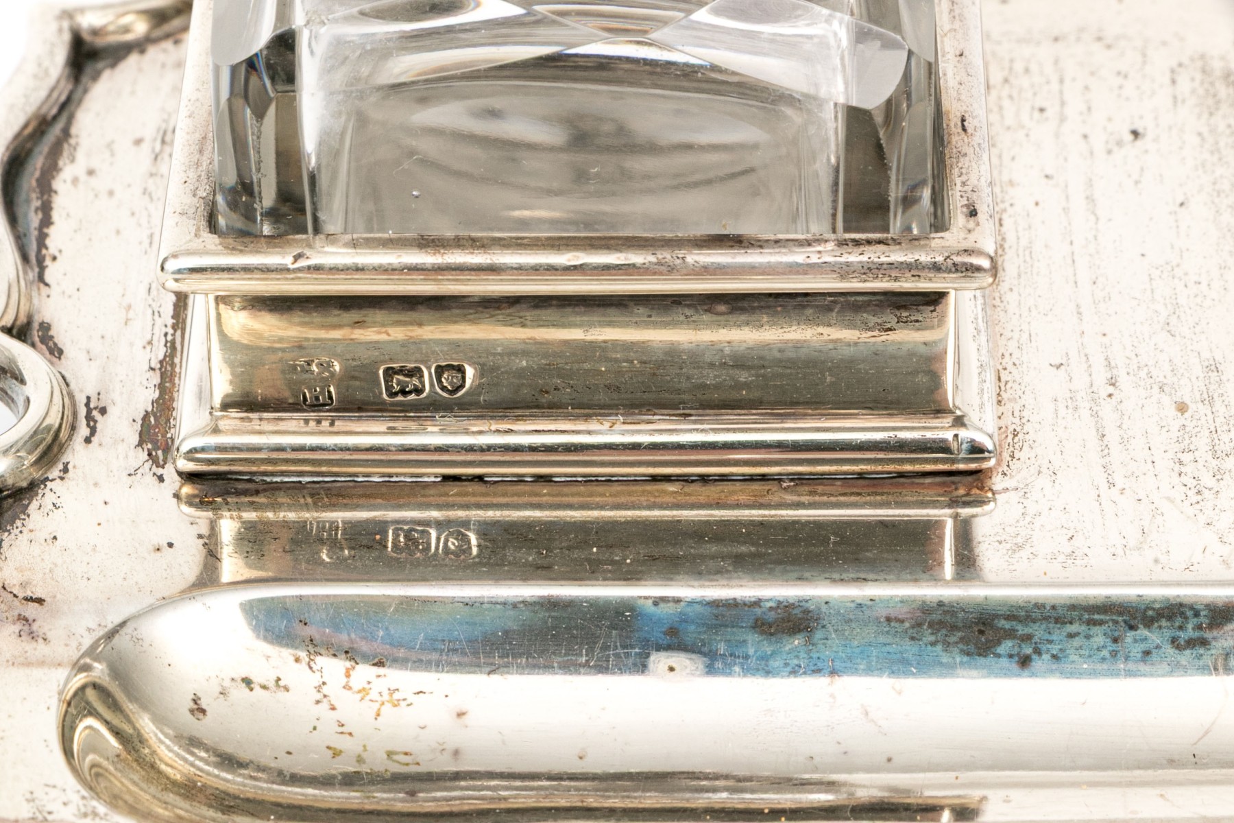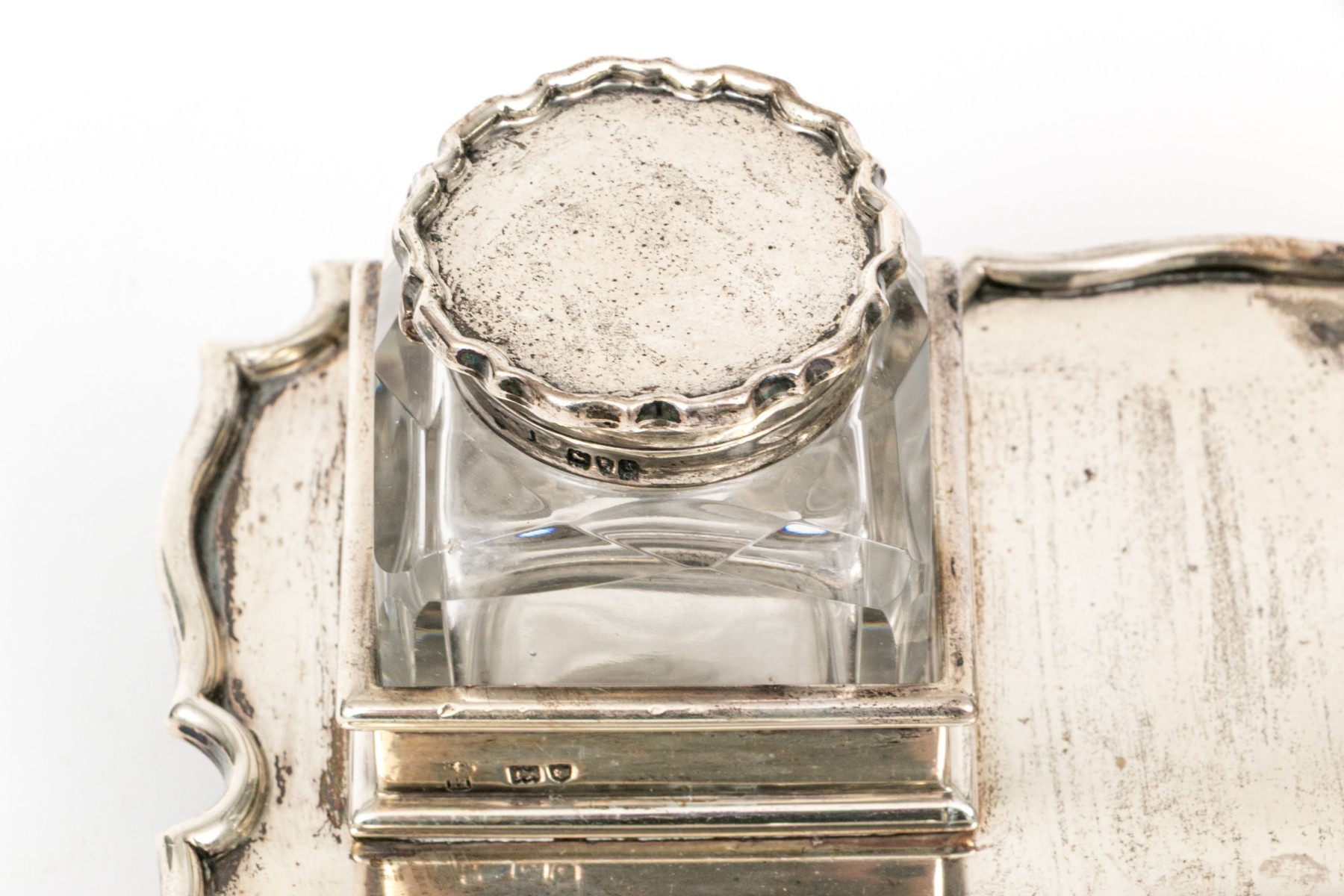 An antique English sterling silver footed ink standish. With the stand having four hoof feet with shaped, rectangular frame with oval ink well and two applied stations for for the crystal bottles with hinged sterling silver lids.