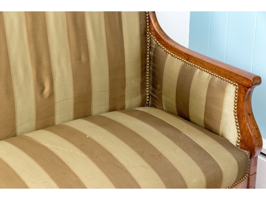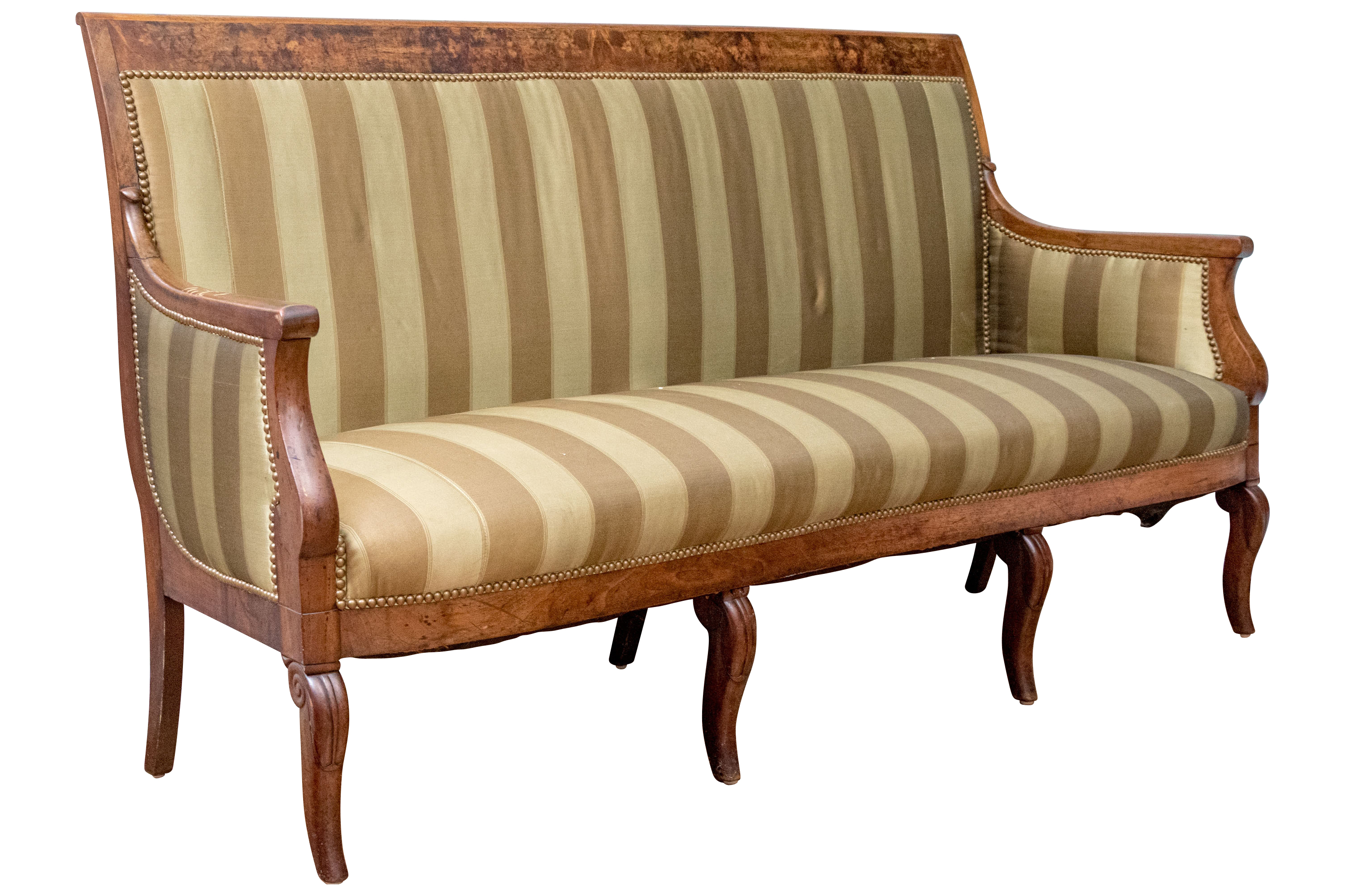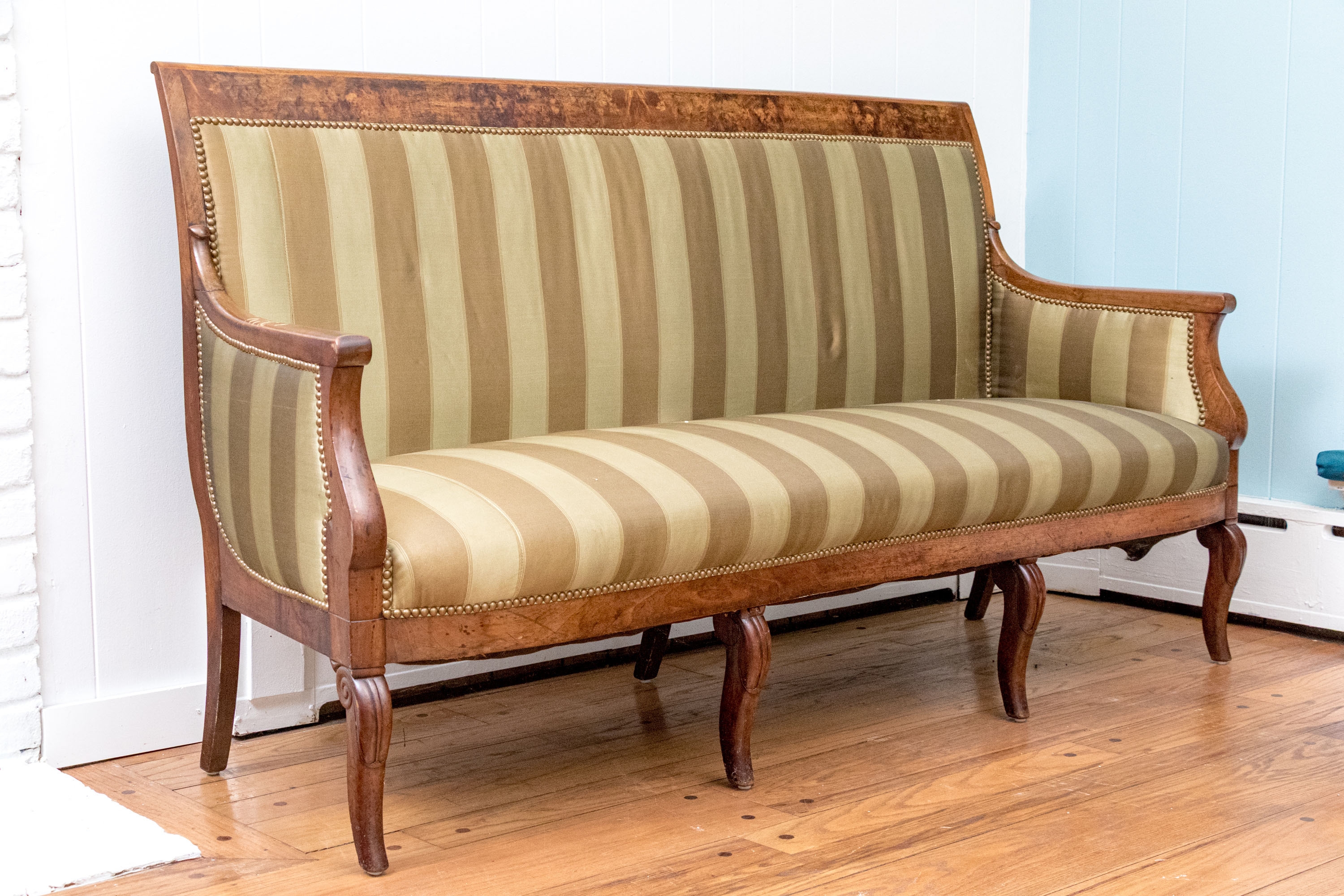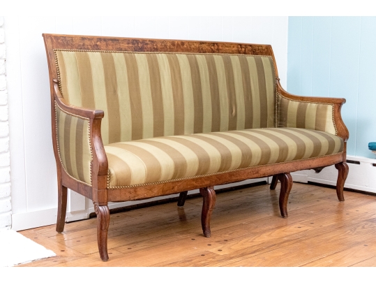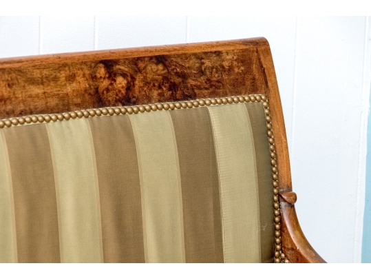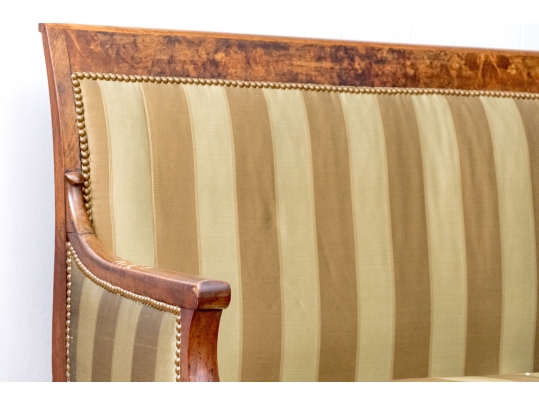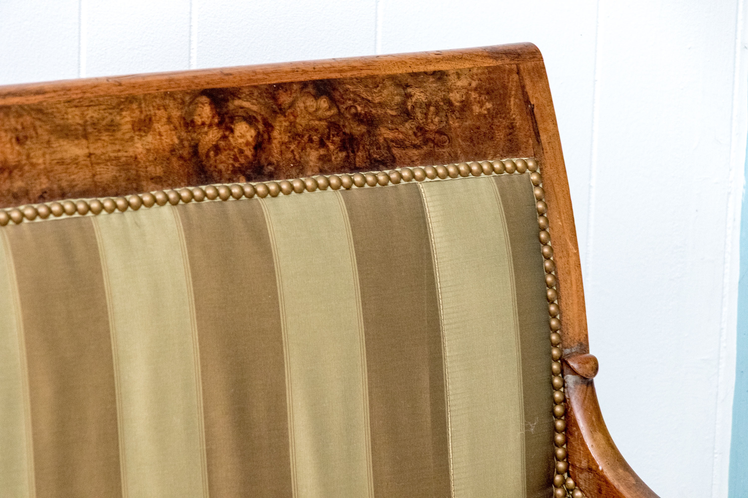 A Charles X style settee with mahogany veneers with burl veneered top rail and striped upholstery with brass tack nailhead trim. The settee resting on four cabriole front legs with three saber form back legs.