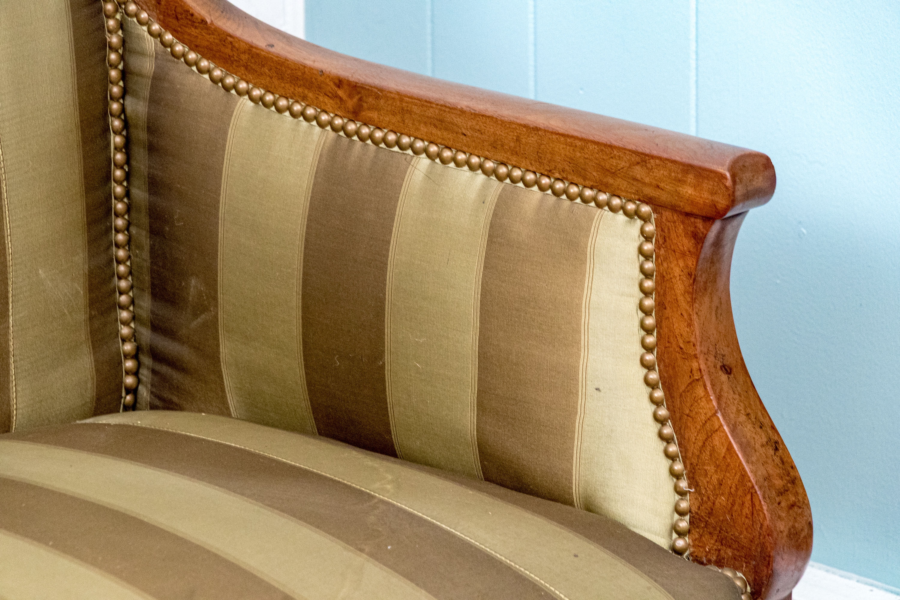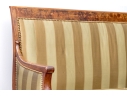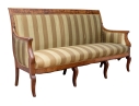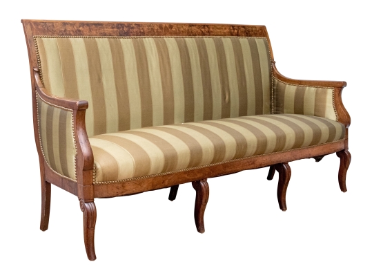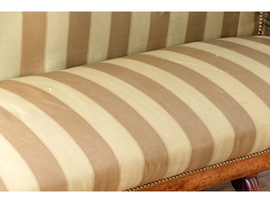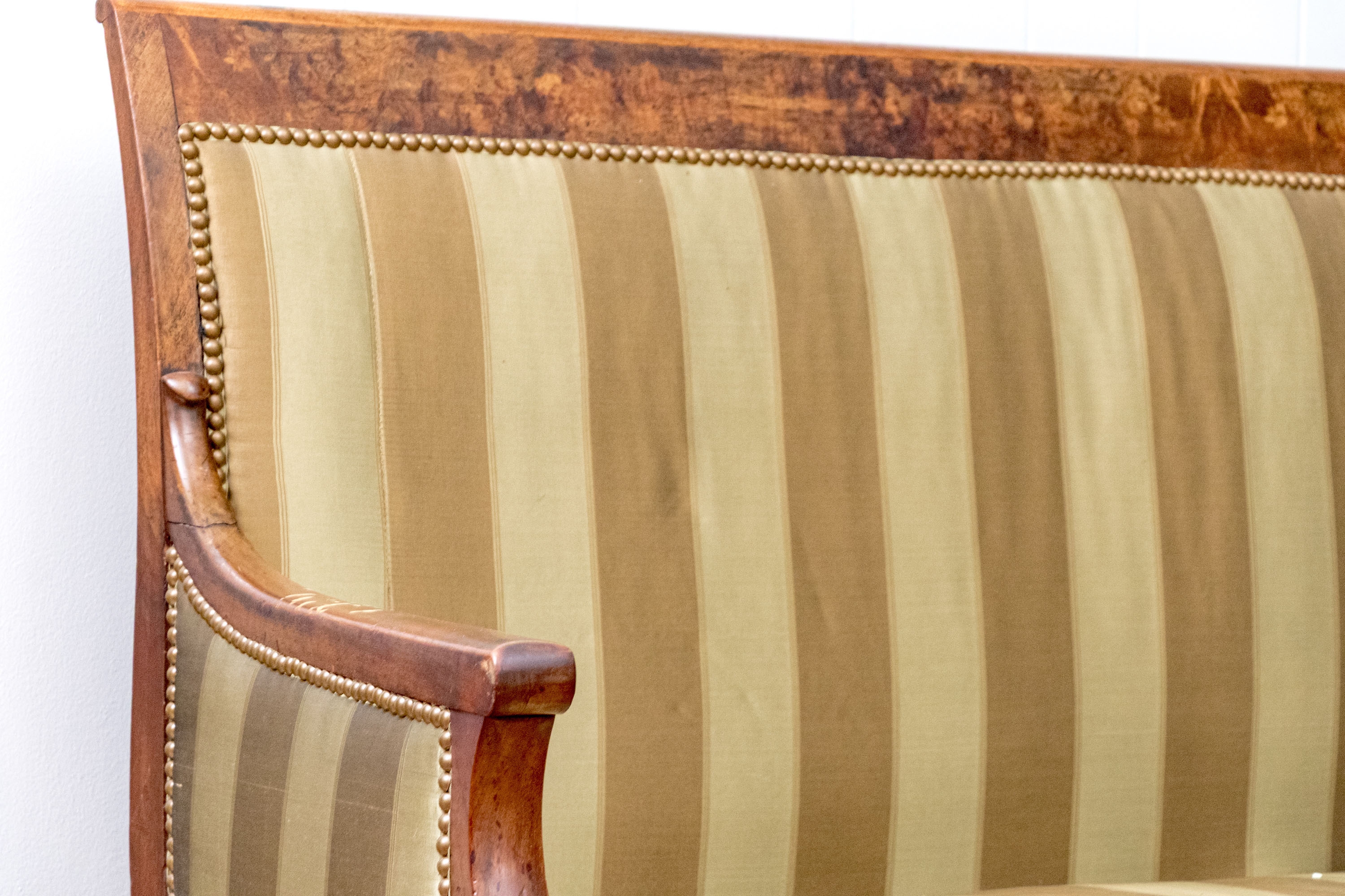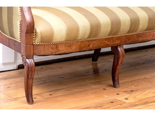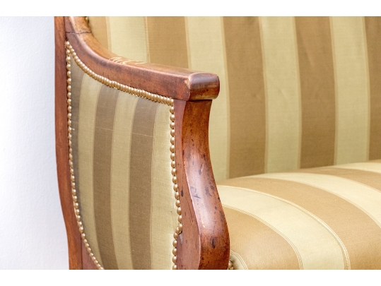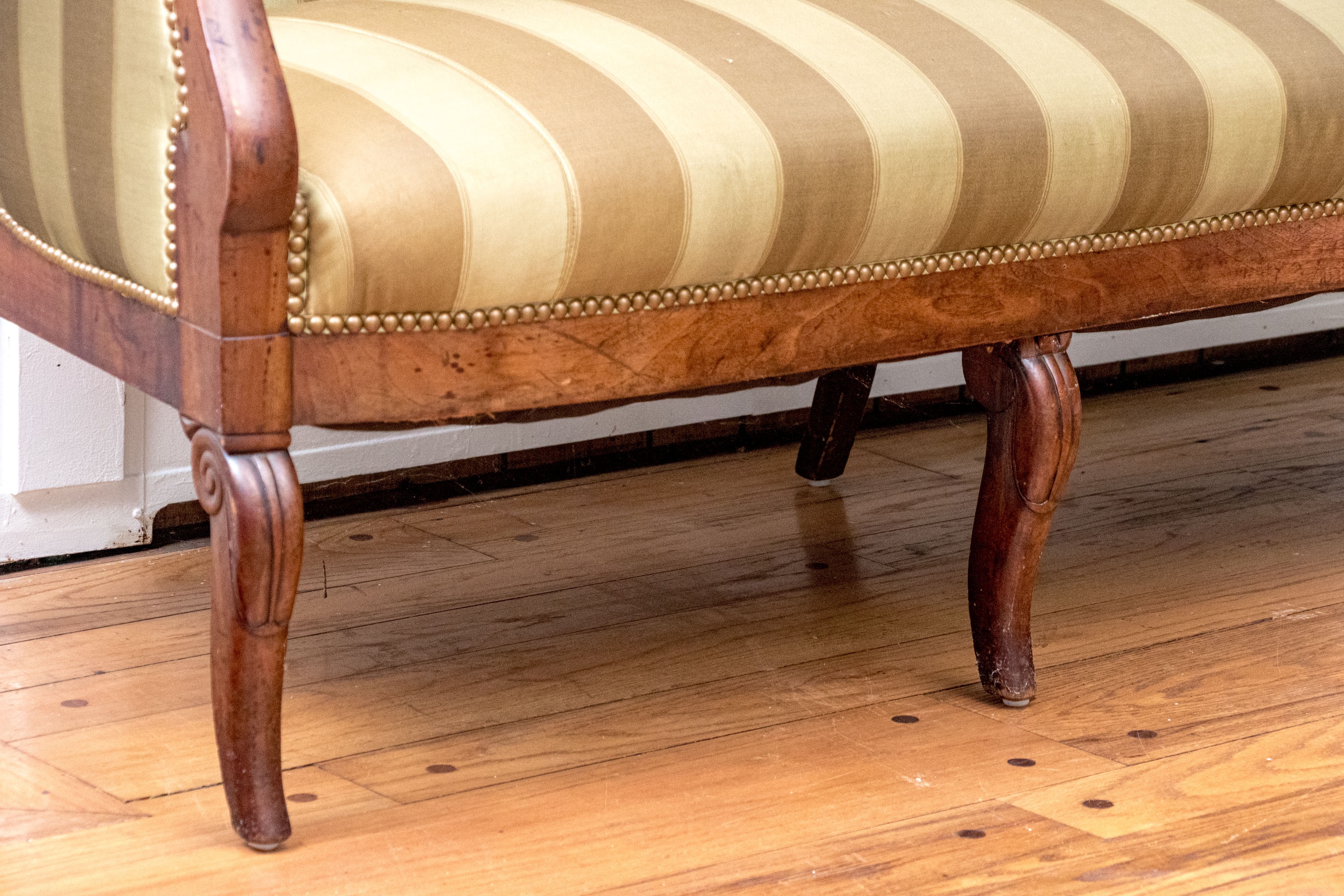 A Charles X style settee with mahogany veneers with burl veneered top rail and striped upholstery with brass tack nailhead trim. The settee resting on four cabriole front legs with three saber form back legs.