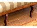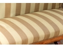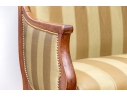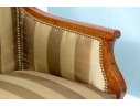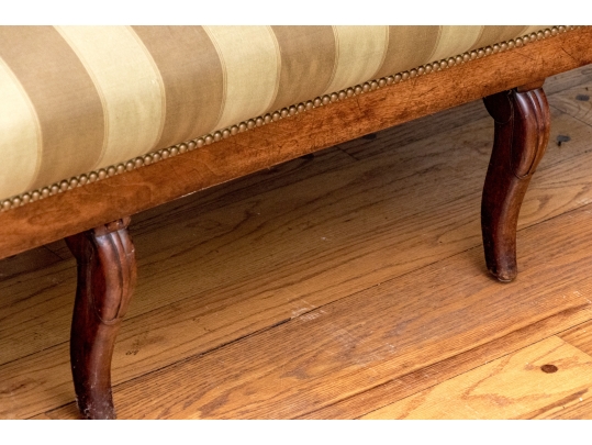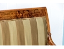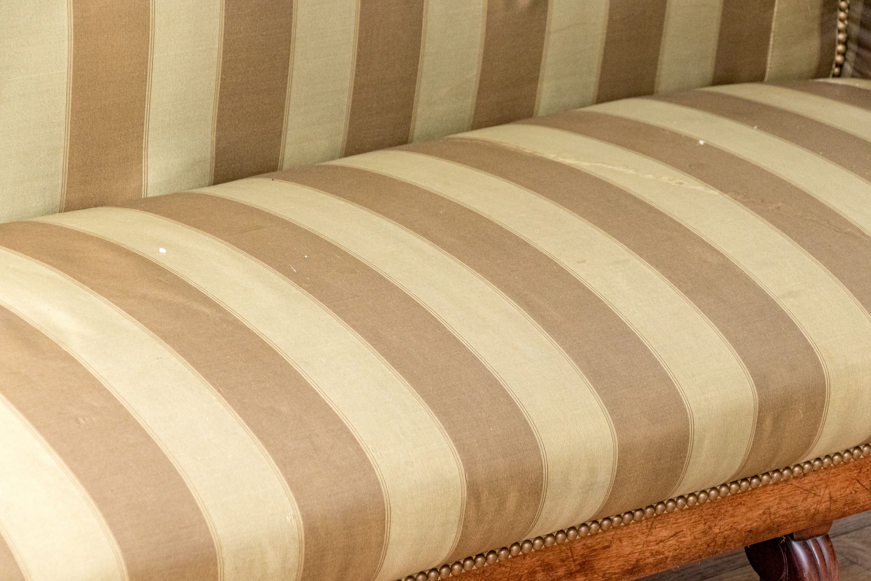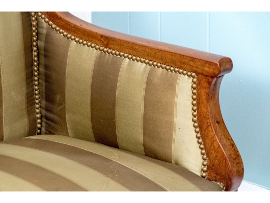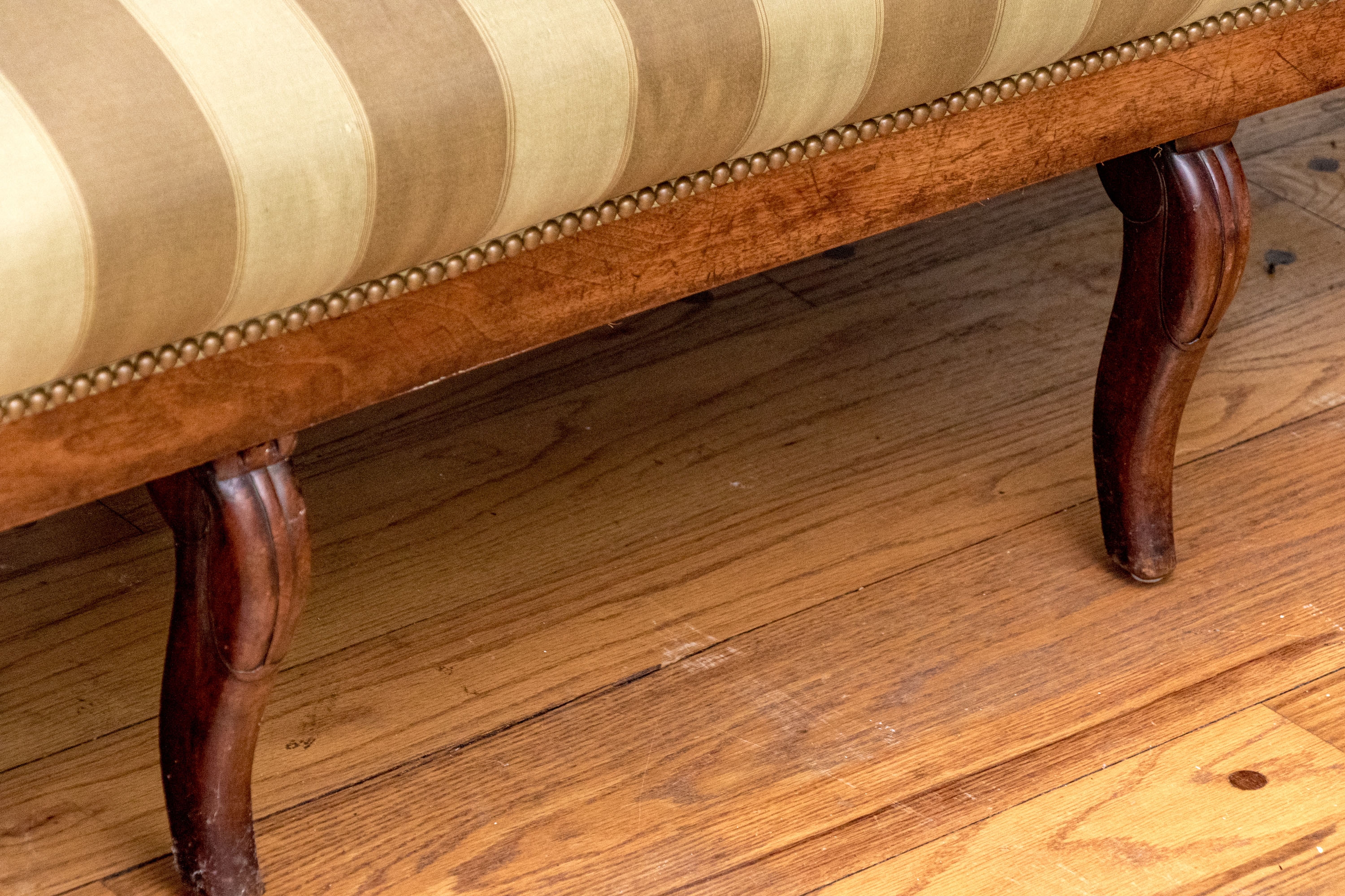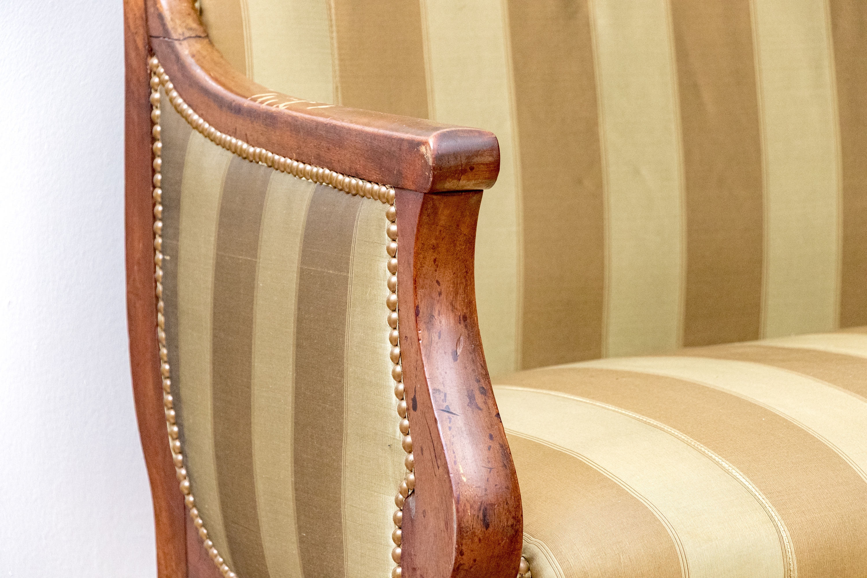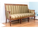 A Charles X style settee with mahogany veneers with burl veneered top rail and striped upholstery with brass tack nailhead trim. The settee resting on four cabriole front legs with three saber form back legs.