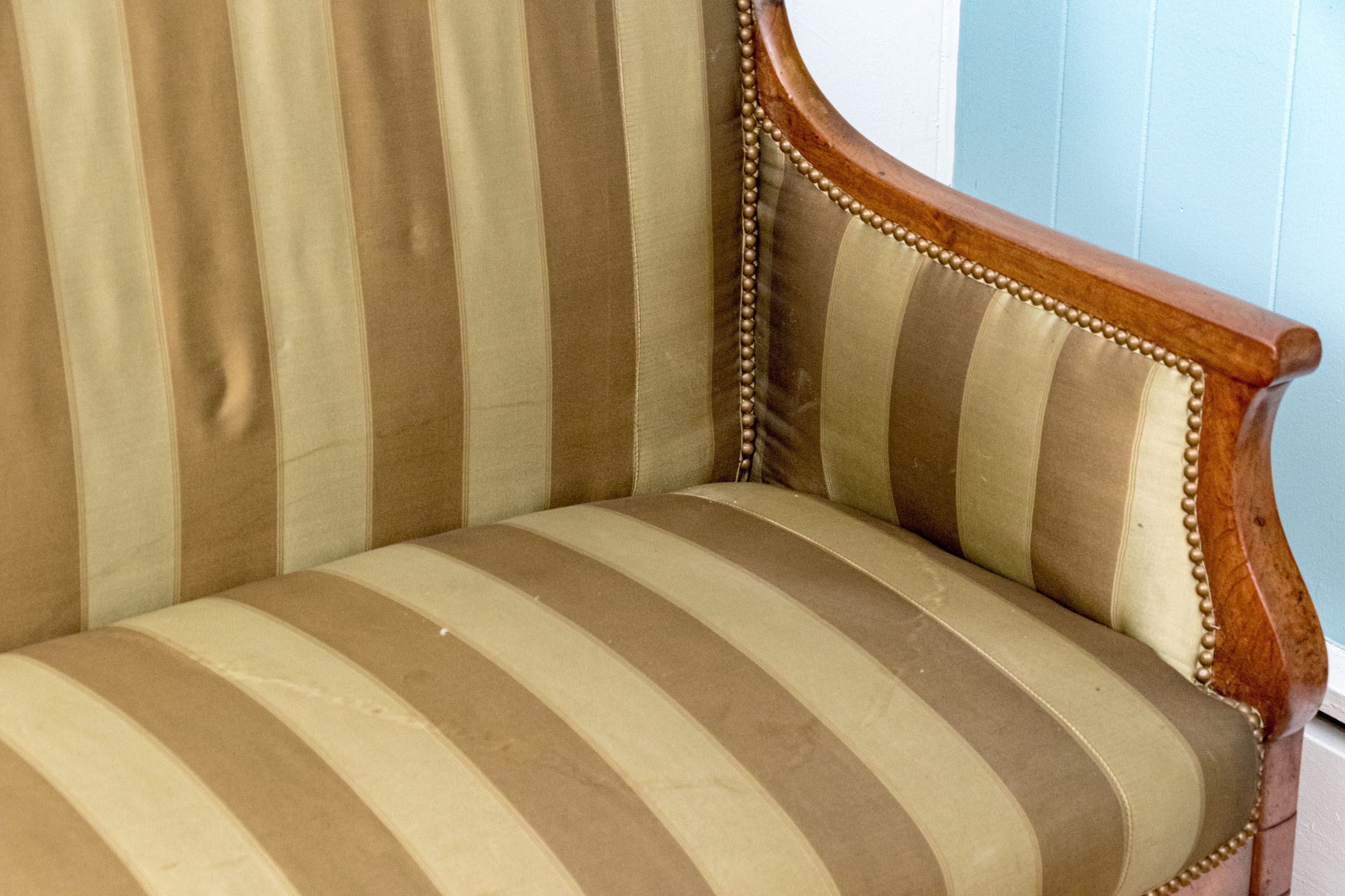 Condition: Please see detail photos. Restoration recommended. Various signs of age include the need for re-upholstering, Staining to upholstery and losses to the veneer with heavy scratches to the left arm, wear around the frame, hairline to left upper armrest.