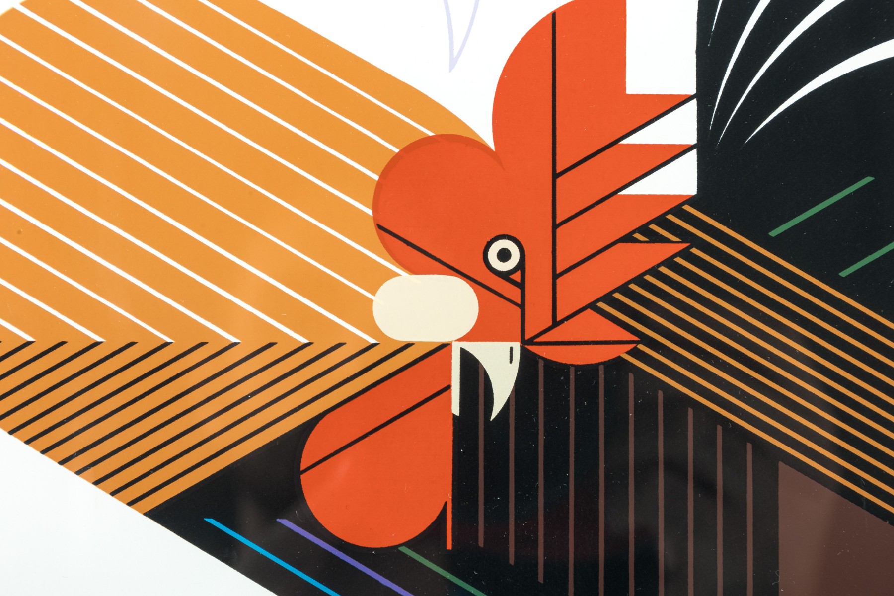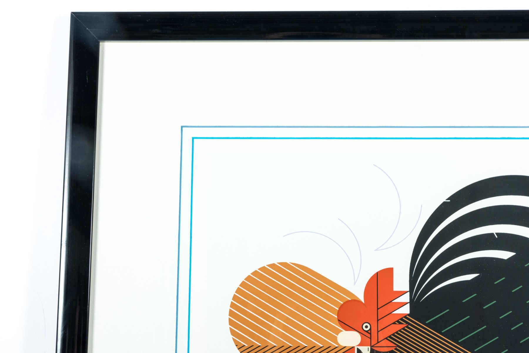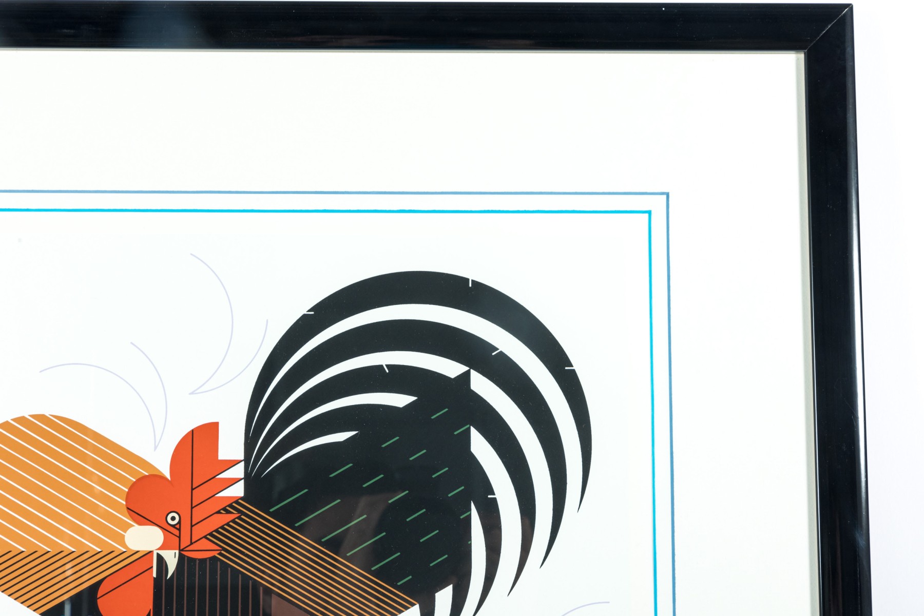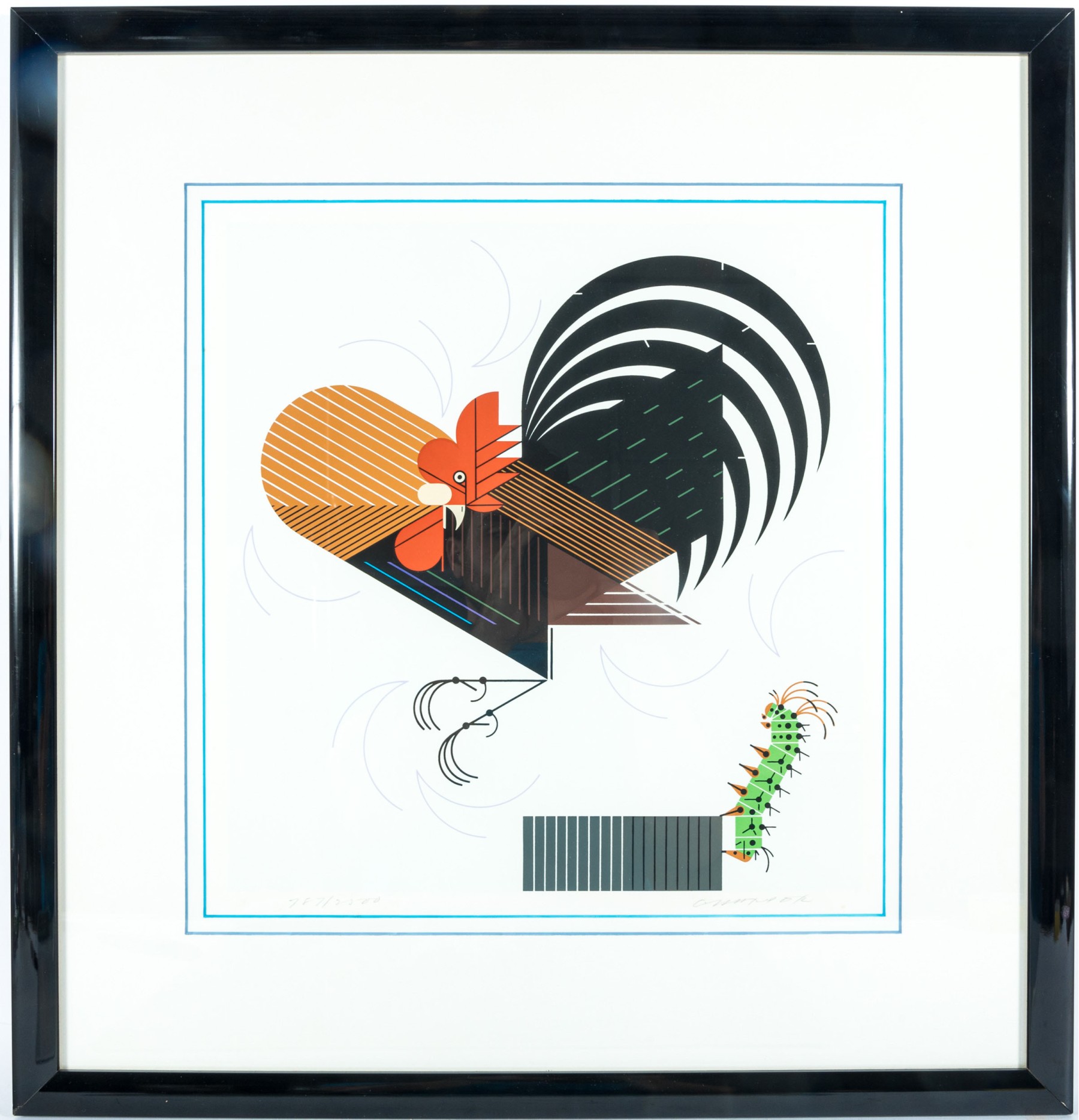 A limited edition serigraph print entitled, "Crawling Tall" by American Modernist artist Charley Harper (1922 - 2007). Signed in graphite, this piece depicts a highly stylized geometric rendition of a rooster presented in a gloss black frame, double matted in white with a glass facing.