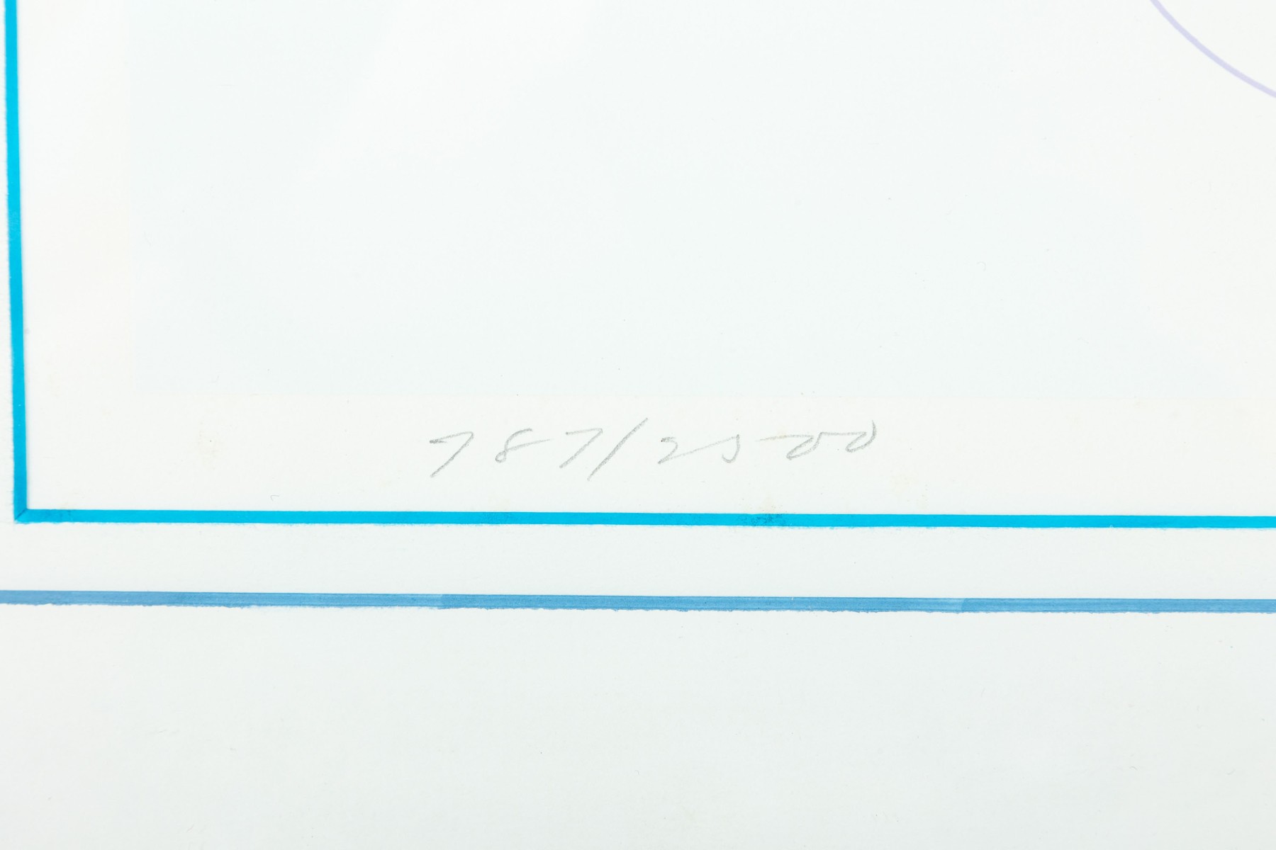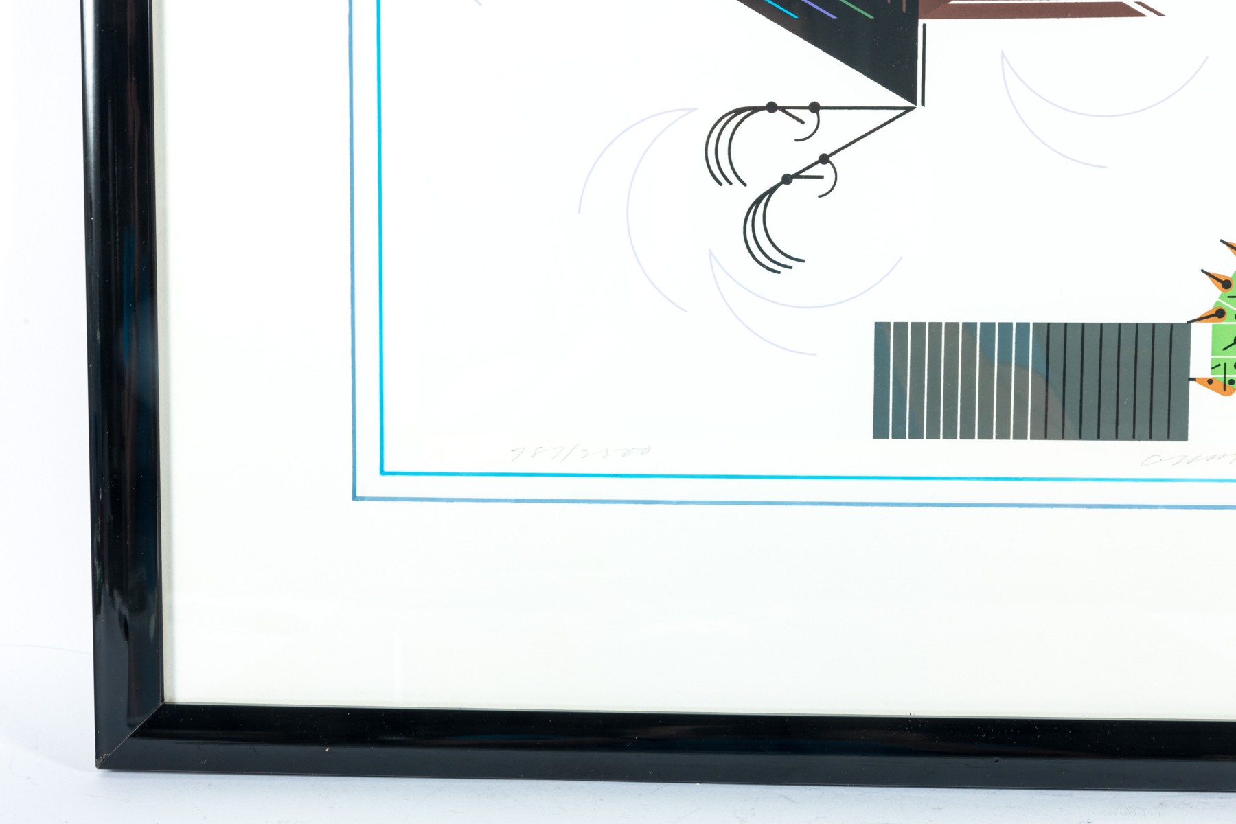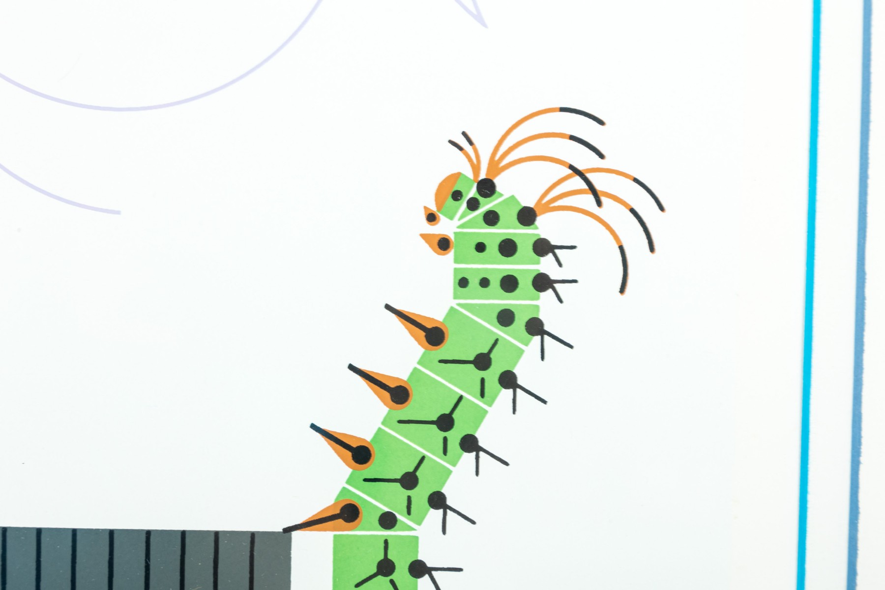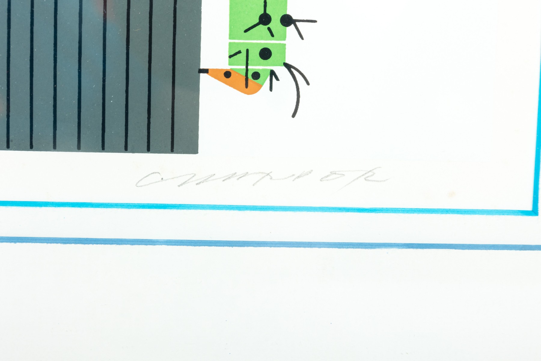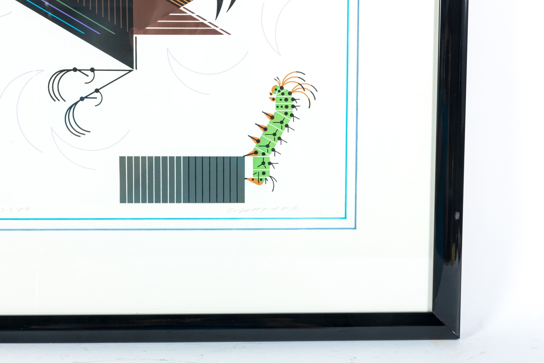 A limited edition serigraph print entitled, "Crawling Tall" by American Modernist artist Charley Harper (1922 - 2007). Signed in graphite, this piece depicts a highly stylized geometric rendition of a rooster presented in a gloss black frame, double matted in white with a glass facing.