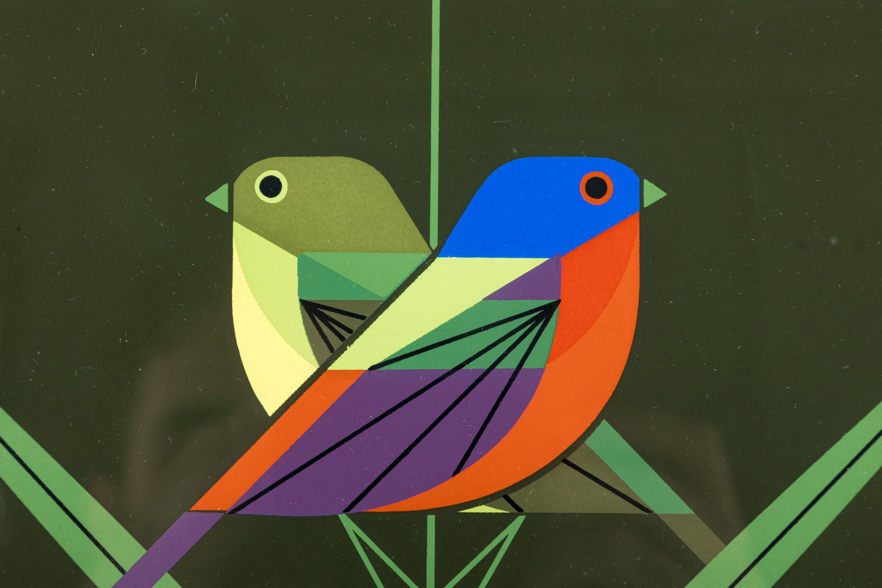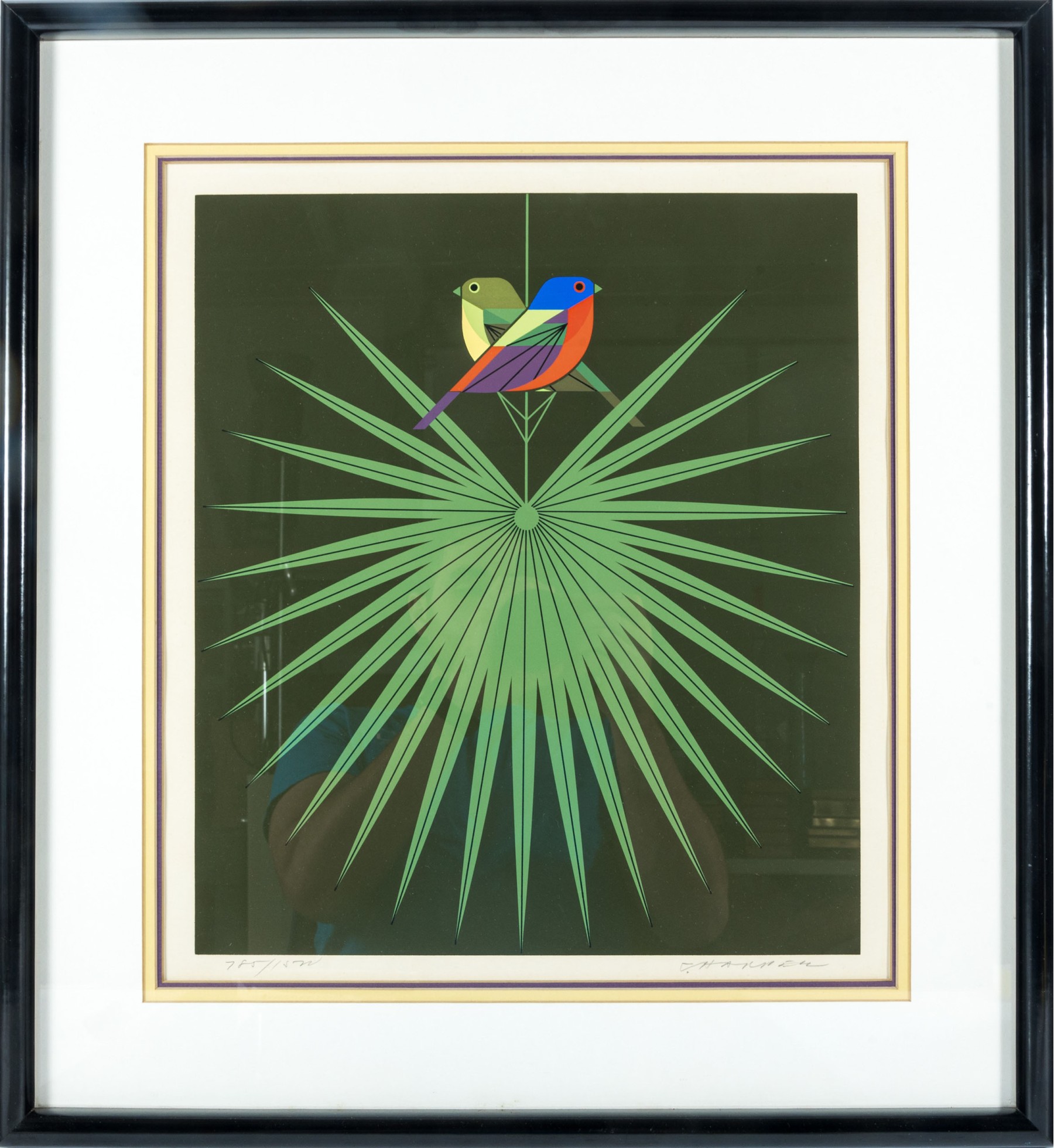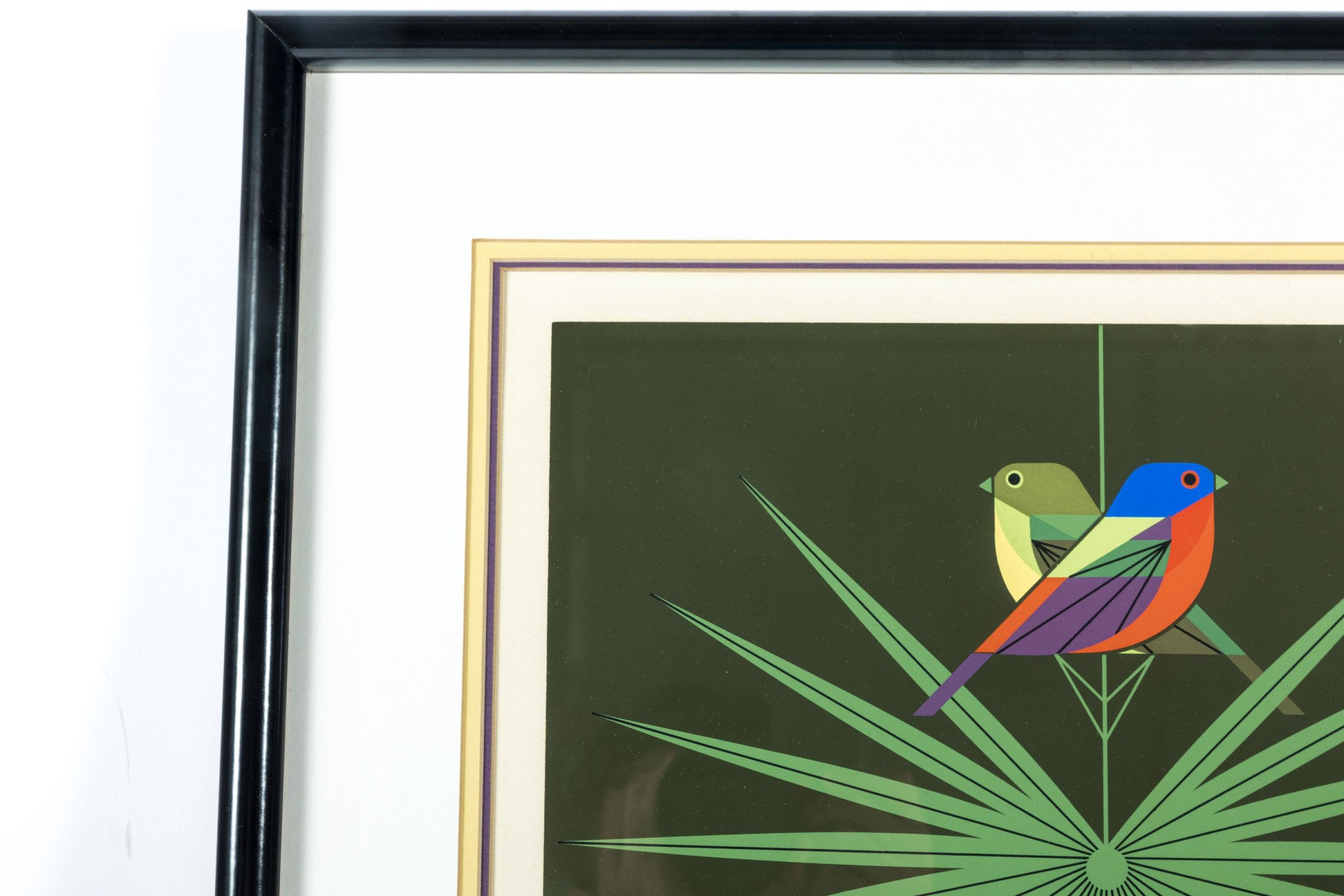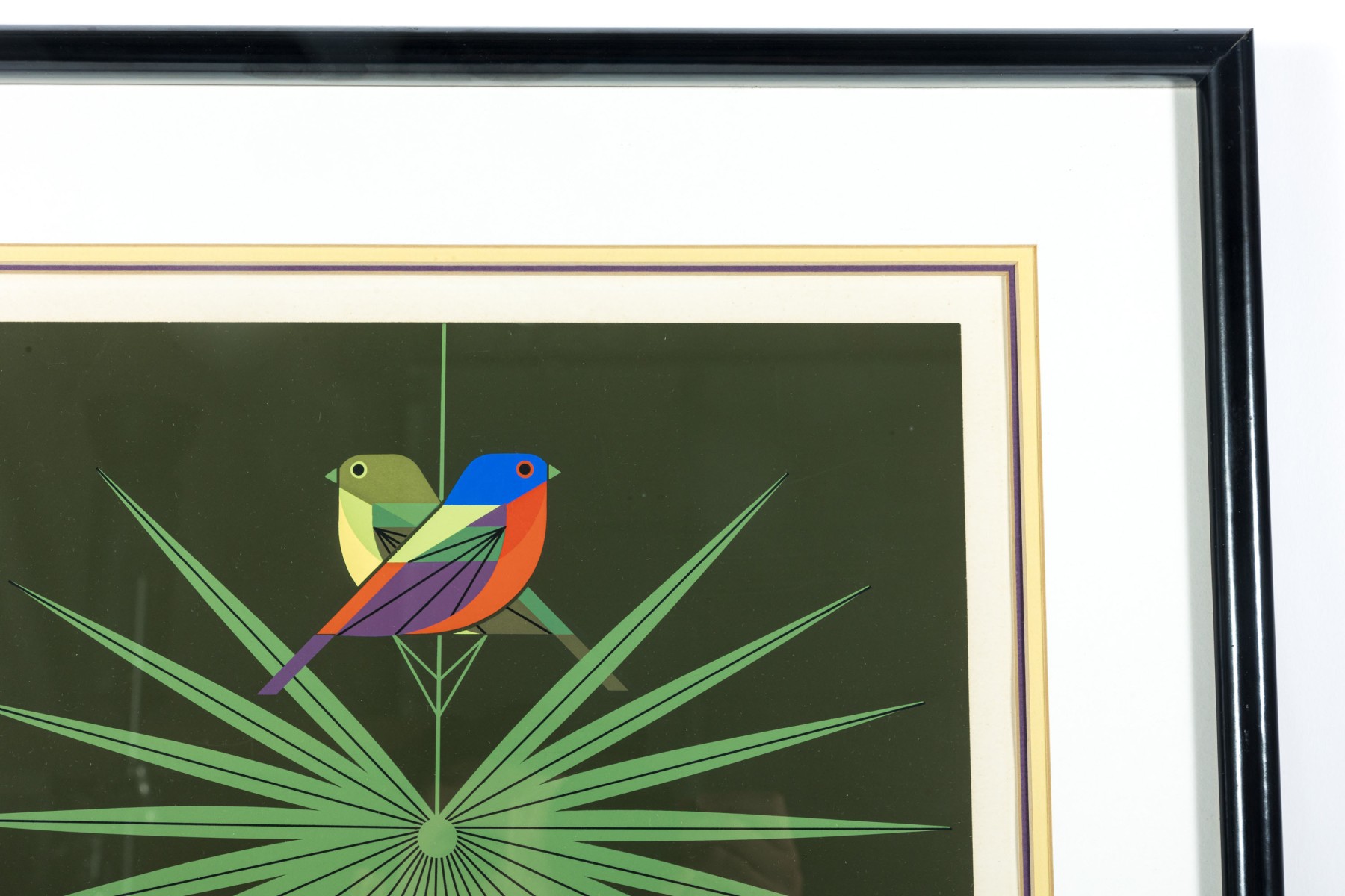 A limited edition serigraph print showcasing, "Painted Buntings" (Also referred to as "Flamboyant Feathers) by American Modernist artist Charley Harper (1922 - 2007). Signed in graphite, this piece depicts a highly stylized mandala accompanied with buntings comprised of geometric shapes. The serigraph is presented in a gloss black frame, professionally triple-matted in white with a glass facing.