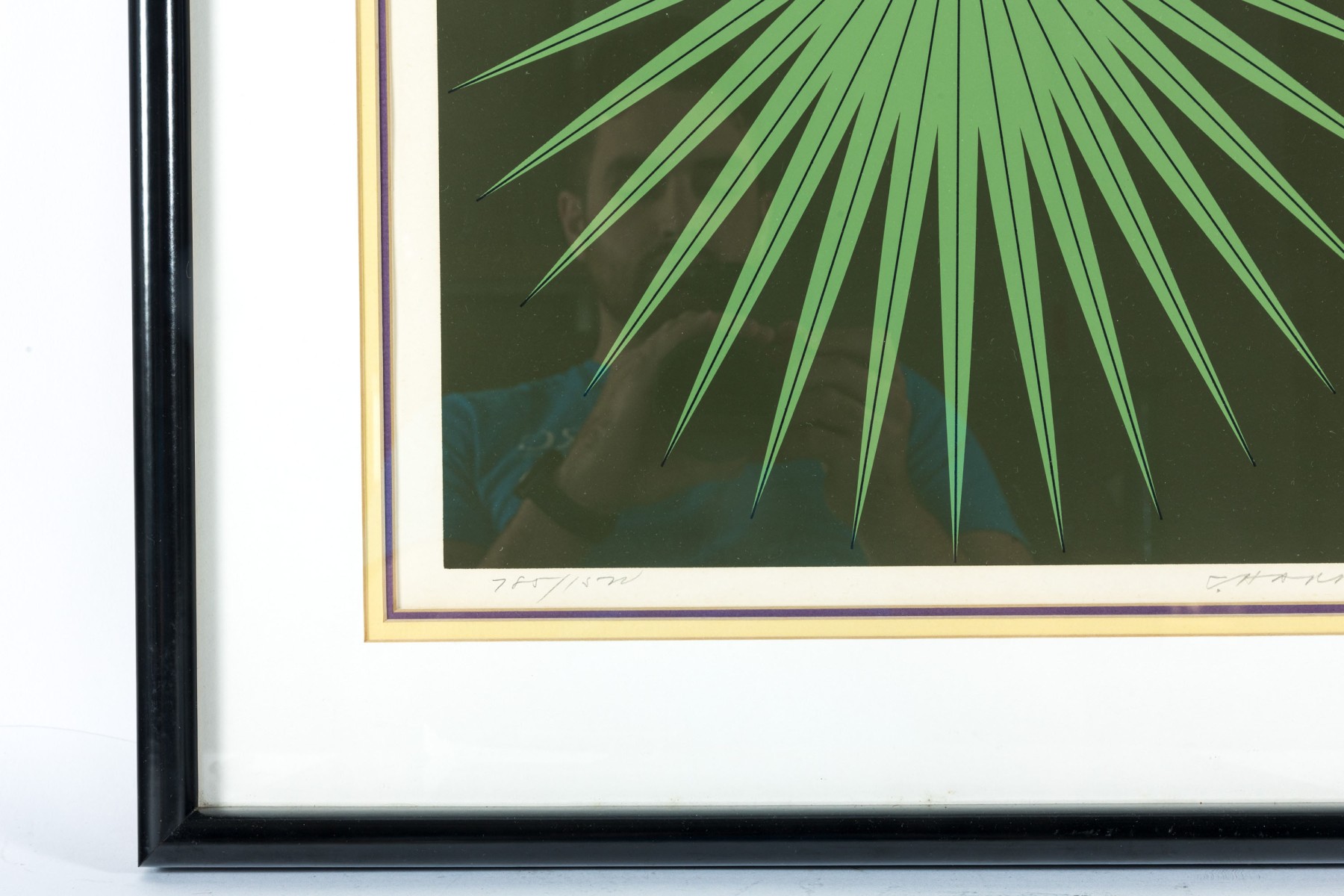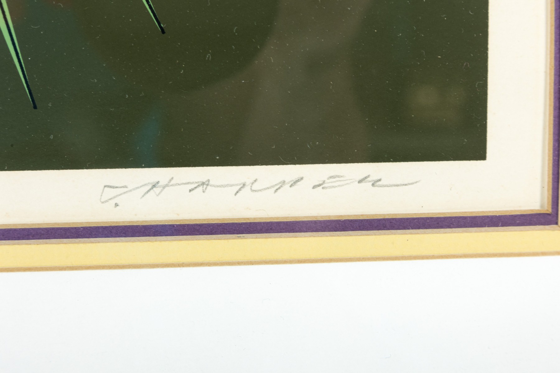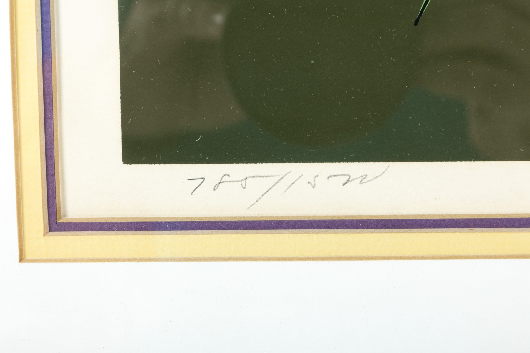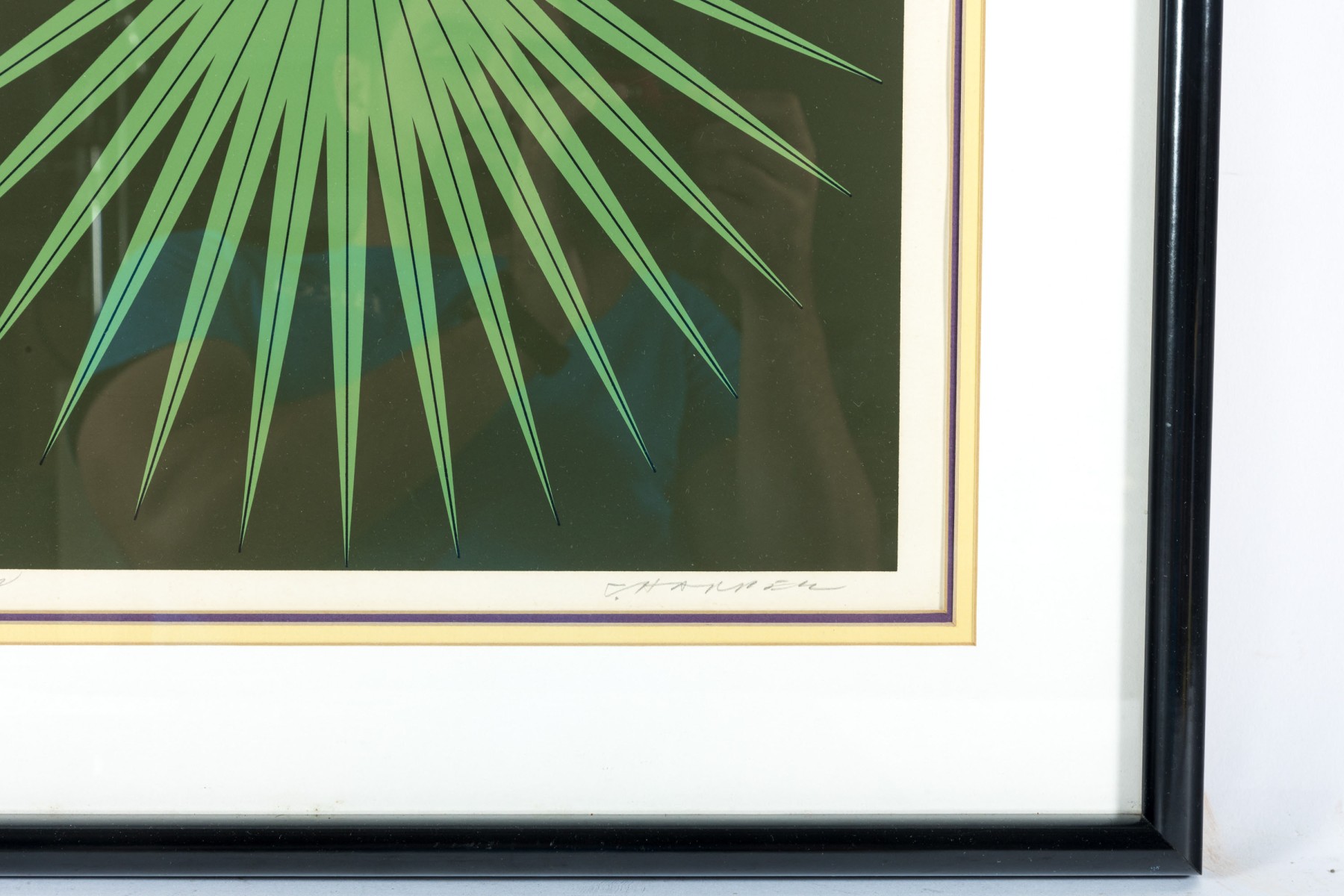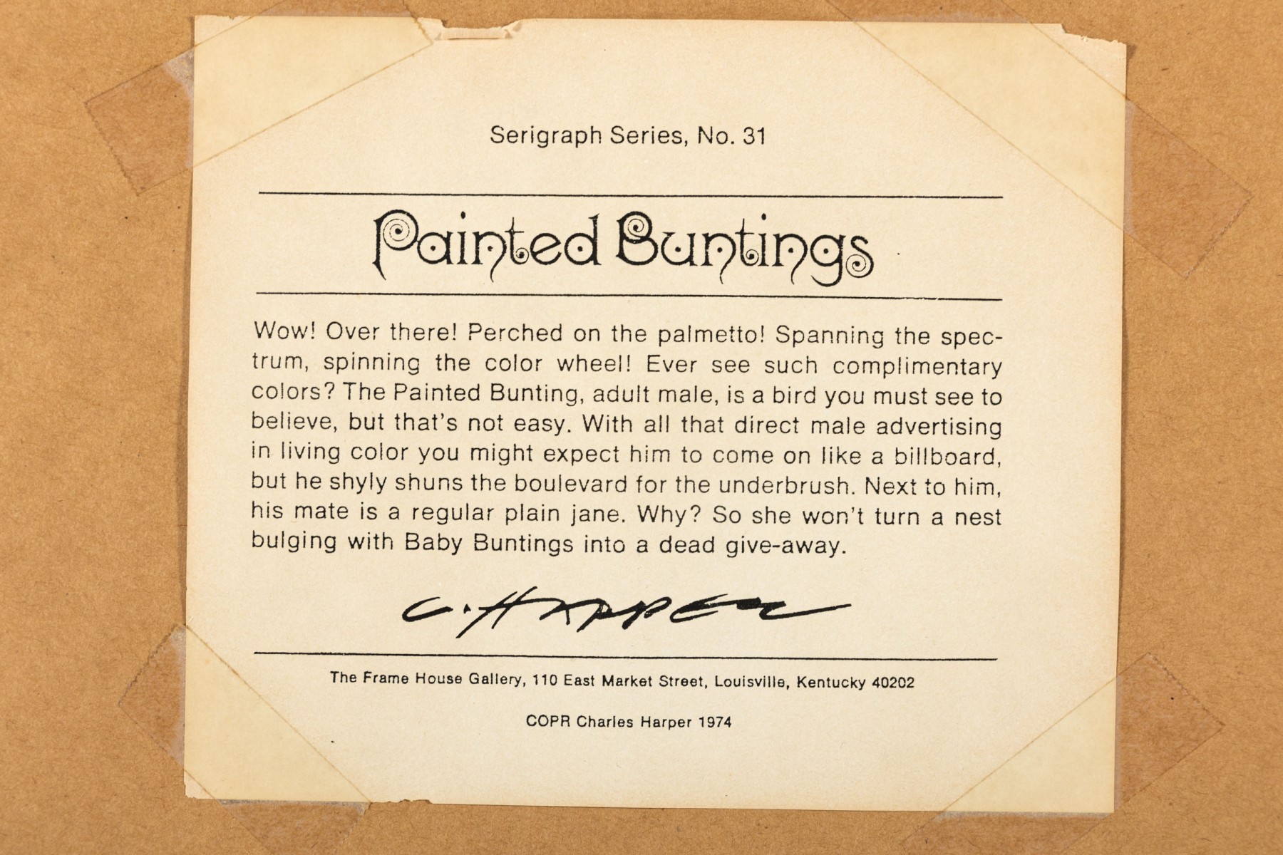 A limited edition serigraph print showcasing, "Painted Buntings" (Also referred to as "Flamboyant Feathers) by American Modernist artist Charley Harper (1922 - 2007). Signed in graphite, this piece depicts a highly stylized mandala accompanied with buntings comprised of geometric shapes. The serigraph is presented in a gloss black frame, professionally triple-matted in white with a glass facing.