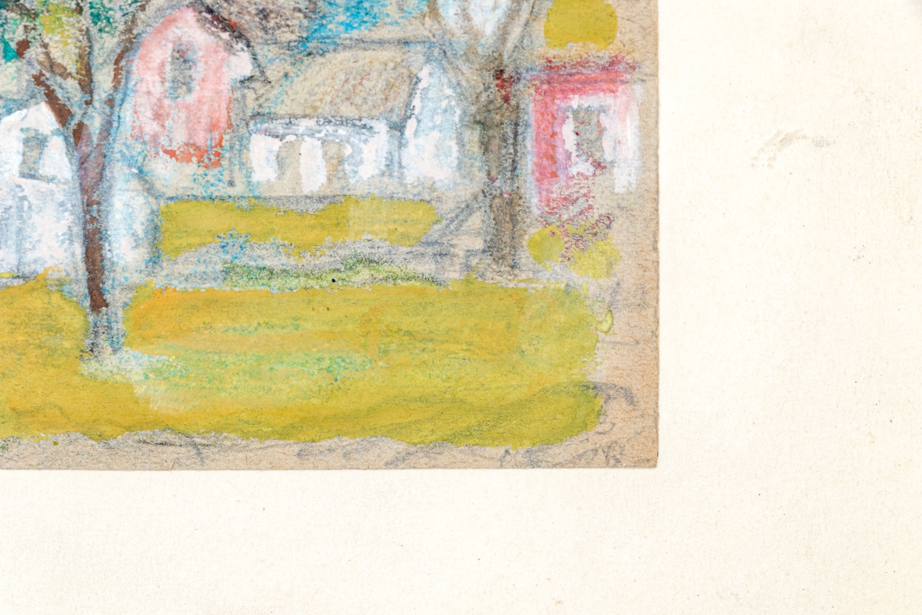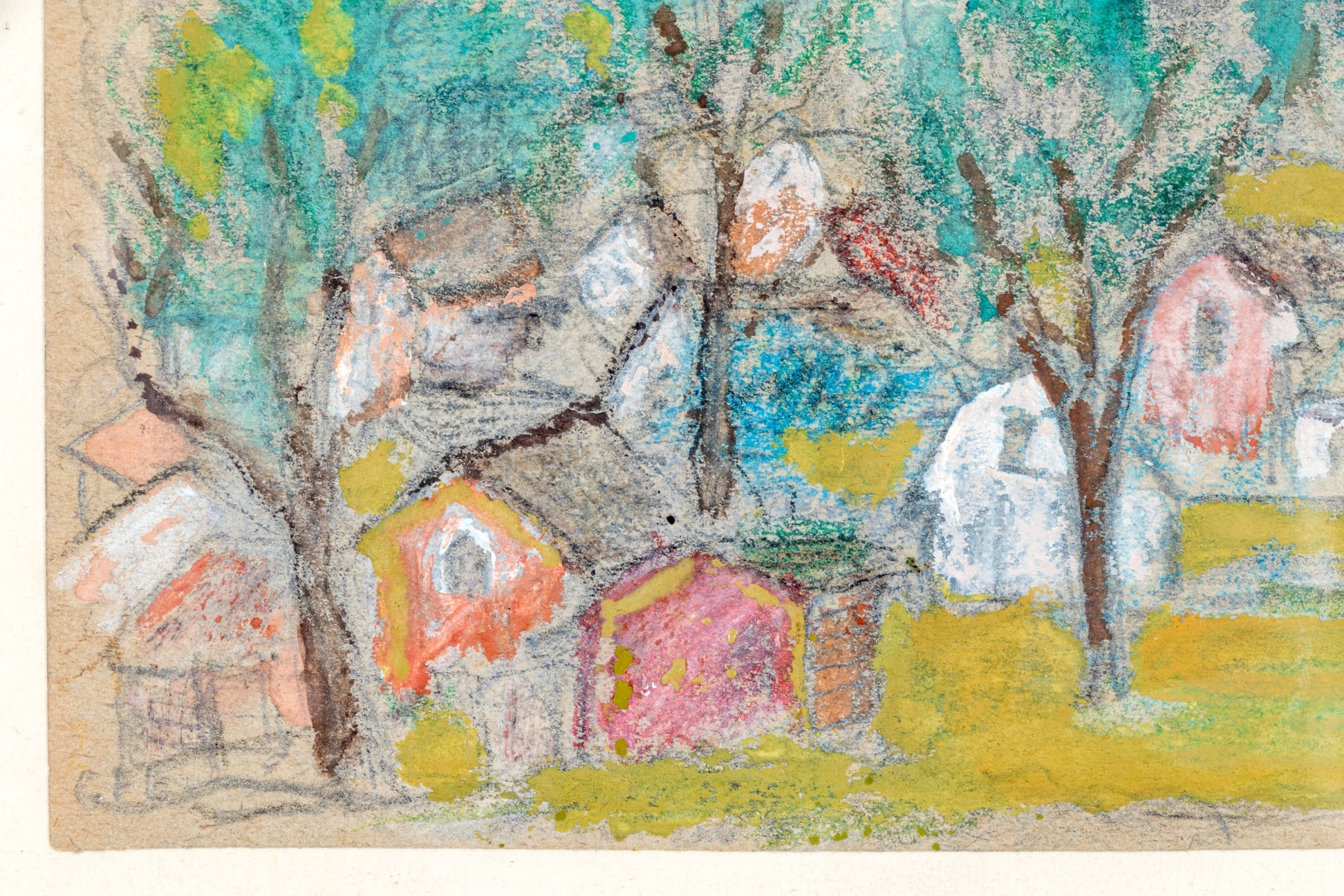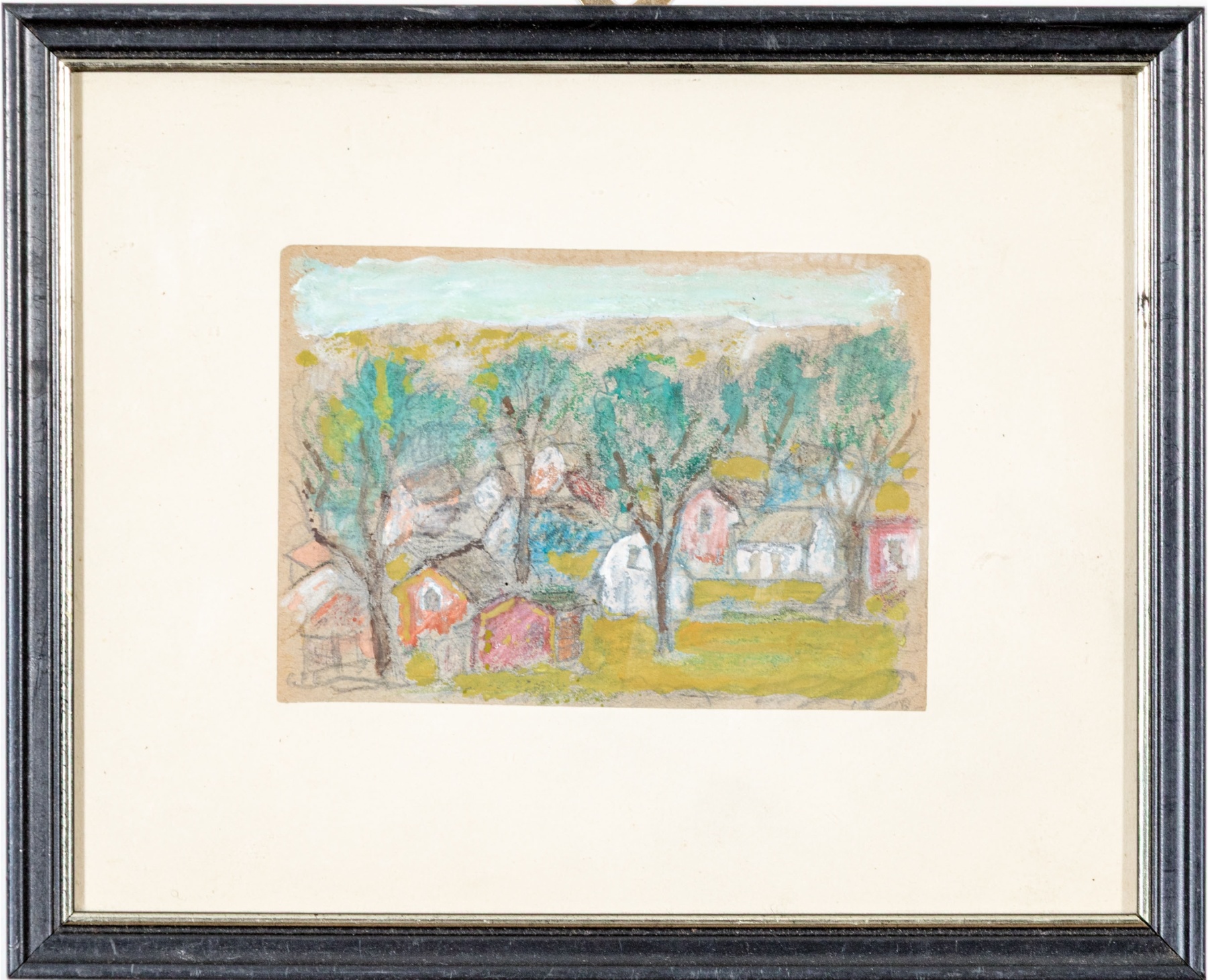 Charlotte Fuller Eastman (American, 1878-1956) mixed media on paper depicting a town with red, pink, and white houses surrounded by tall trees with teal foliage over chartreuse grass beneath a pale blue sky. Appears to be unsigned. With a handwritten label to the verso.