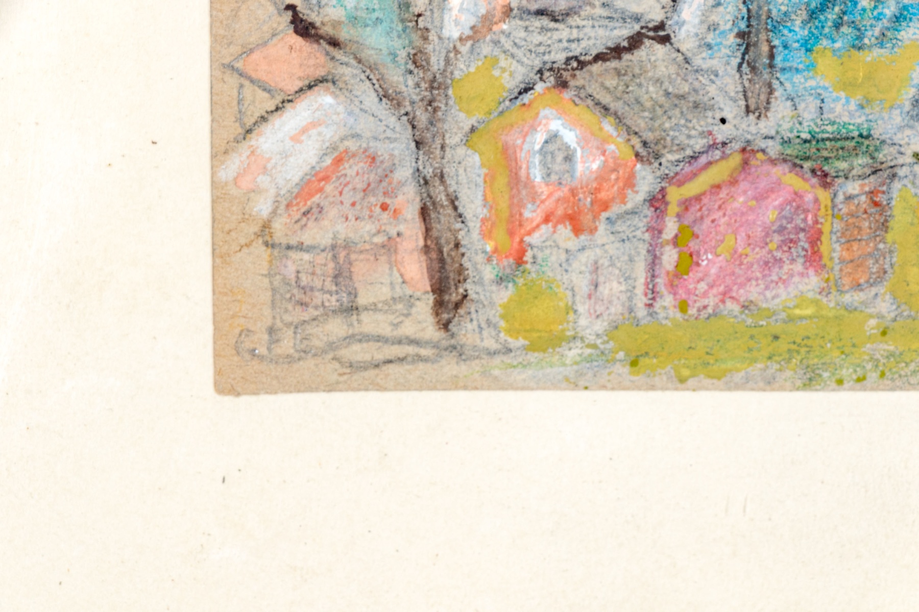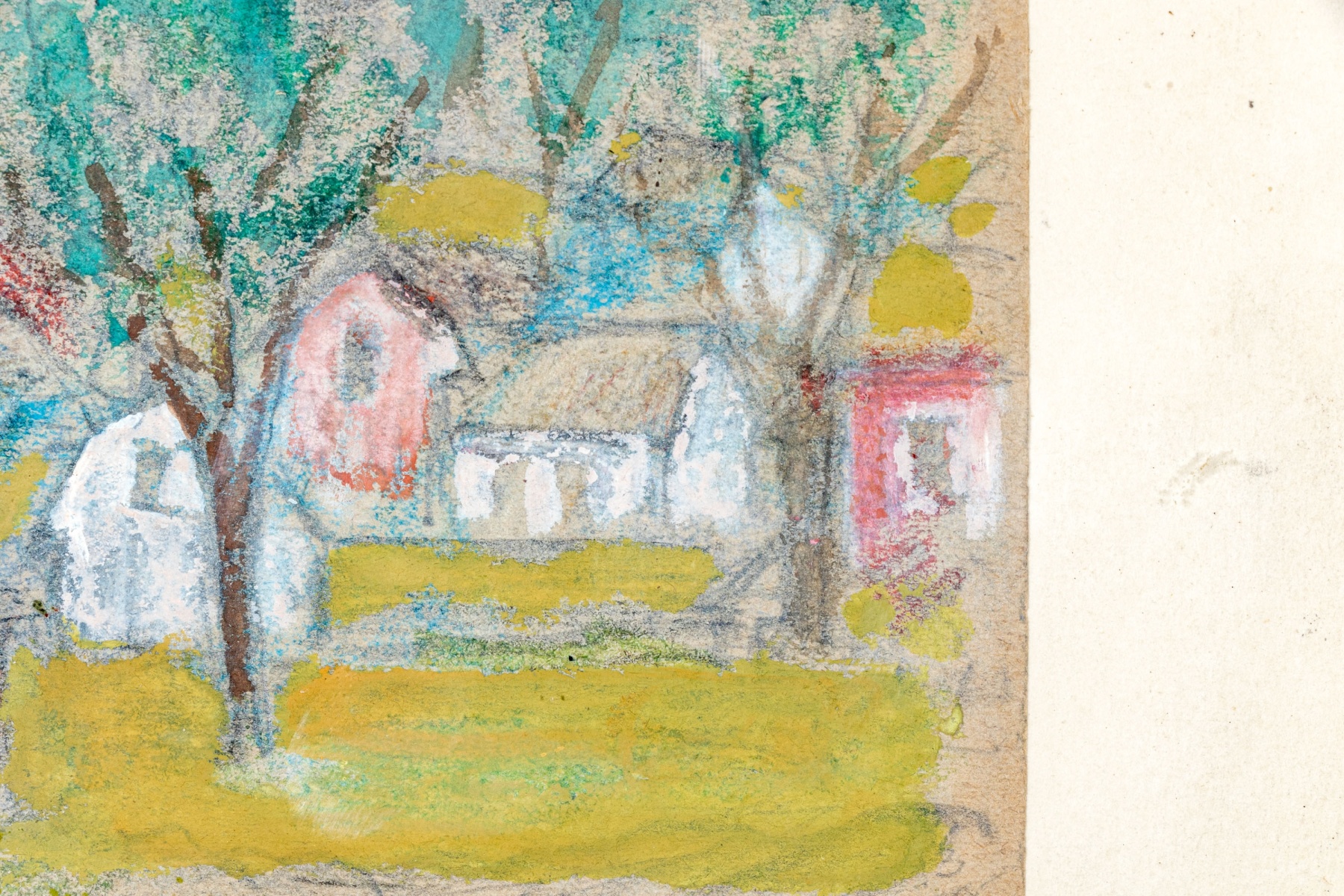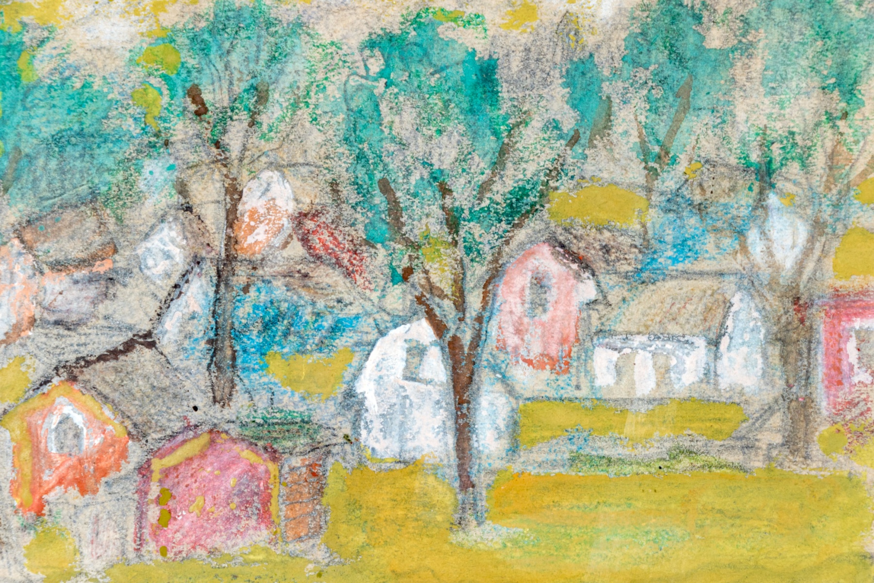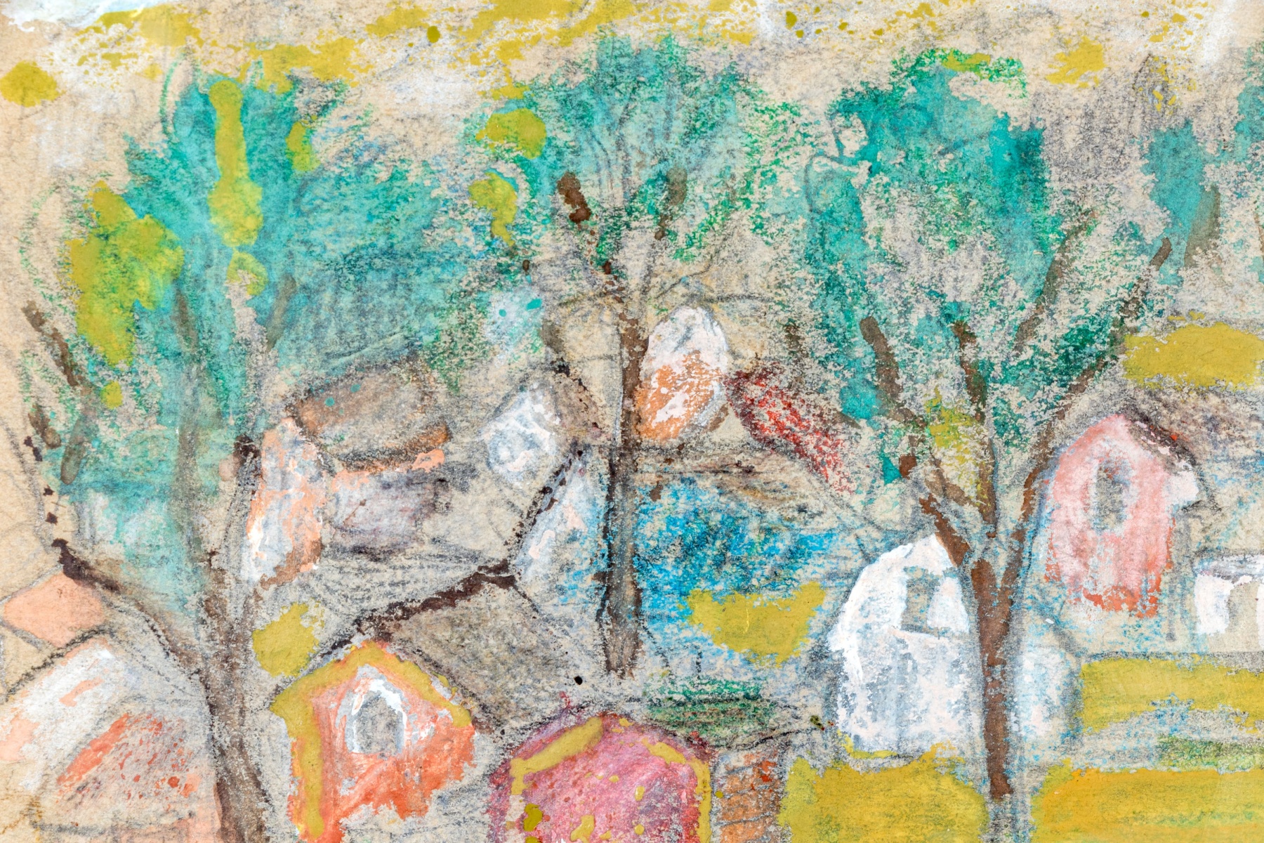 Charlotte Fuller Eastman (American, 1878-1956) mixed media on paper depicting a town with red, pink, and white houses surrounded by tall trees with teal foliage over chartreuse grass beneath a pale blue sky. Appears to be unsigned. With a handwritten label to the verso.