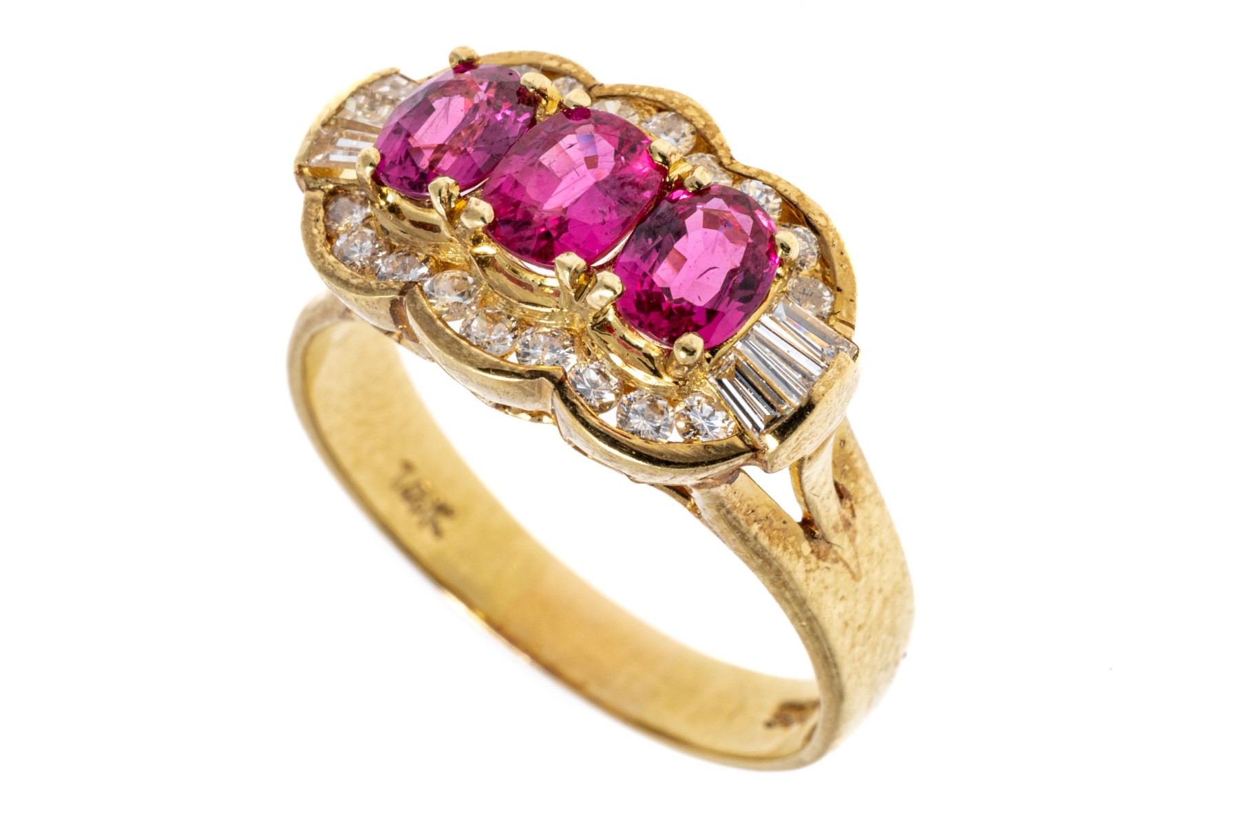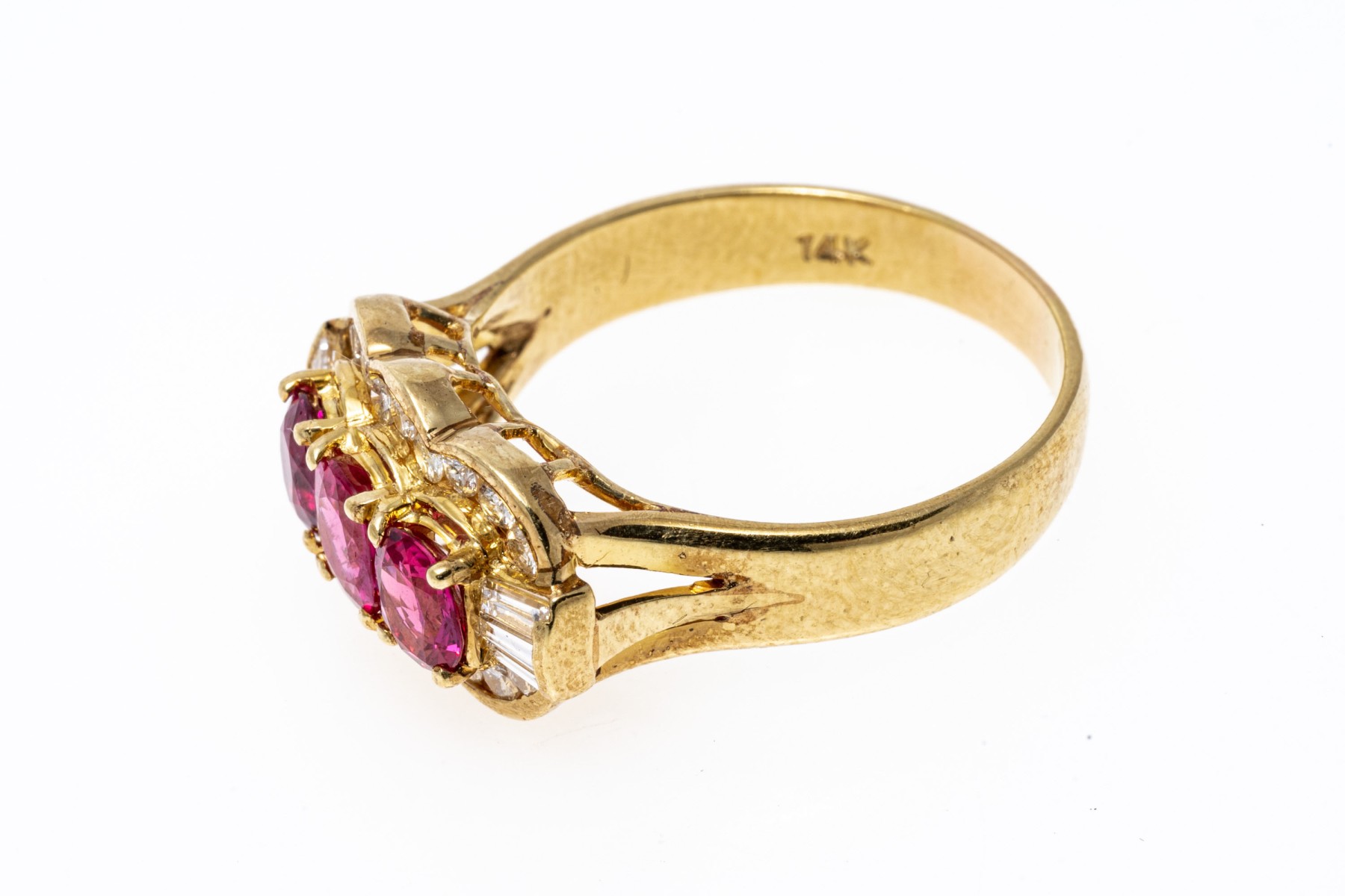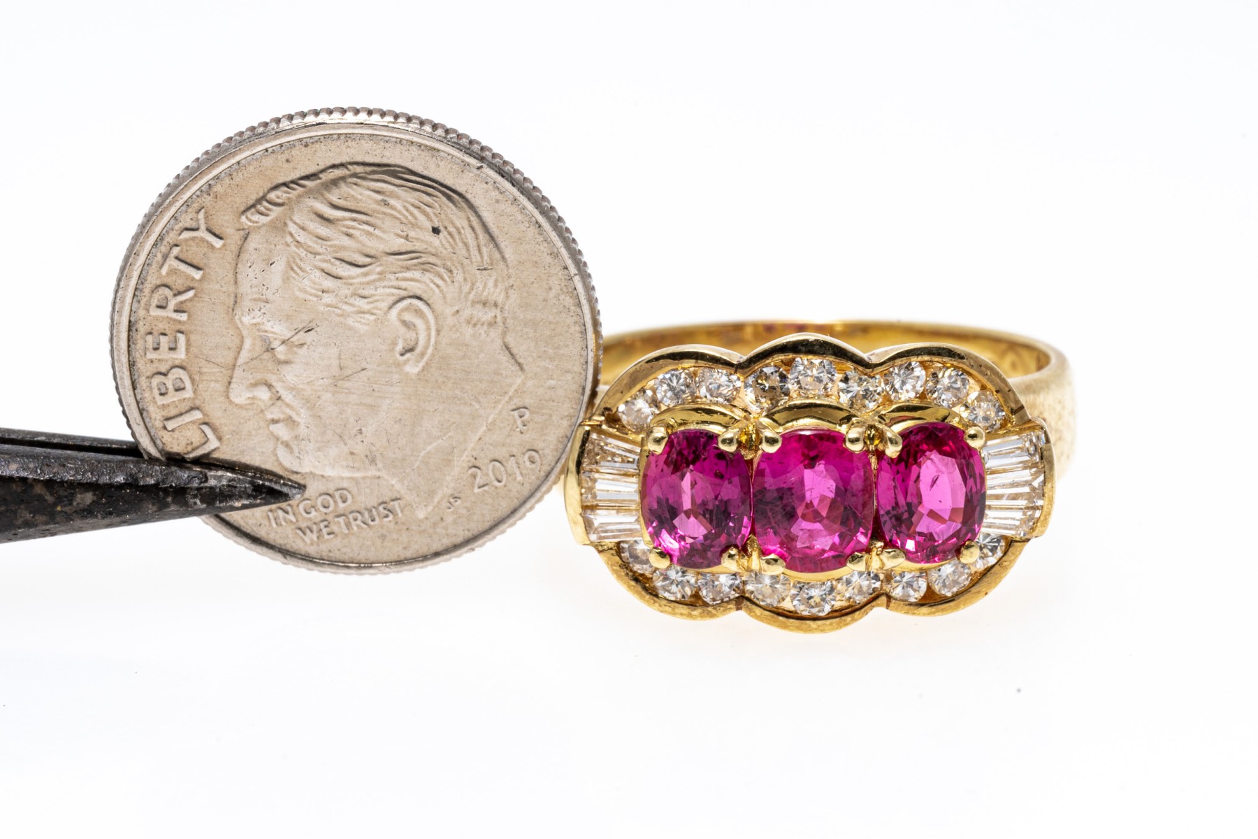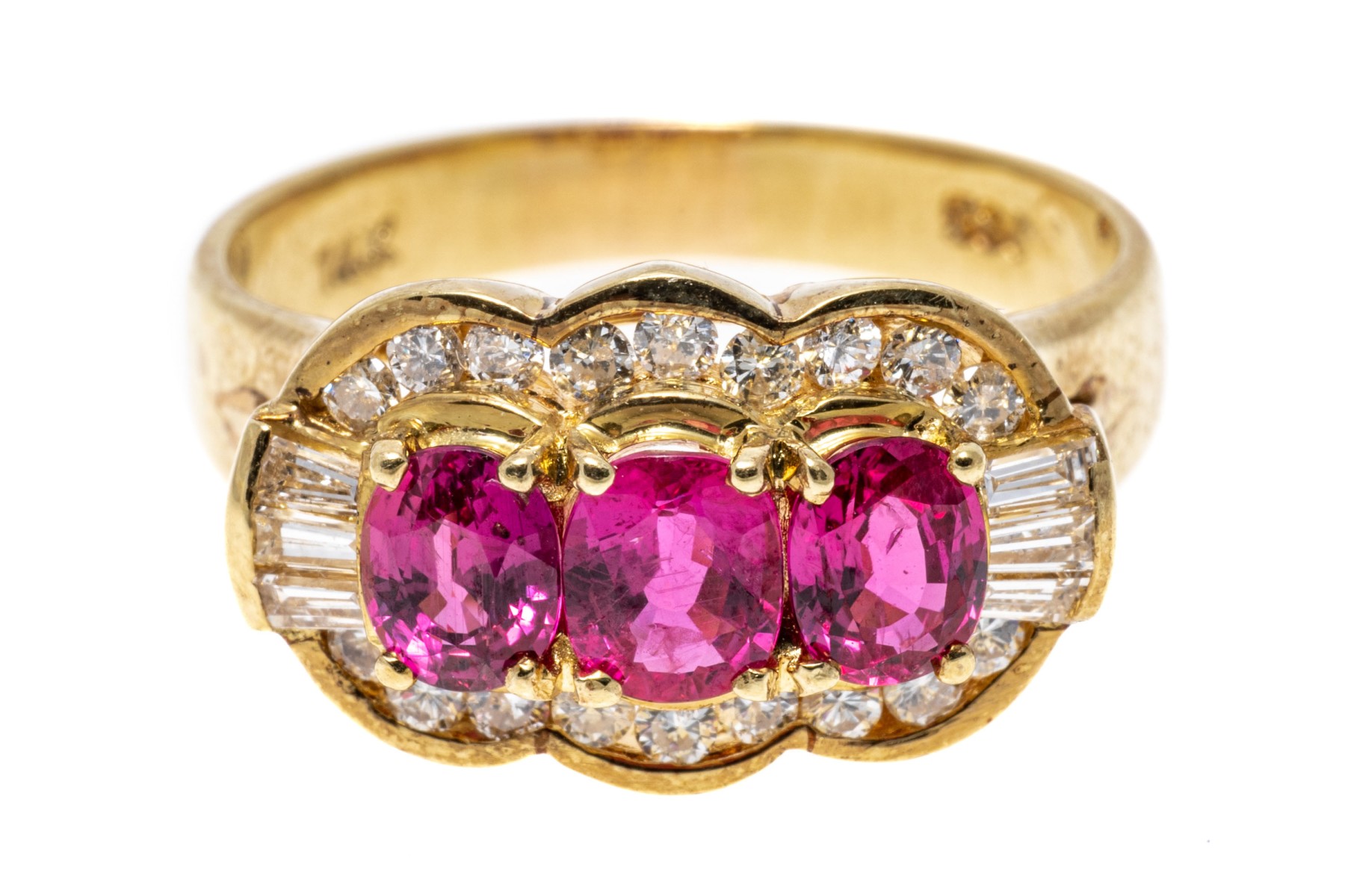 This 14K yellow gold ring is set with three oval faceted pink sapphires. Framing the sapphires are round and baguette cut diamonds for a bright shimmer. The sapphires are approximately 1.26 TCW, and the diamonds are approximately 0.61 TCW. Ring size 8.75+.