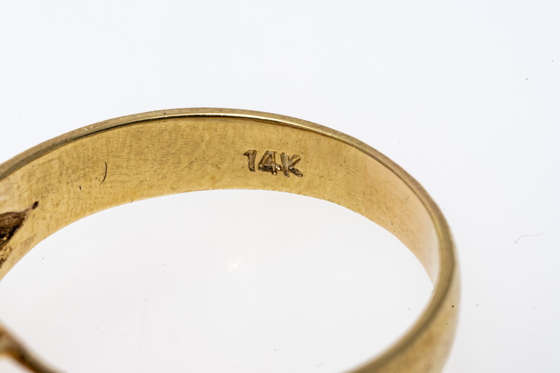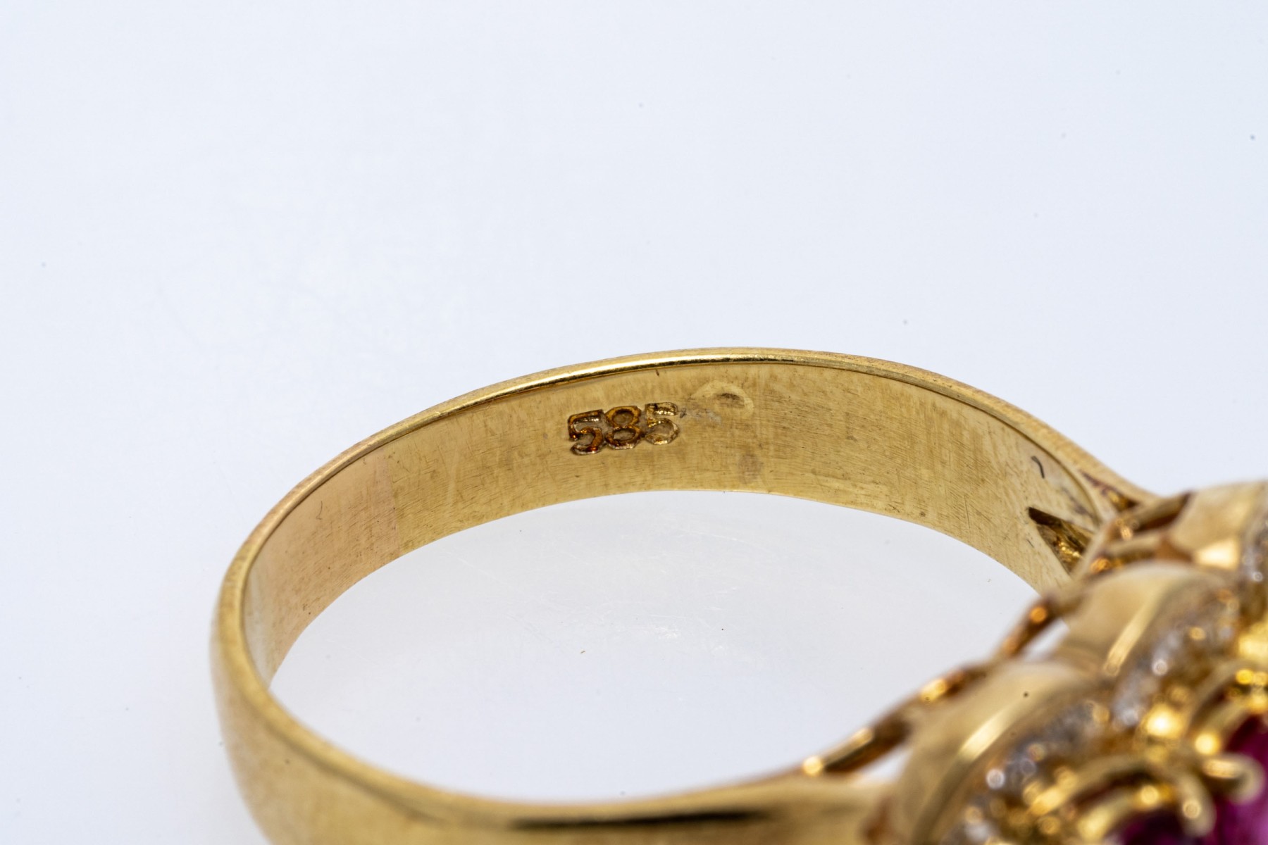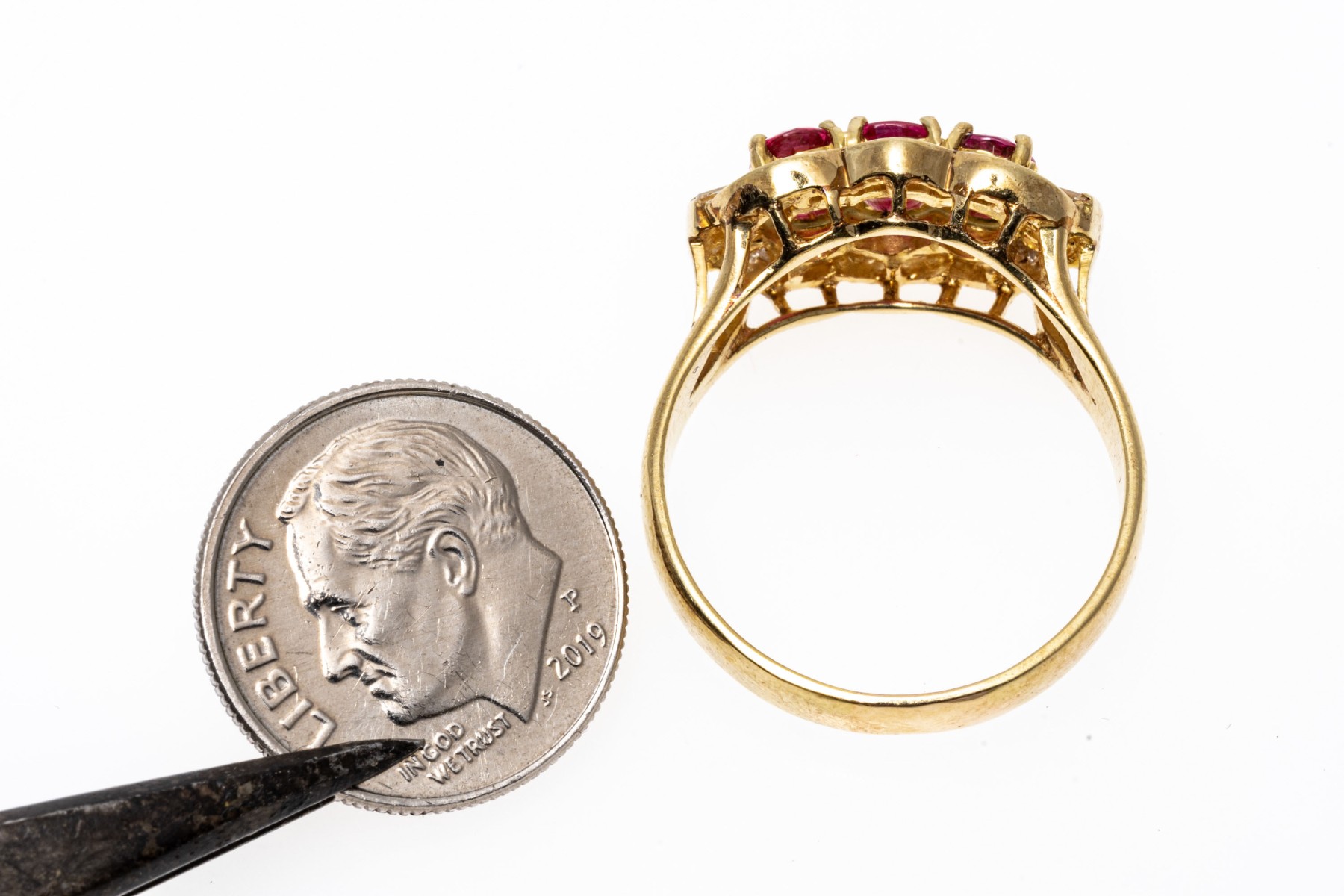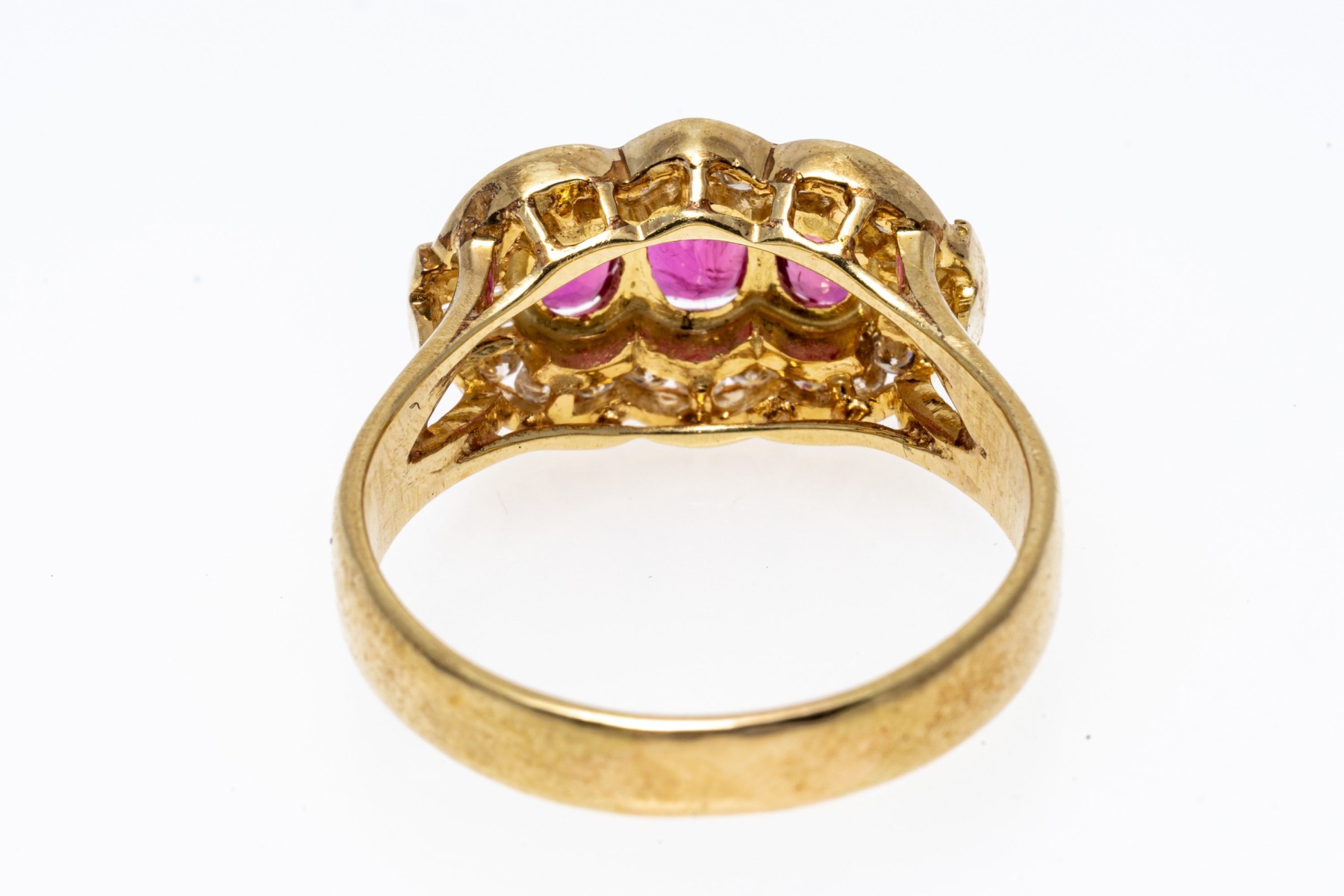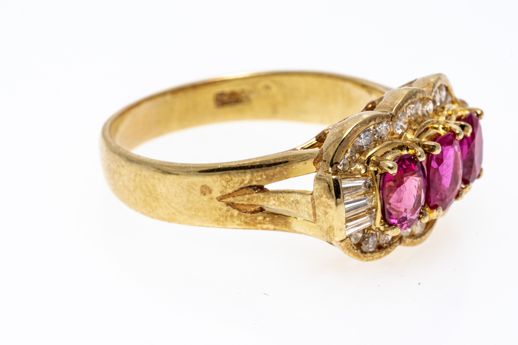 This 14K yellow gold ring is set with three oval faceted pink sapphires. Framing the sapphires are round and baguette cut diamonds for a bright shimmer. The sapphires are approximately 1.26 TCW, and the diamonds are approximately 0.61 TCW. Ring size 8.75+.
