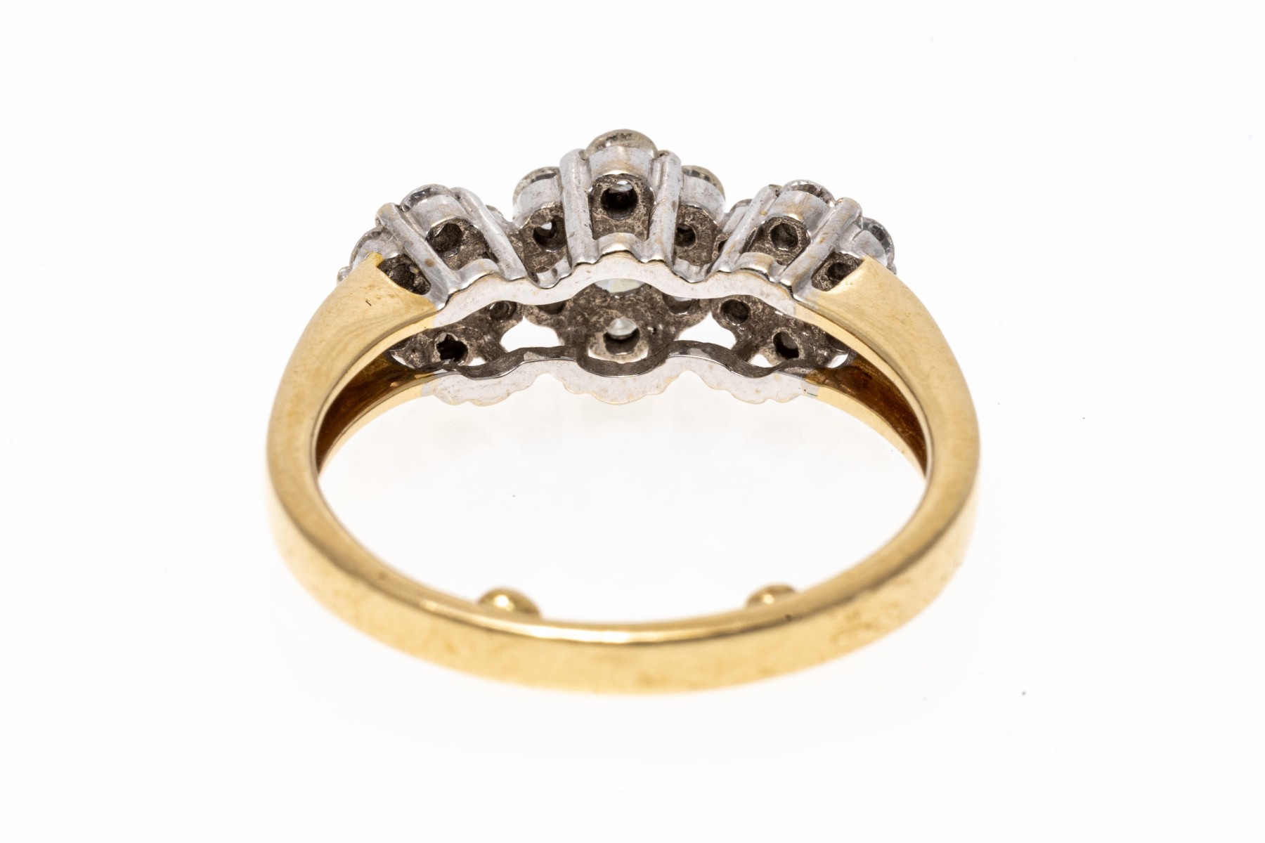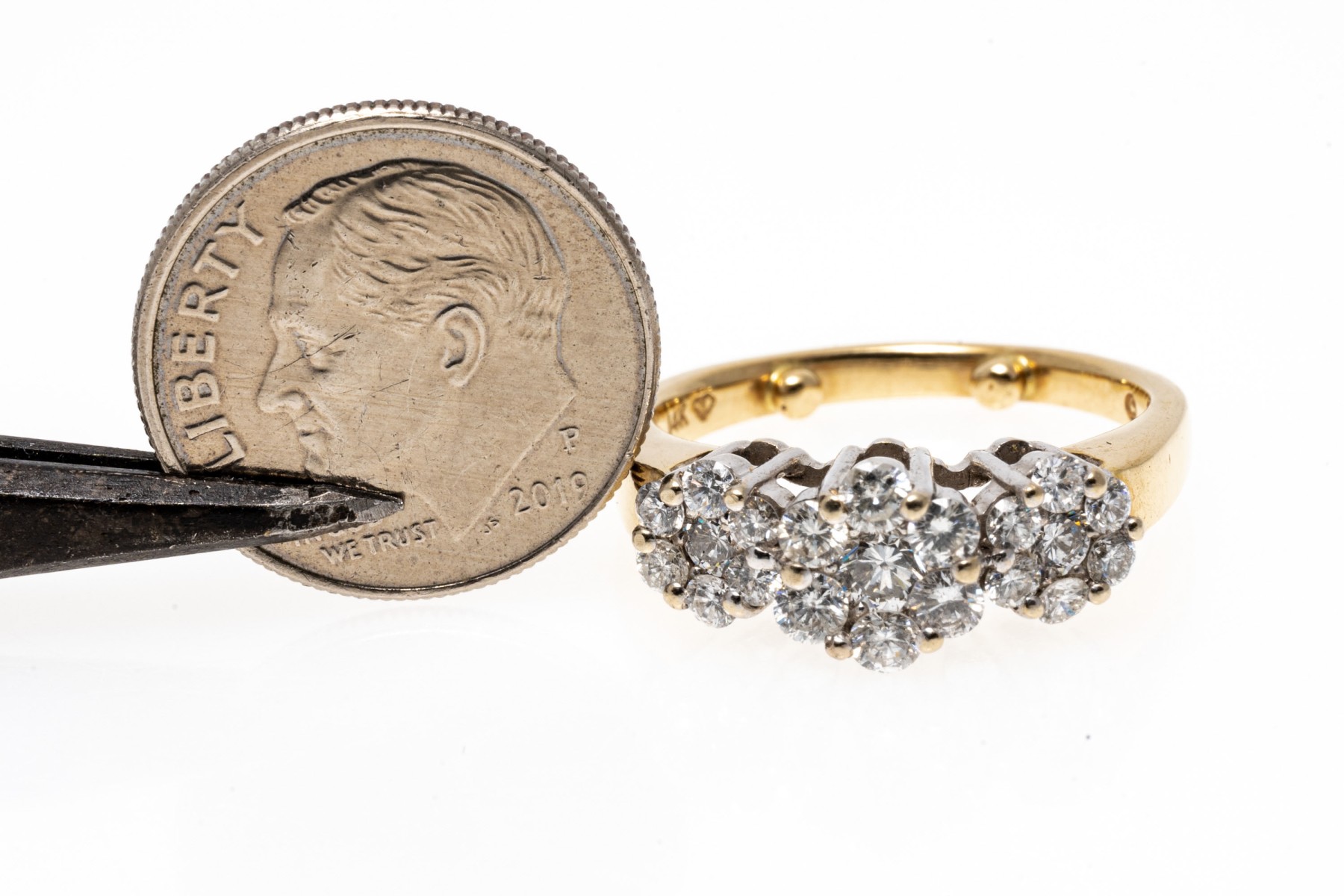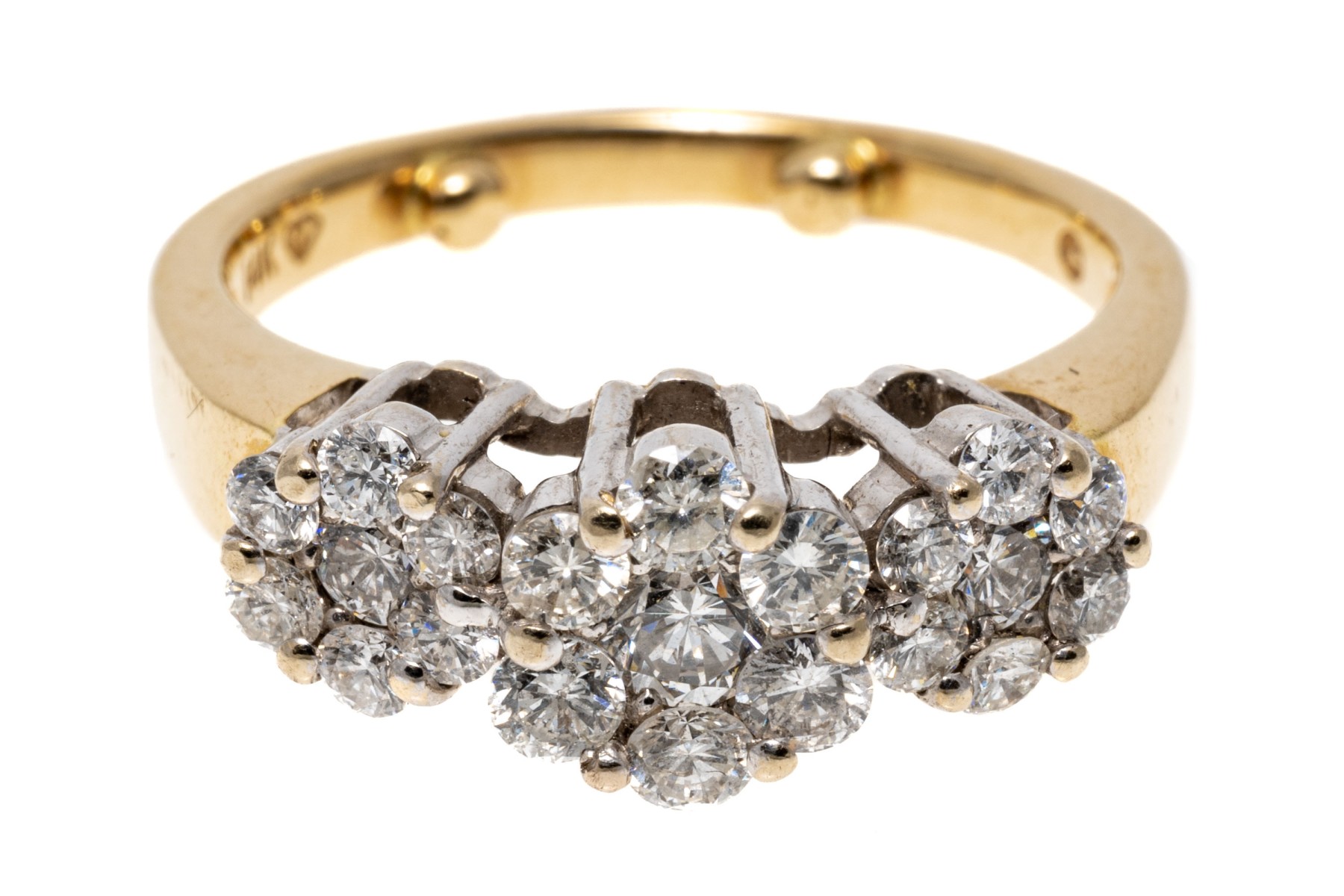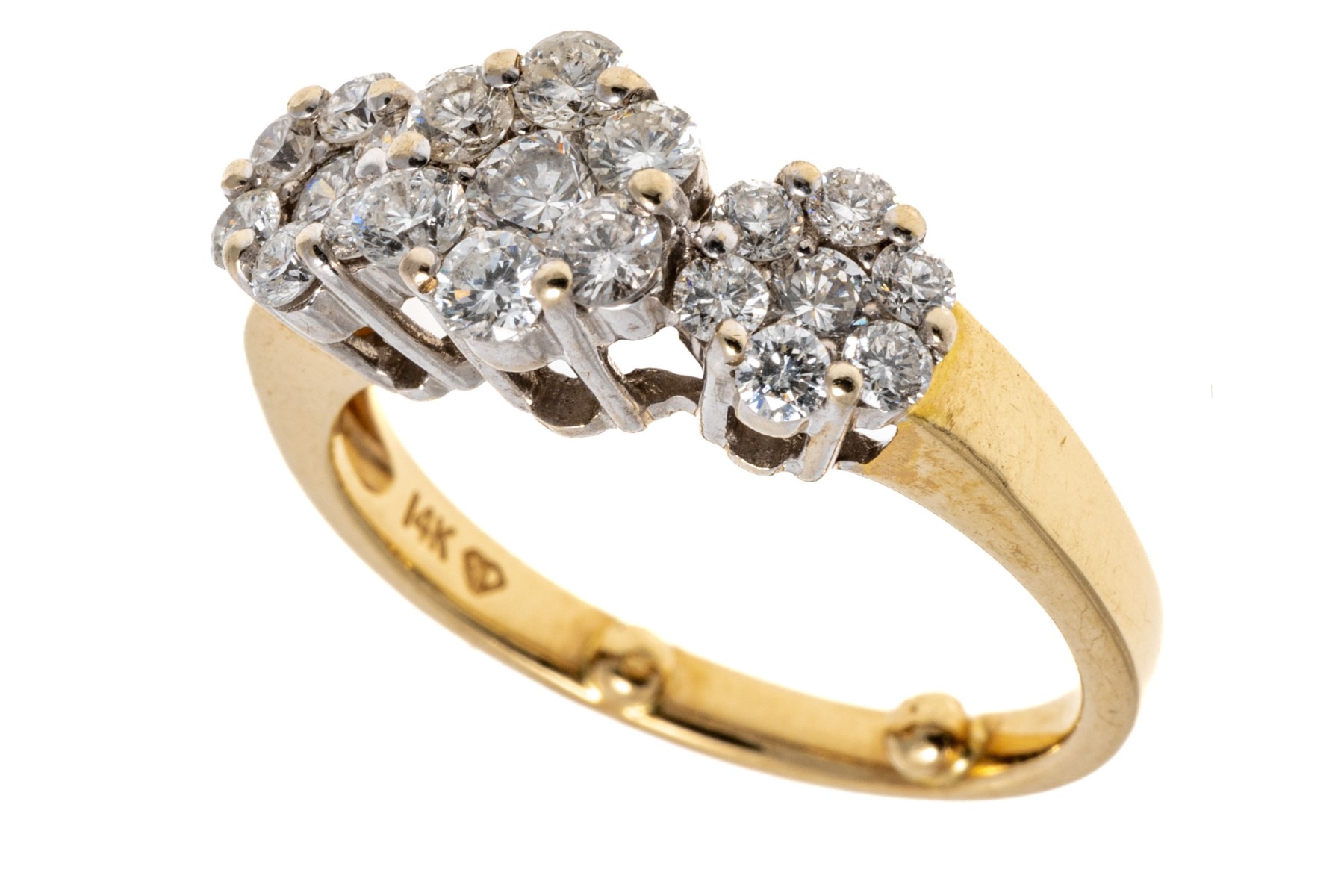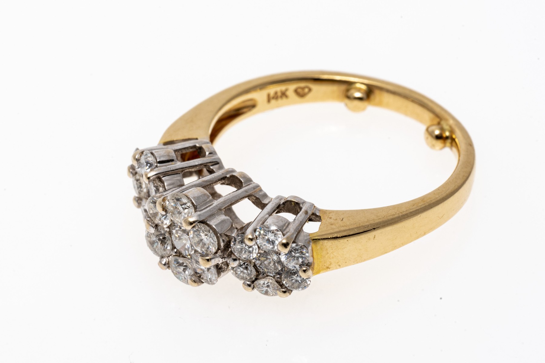 Charming 14K yellow gold ring. At the face of this ring are three clusters of round brilliant cut diamonds. These diamonds are approximately 0.88 TCW. Ring size 5.5 with the sizing beads.