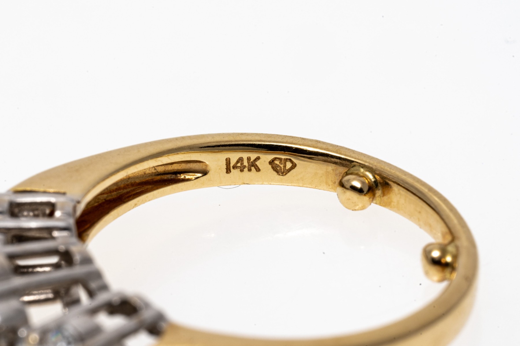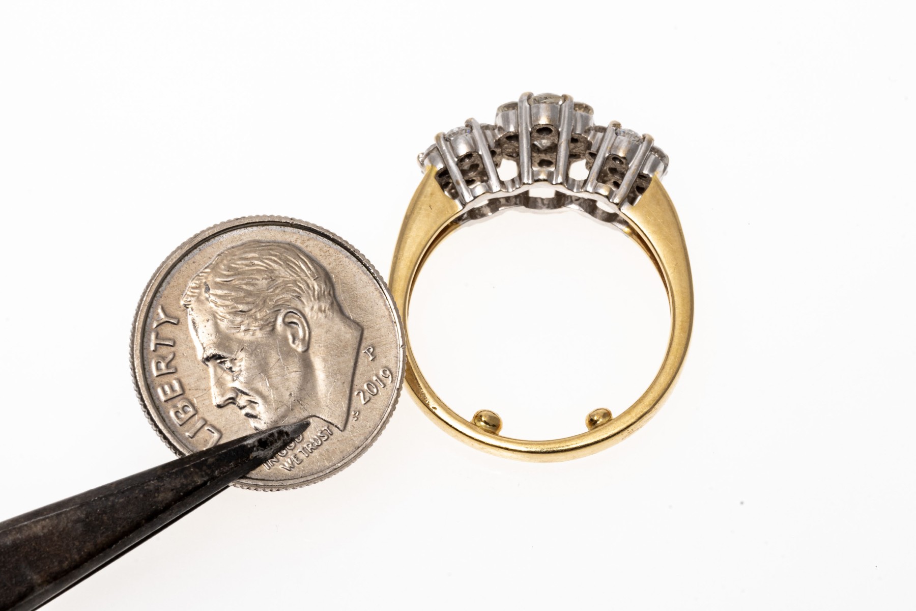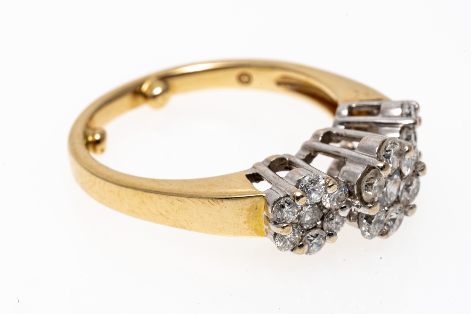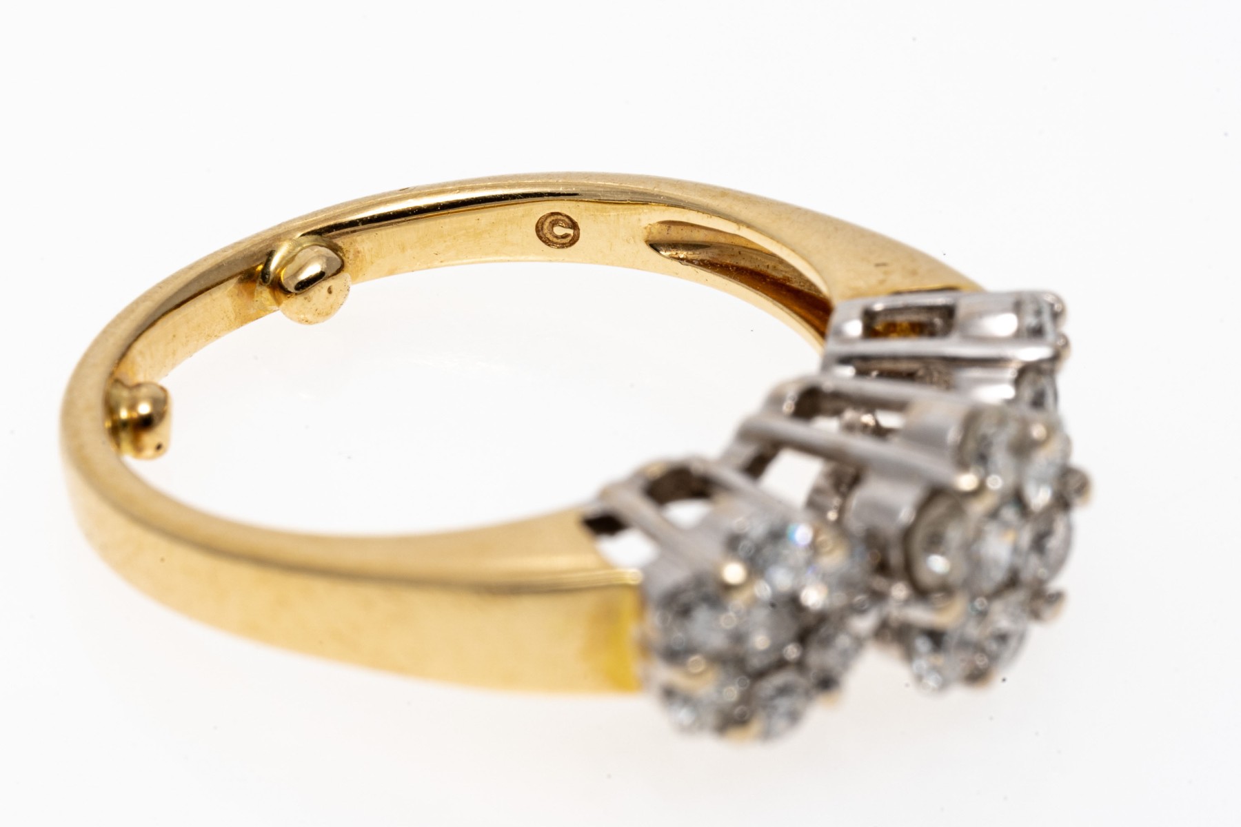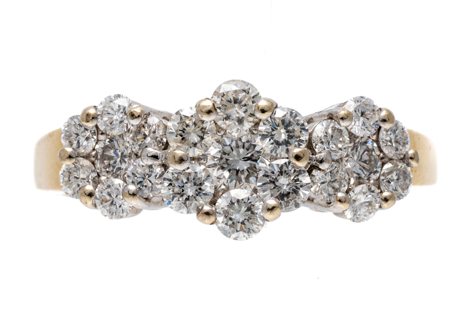 Charming 14K yellow gold ring. At the face of this ring are three clusters of round brilliant cut diamonds. These diamonds are approximately 0.88 TCW. Ring size 5.5 with the sizing beads.