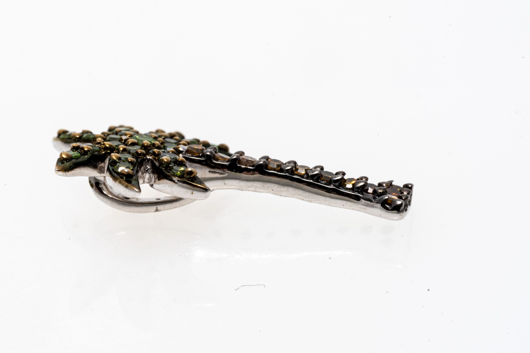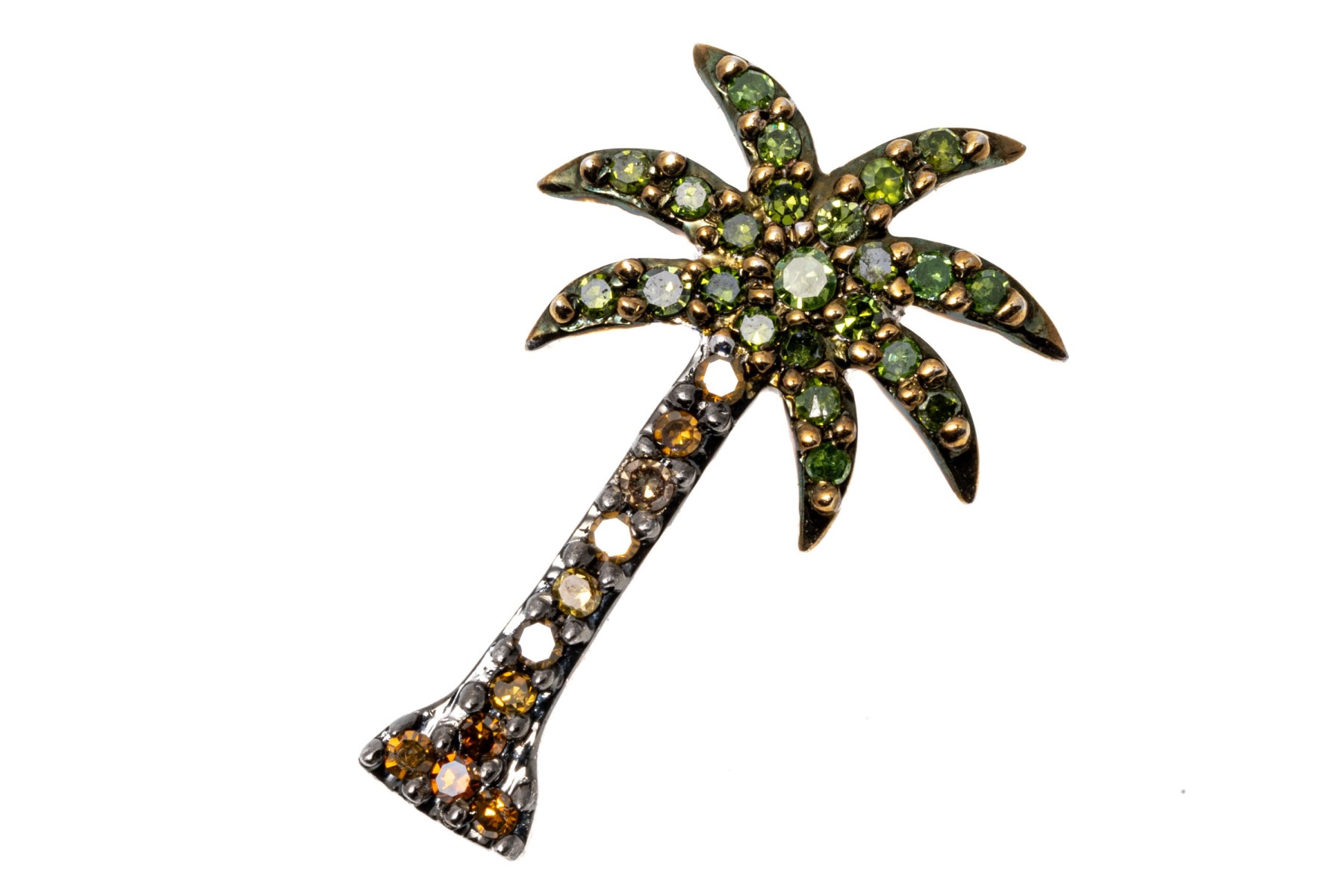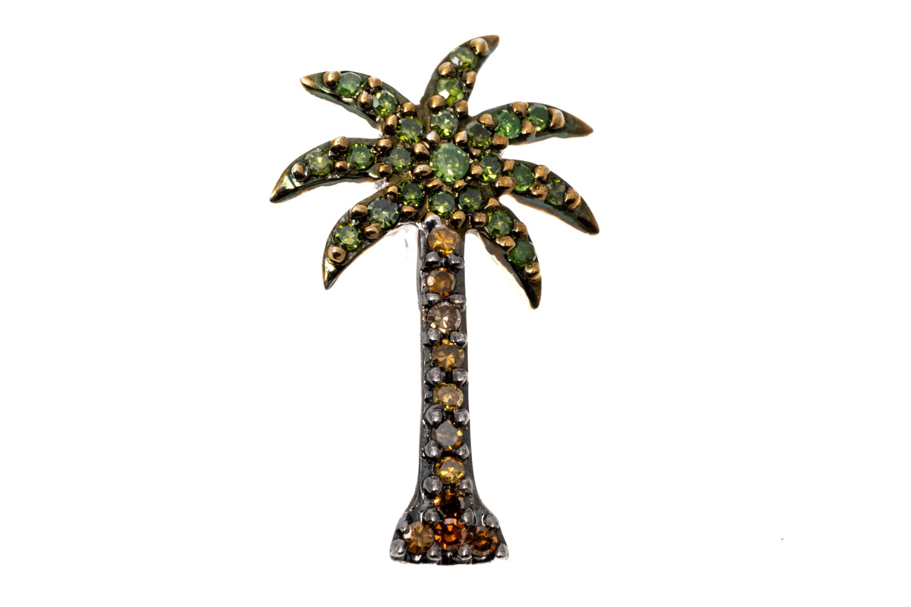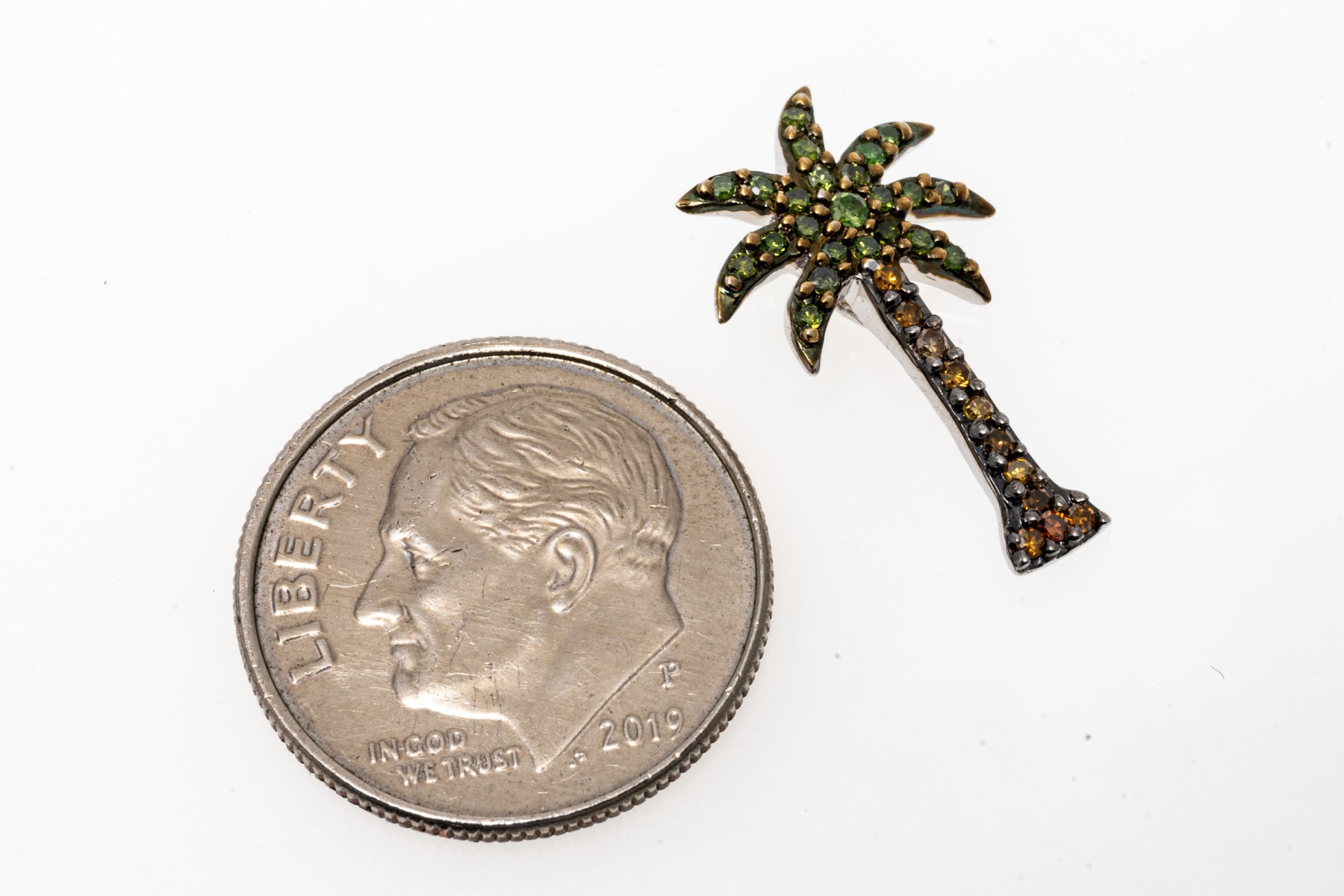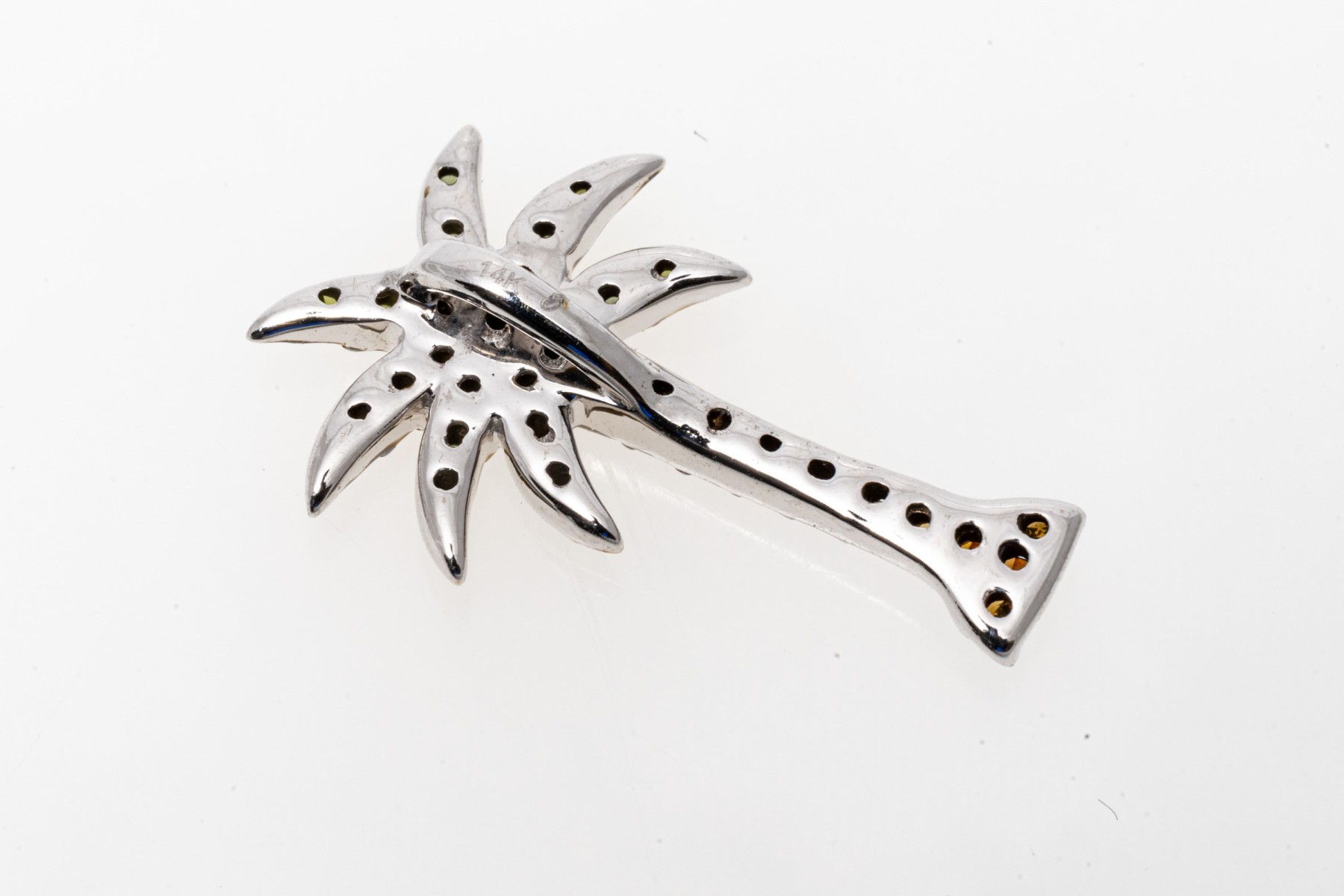 Charming 14K white gold pendant. This palm tree pendant is pave set with round cut green diamonds in the leaves and brown diamonds in the trunk. The diamonds are approximately 0.2 TCW.