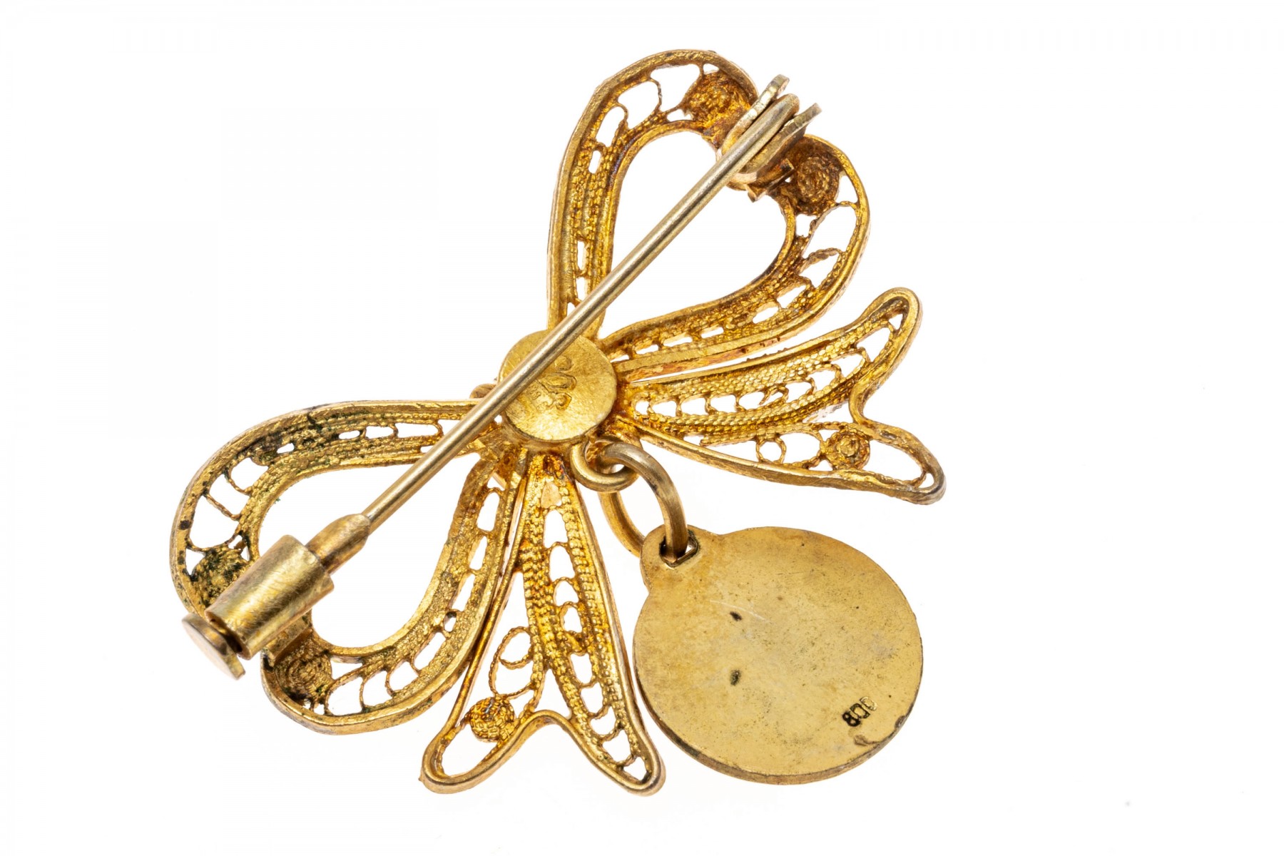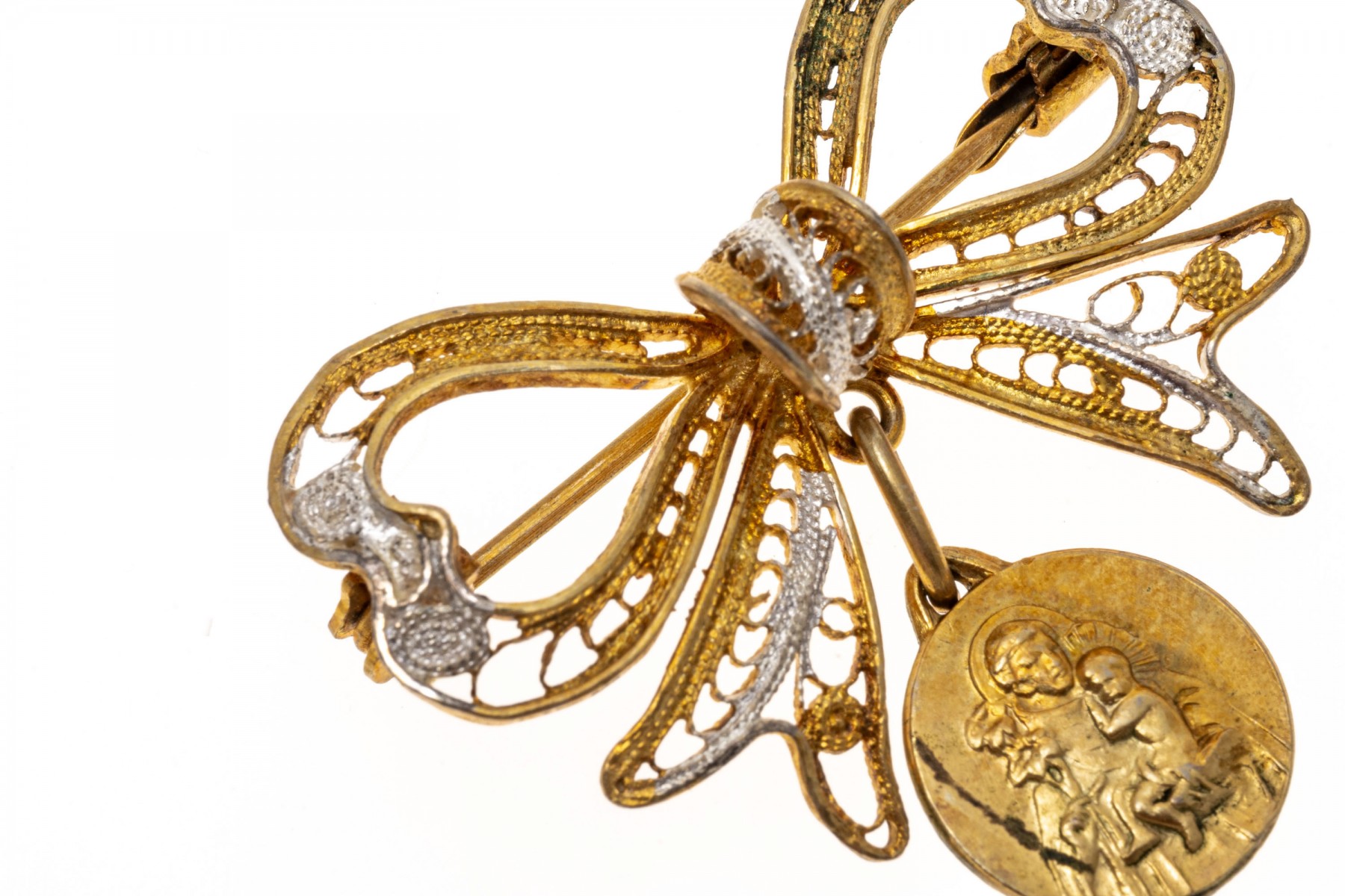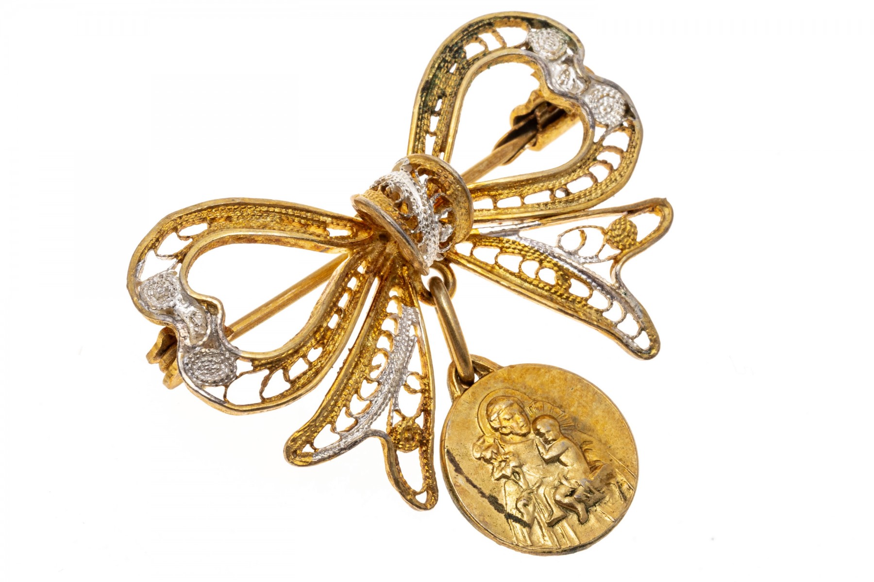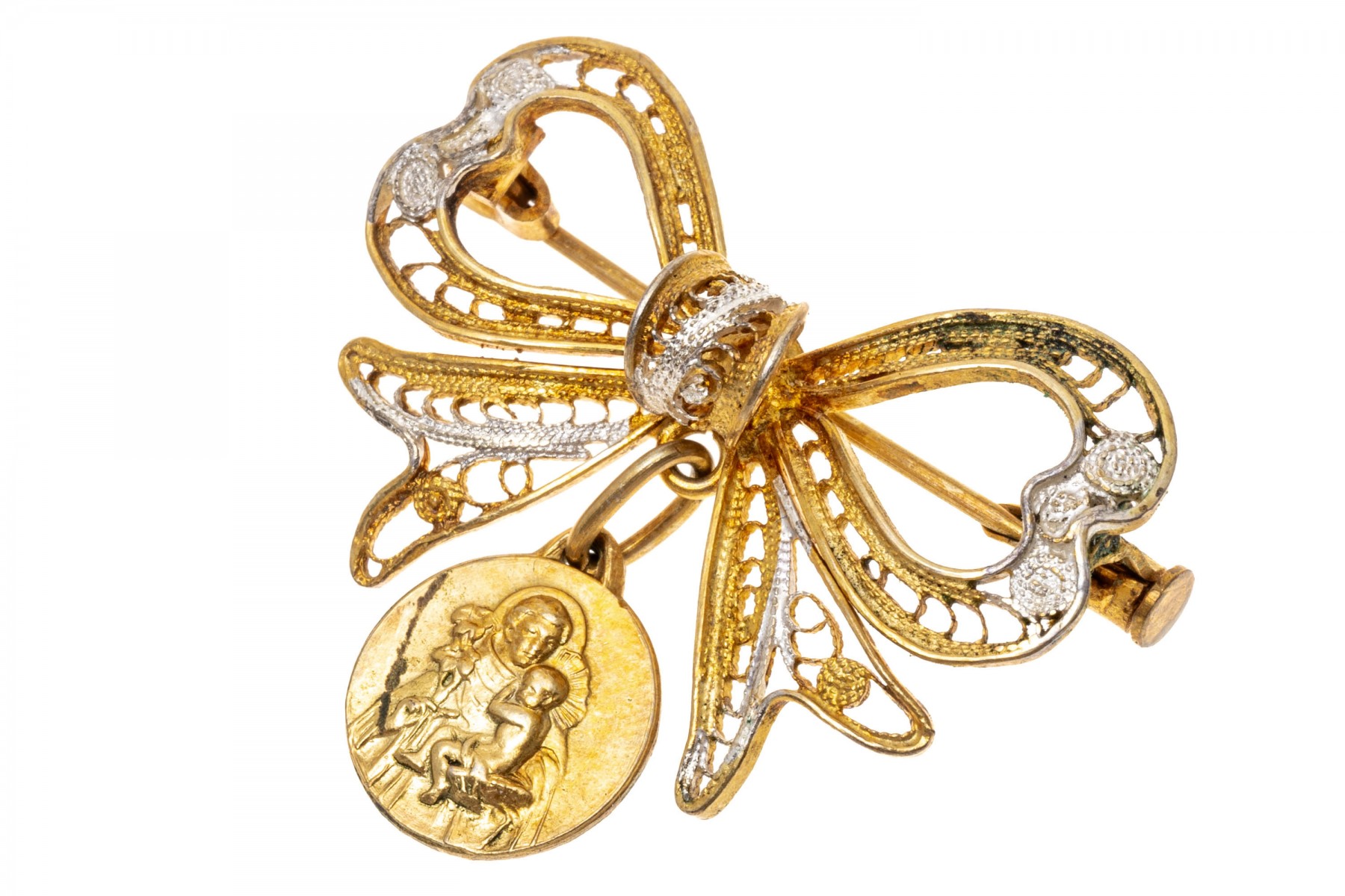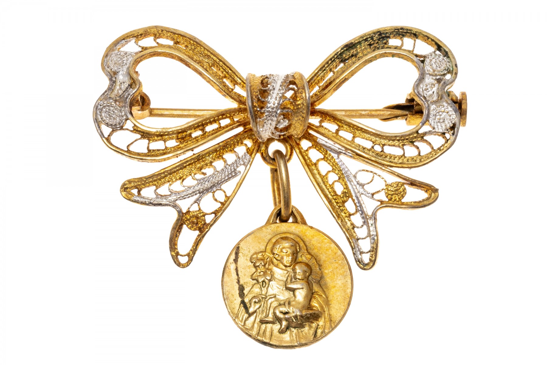 This charming bow shaped brooch has been created from 800 silver and features an open filigree design. Suspended from the brooch is a mother and child medallion.