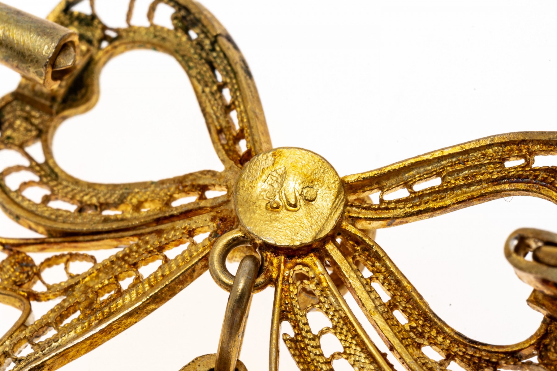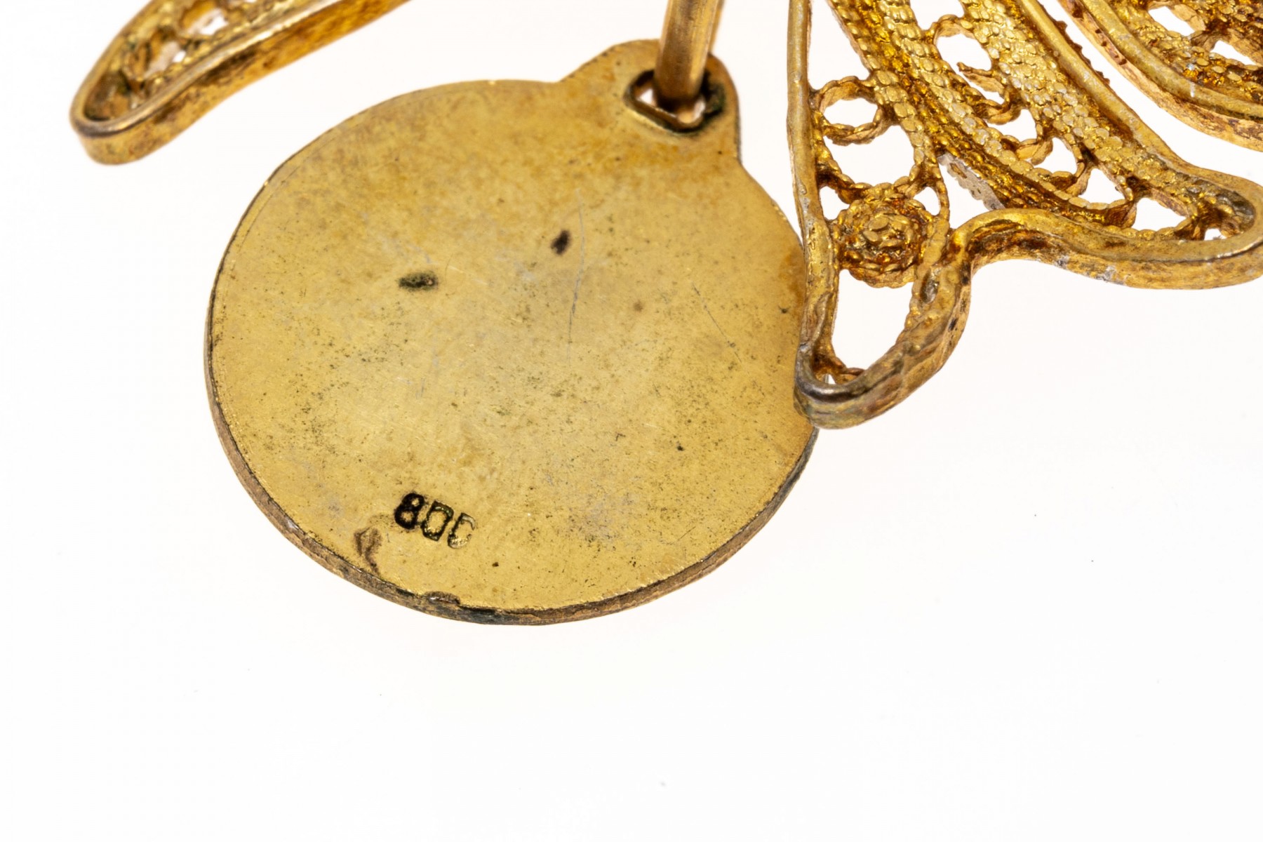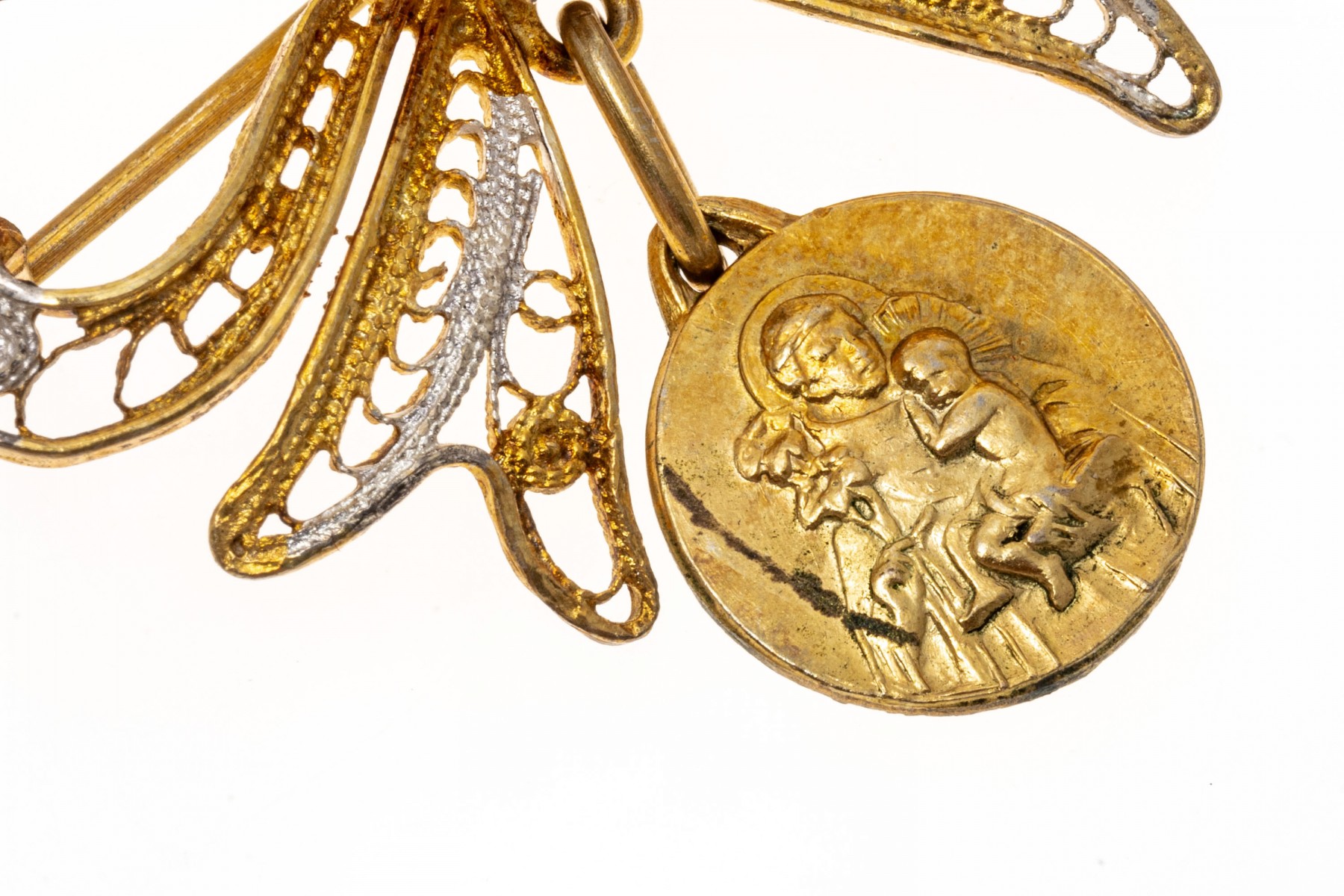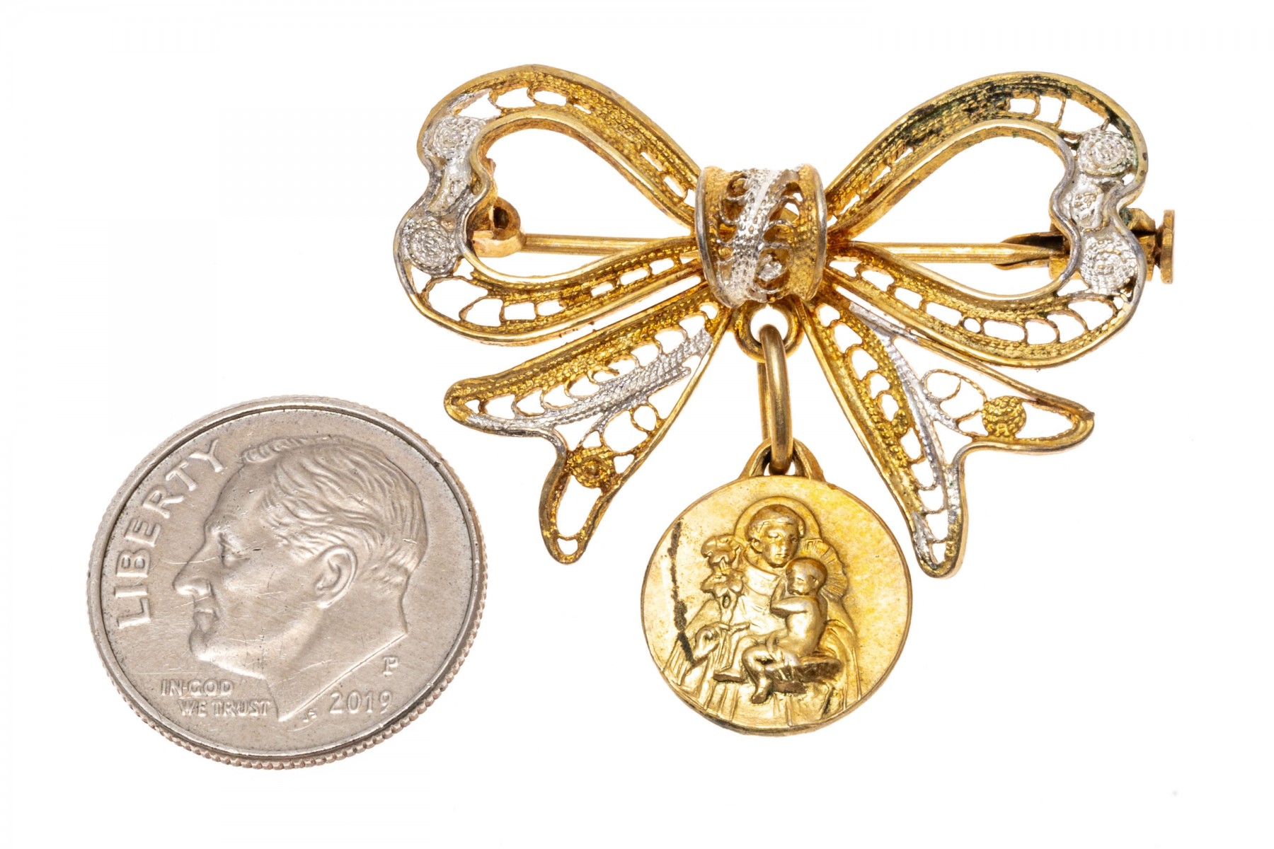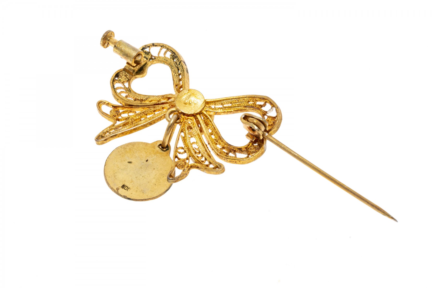 This charming bow shaped brooch has been created from 800 silver and features an open filigree design. Suspended from the brooch is a mother and child medallion.
