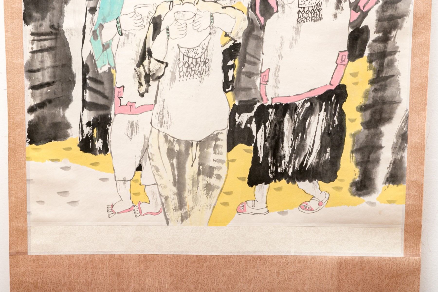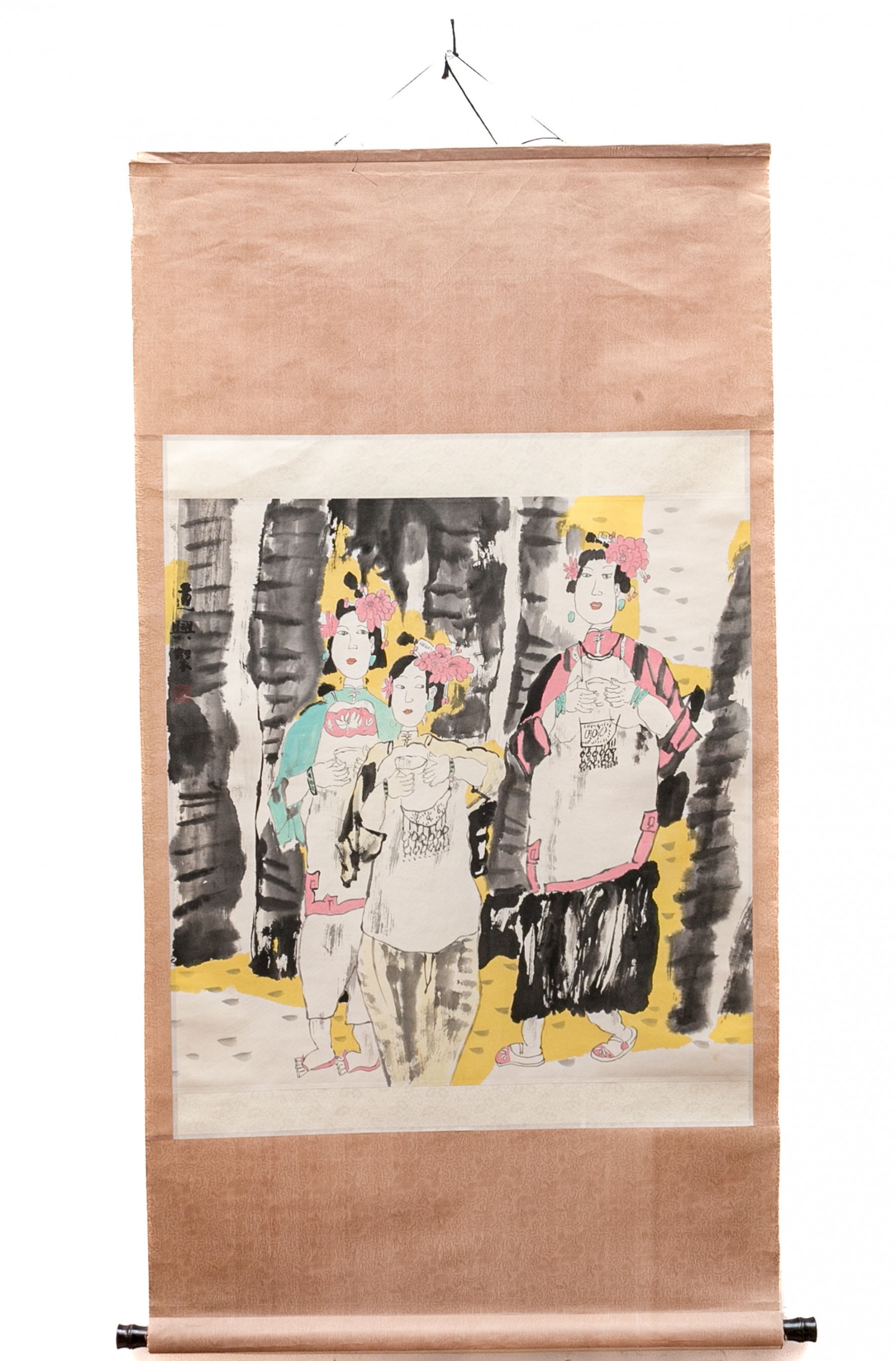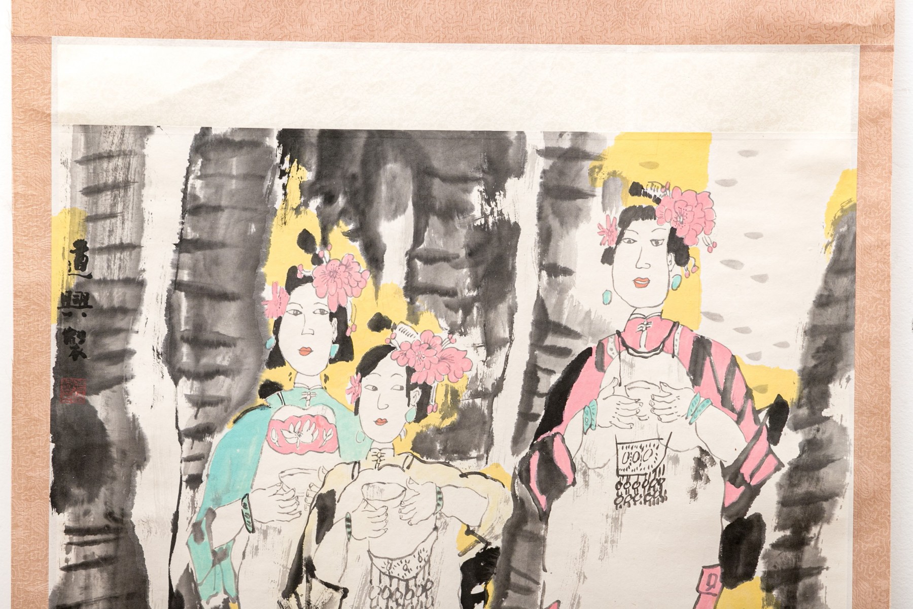 A charming Asian ink scroll painting depicting three fashionable women. They stand holding tea bowls, wearing vibrant teal and pink with large flowers in their hair. Signed upper left. The painting is mounted to a paper scroll with white and warm-toned light brown jacquard.
