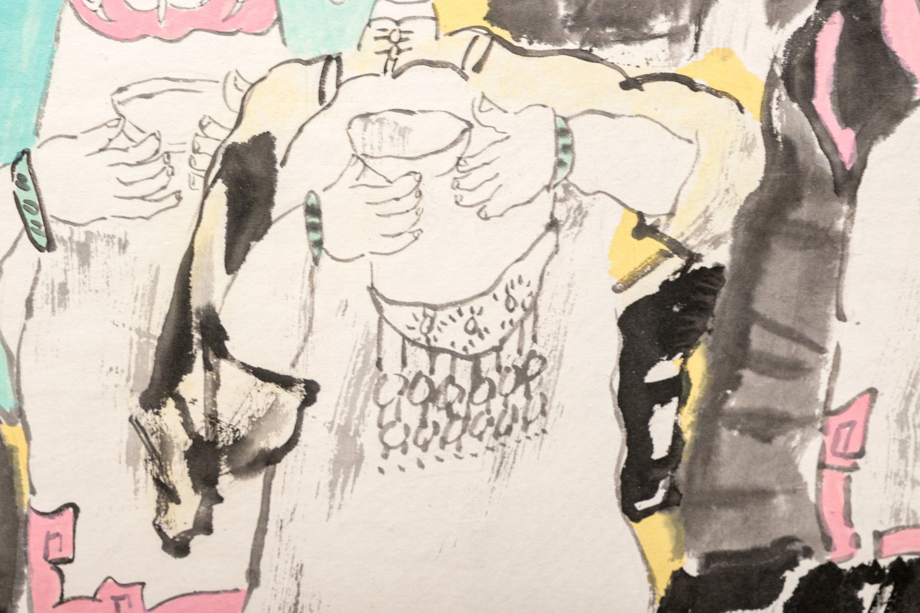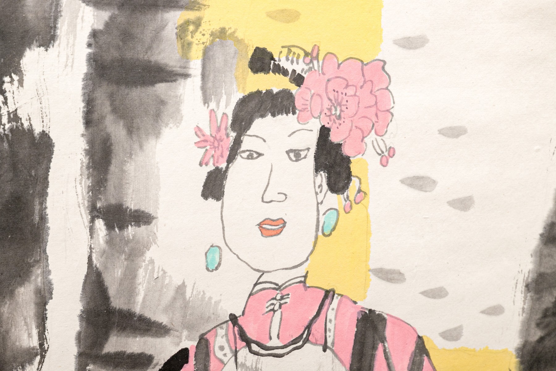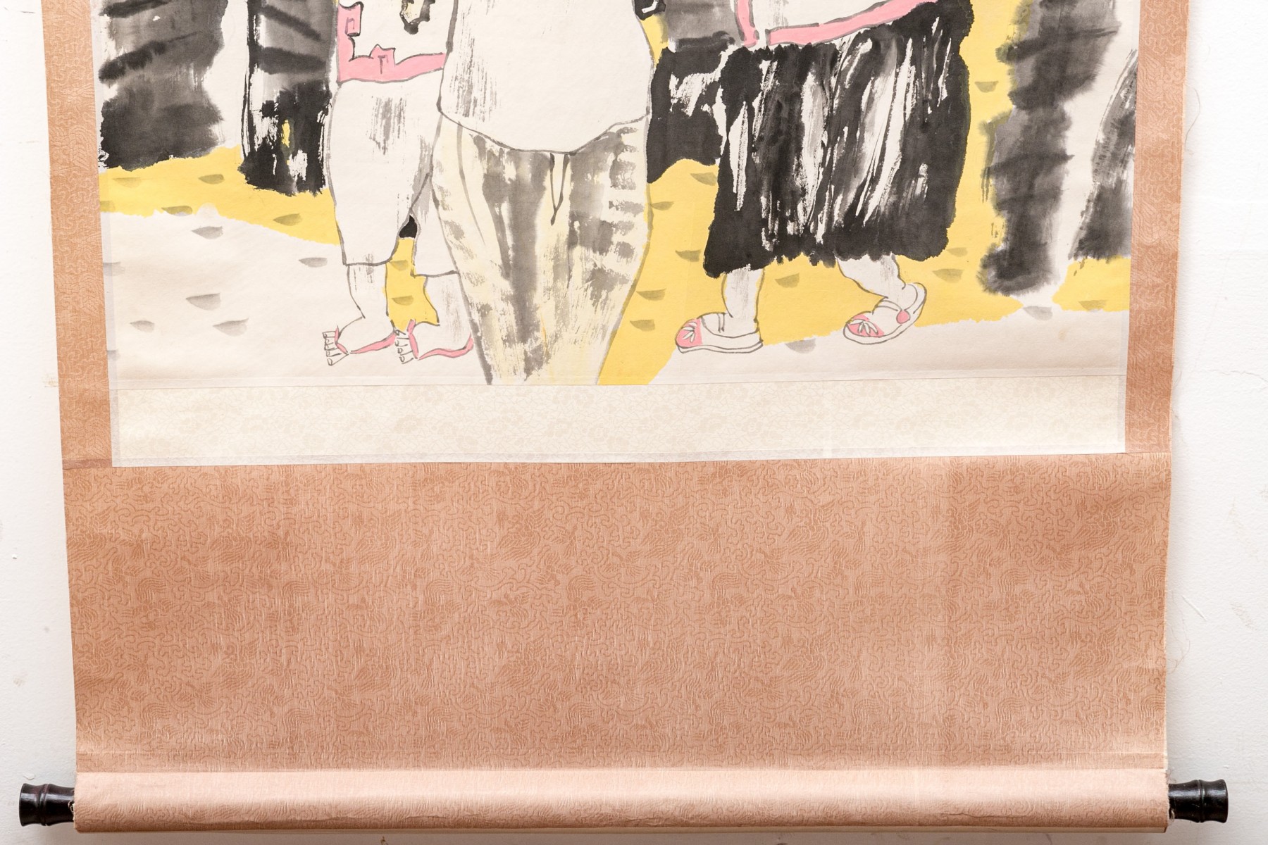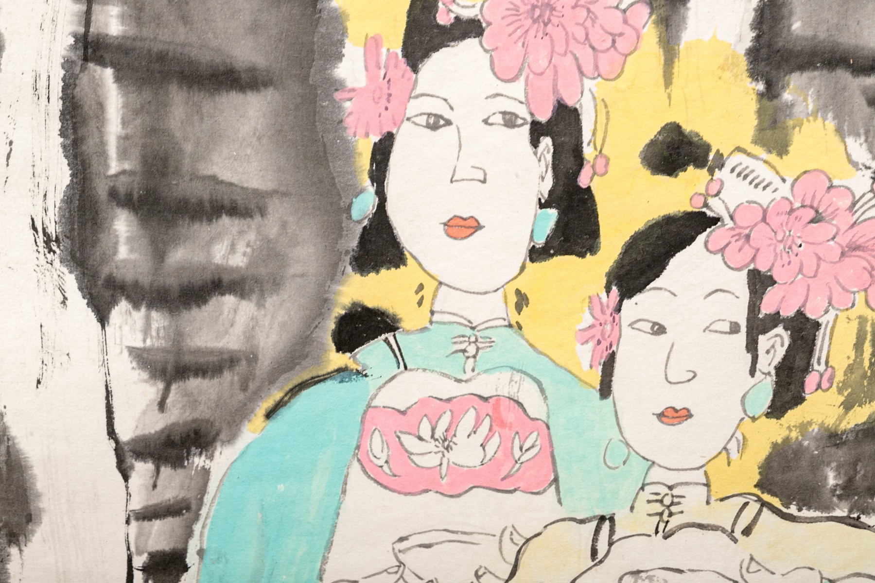 A charming Asian ink scroll painting depicting three fashionable women. They stand holding tea bowls, wearing vibrant teal and pink with large flowers in their hair. Signed upper left. The painting is mounted to a paper scroll with white and warm-toned light brown jacquard.