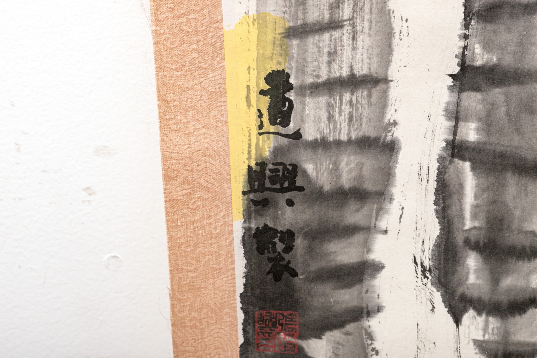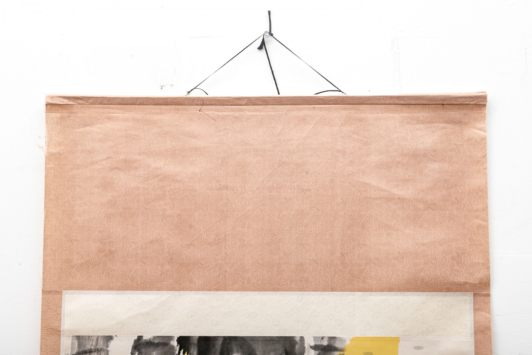 Displays well with light discoloration, light wrinkling. A small tear to the back of the top rod around a staple, that does not affect the outward appearance.