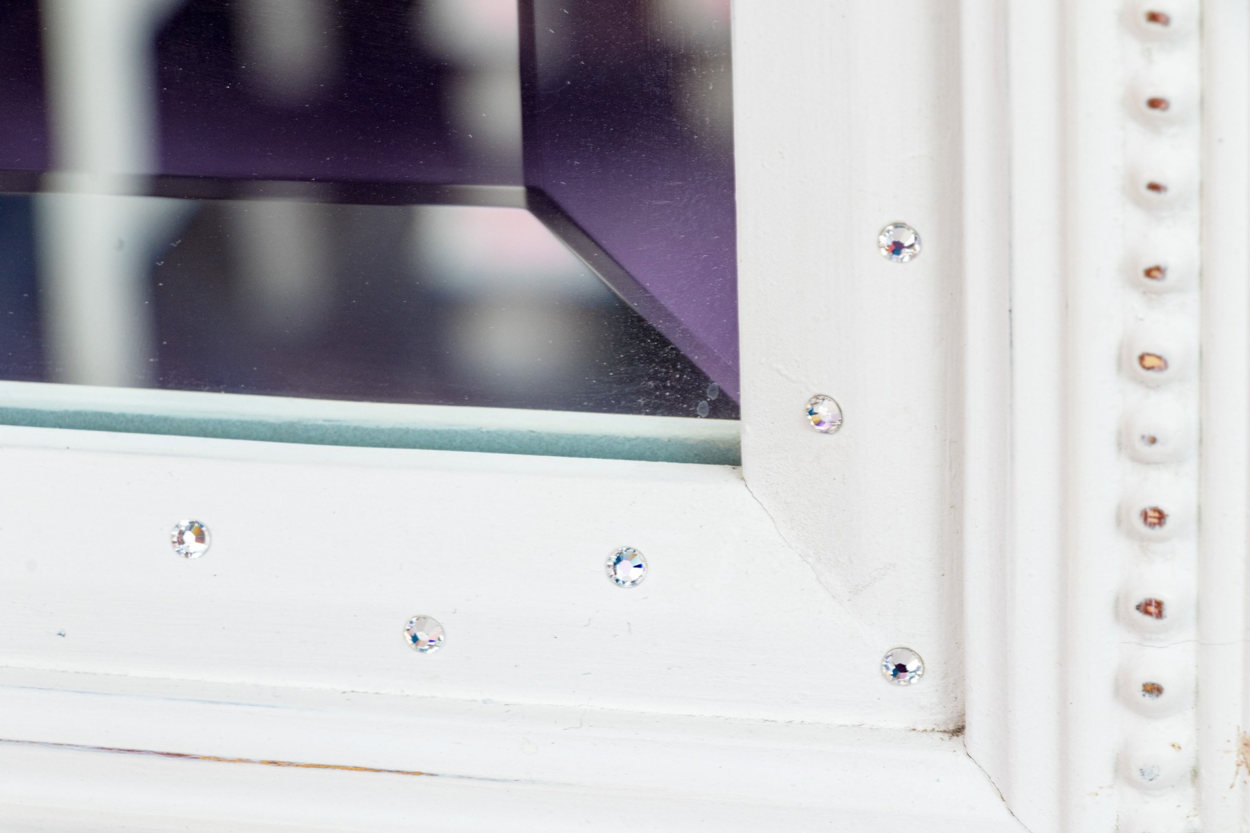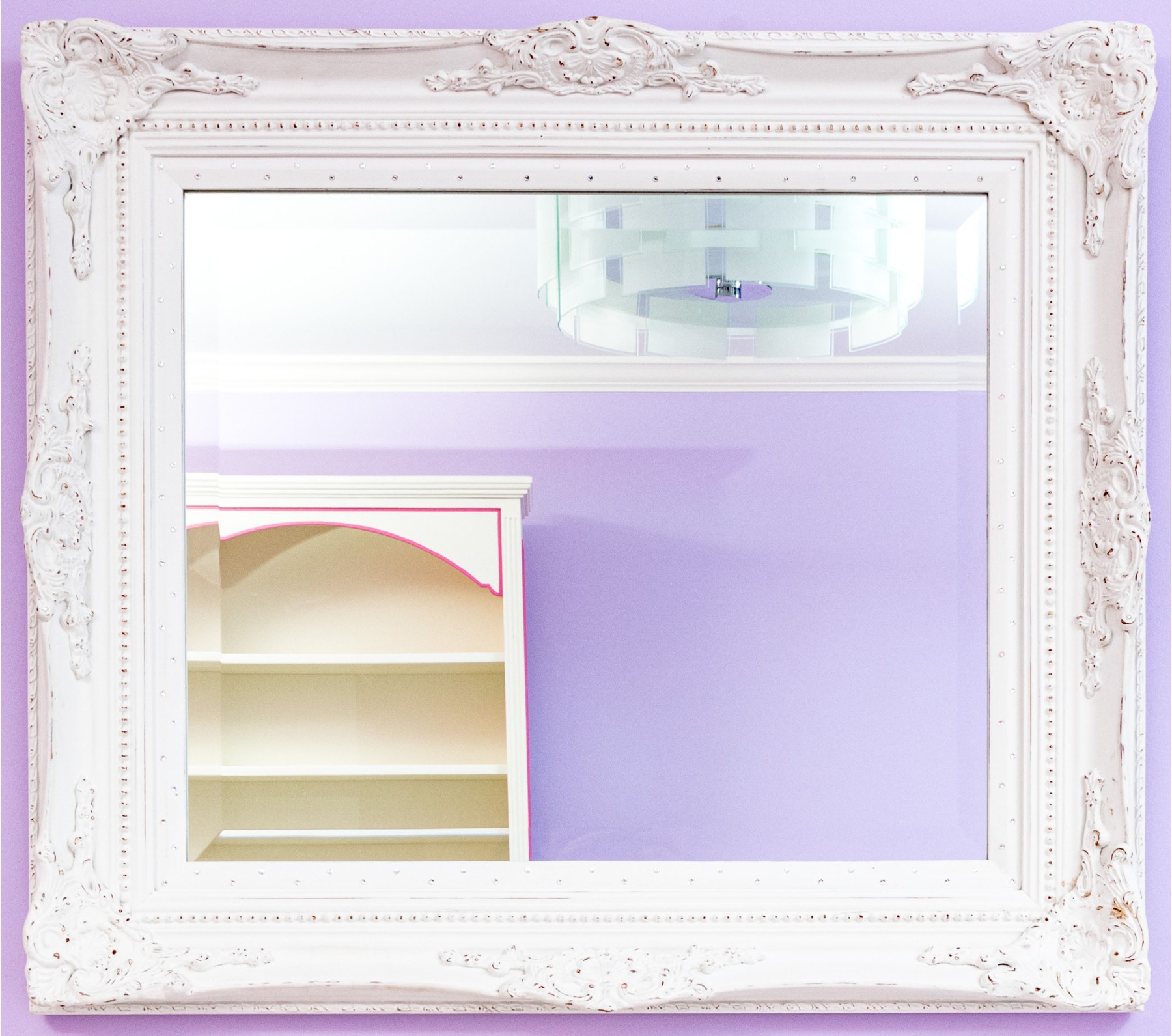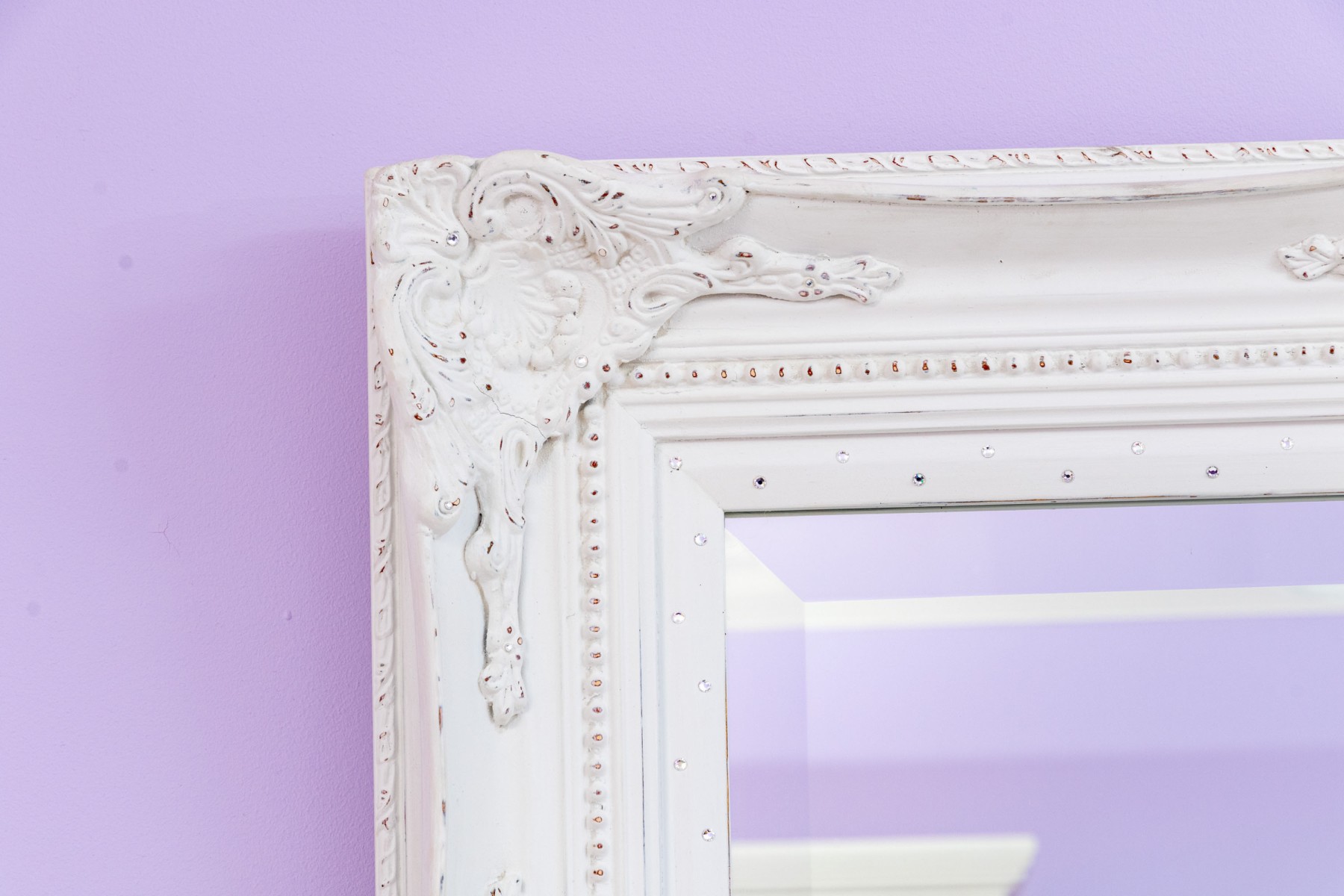 A charming rectangular beveled mirror in a white painted French provincial style frame with beaded trims and scrolled relief around the corners. Made chic with bedazzled rhinestones along the inner border.