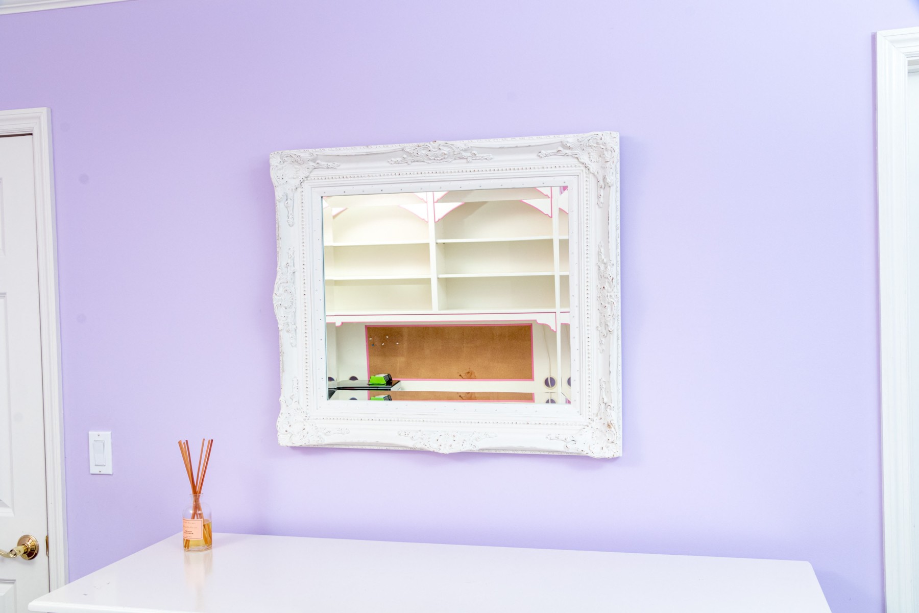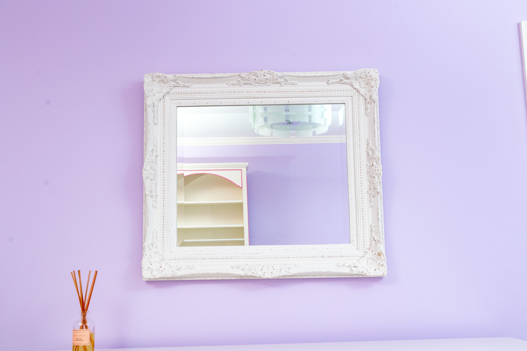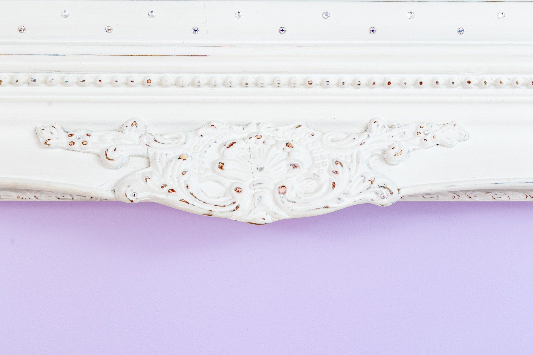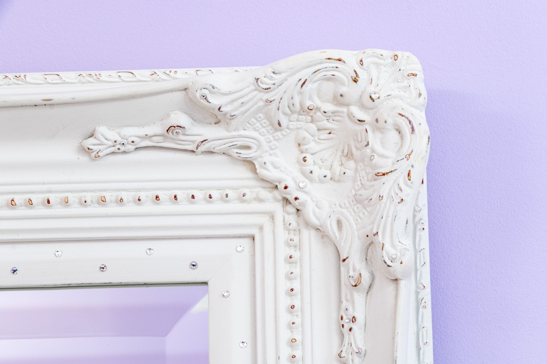 A charming rectangular beveled mirror in a white painted French provincial style frame with beaded trims and scrolled relief around the corners. Made chic with bedazzled rhinestones along the inner border.