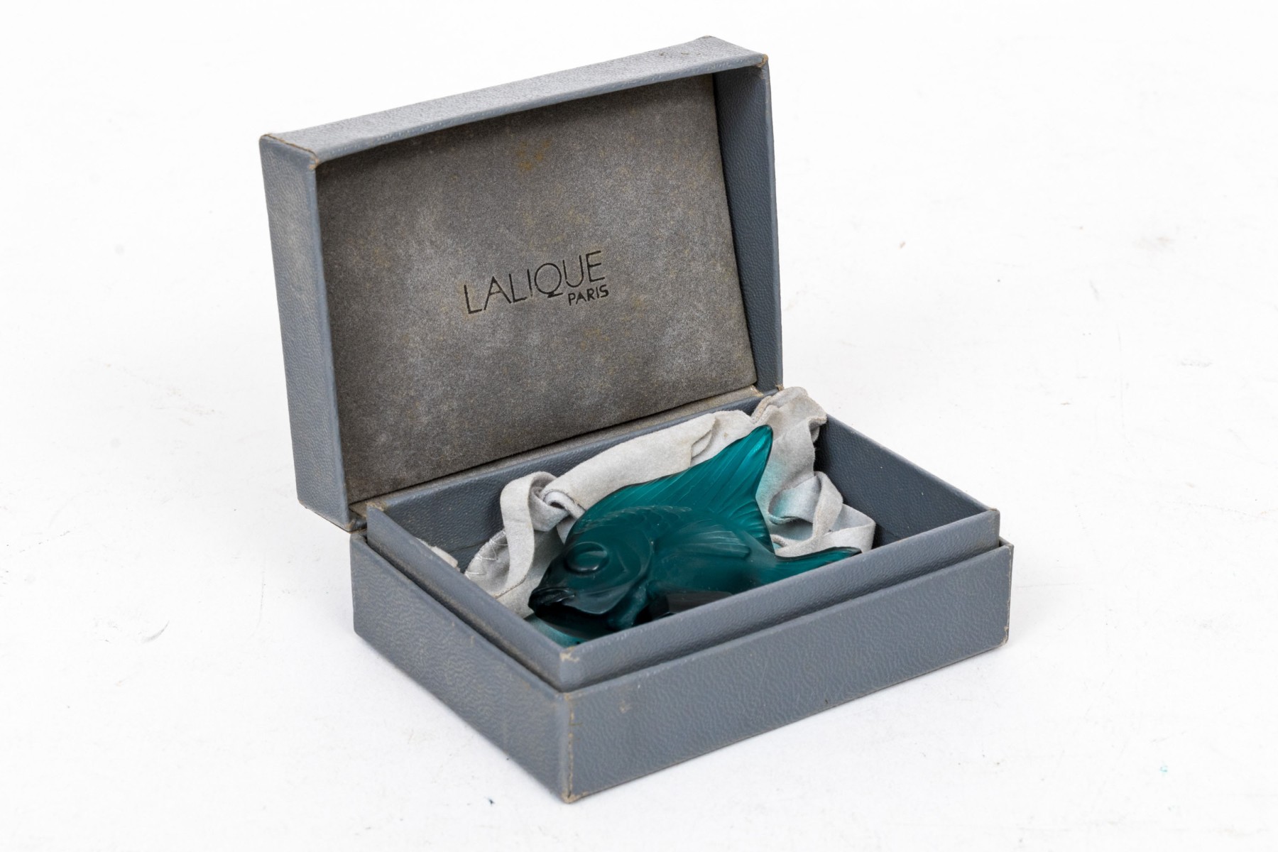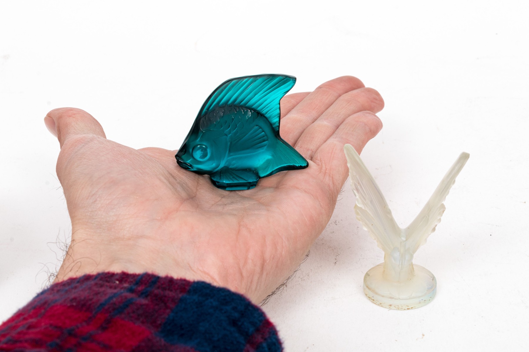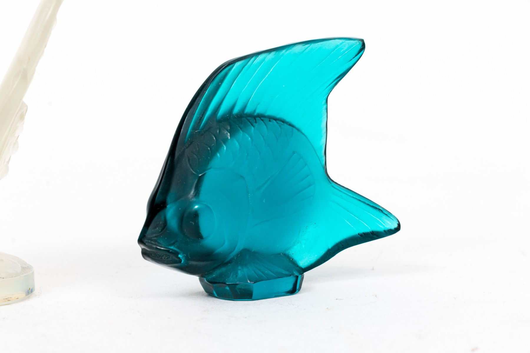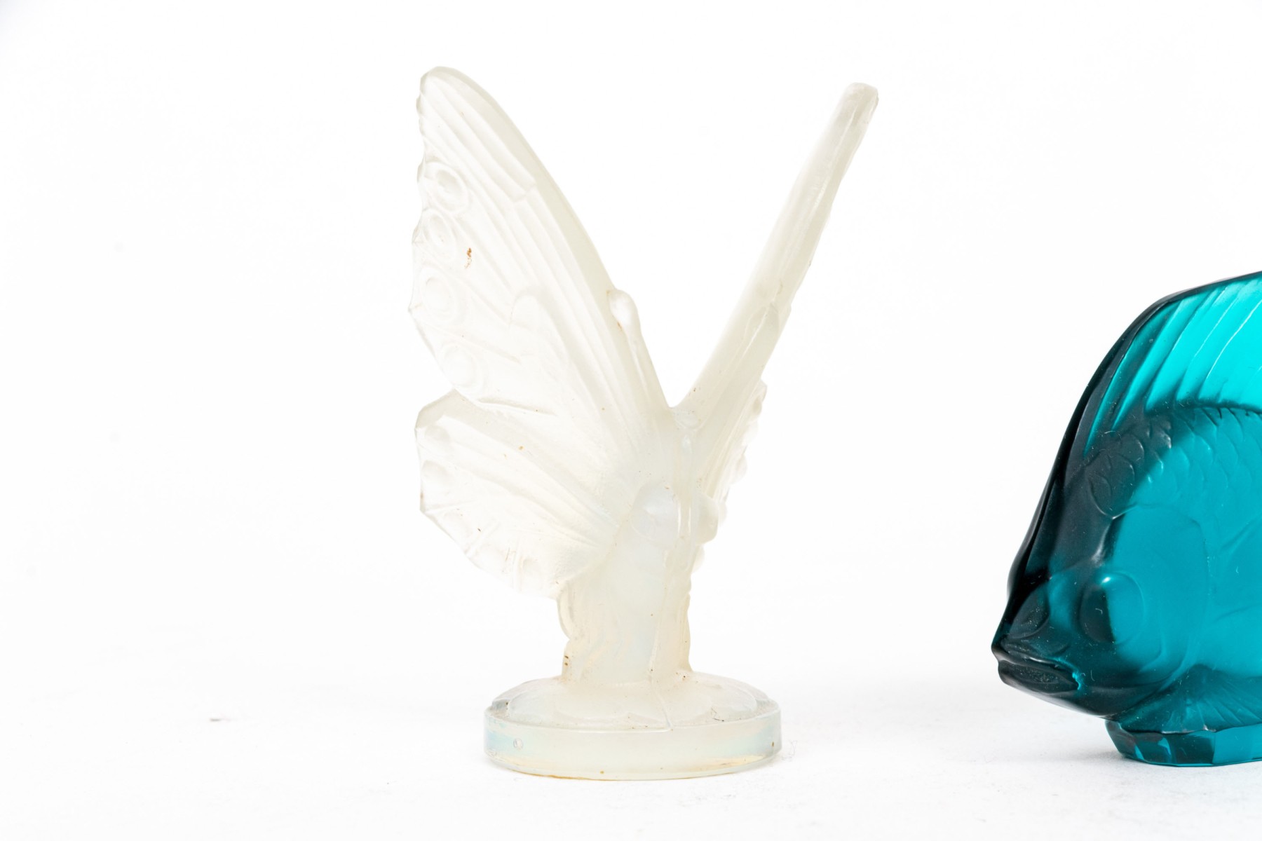 Charming blue green Lalique fish, boxed, with Sabino iridescent glass butterfly