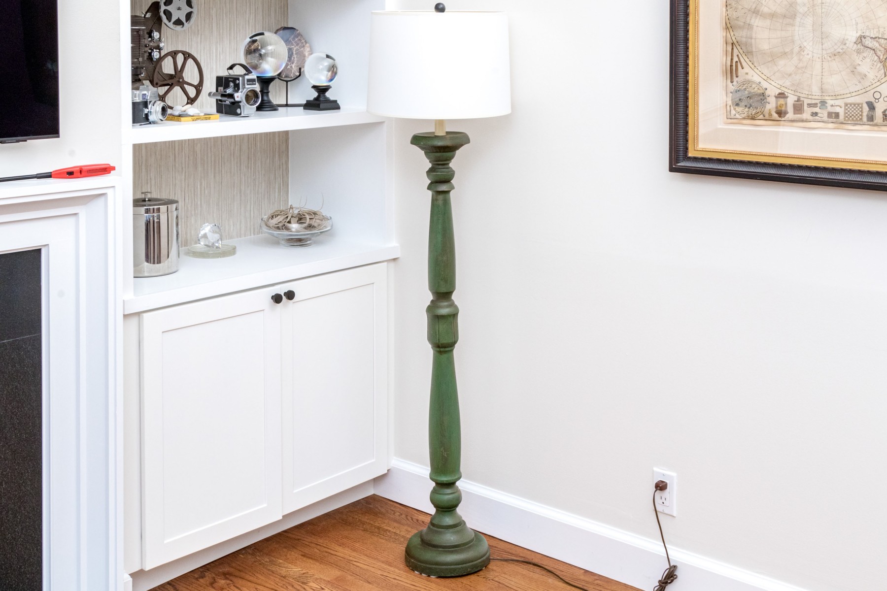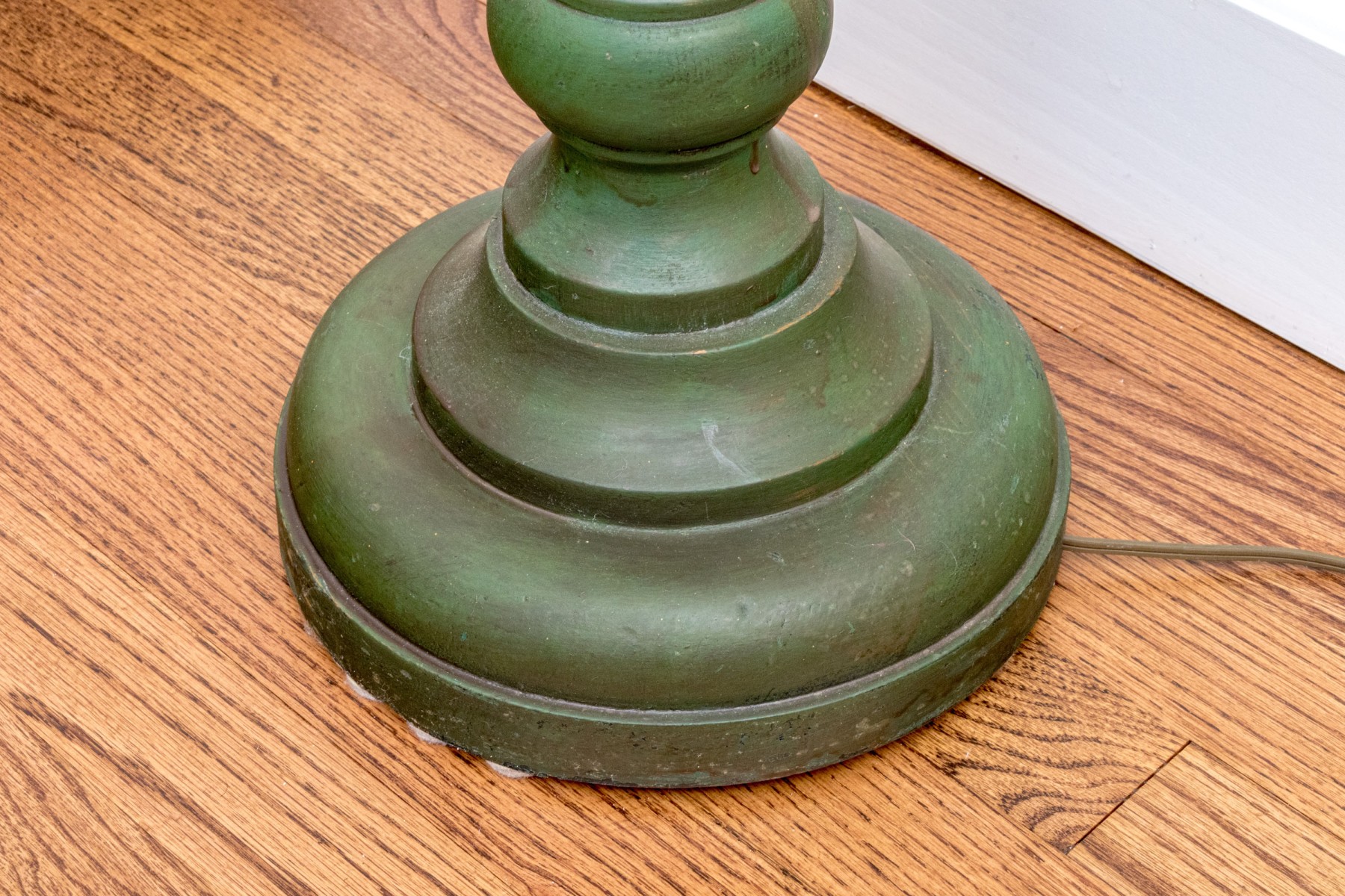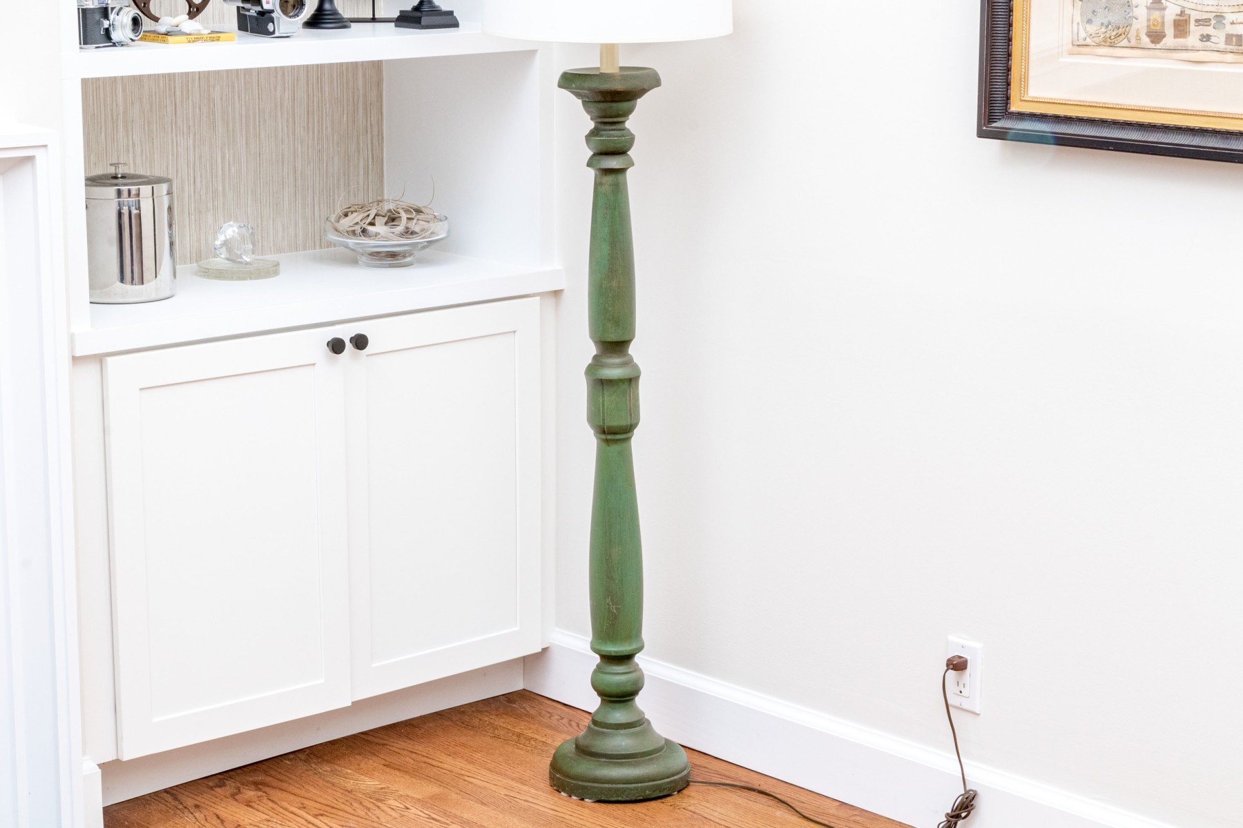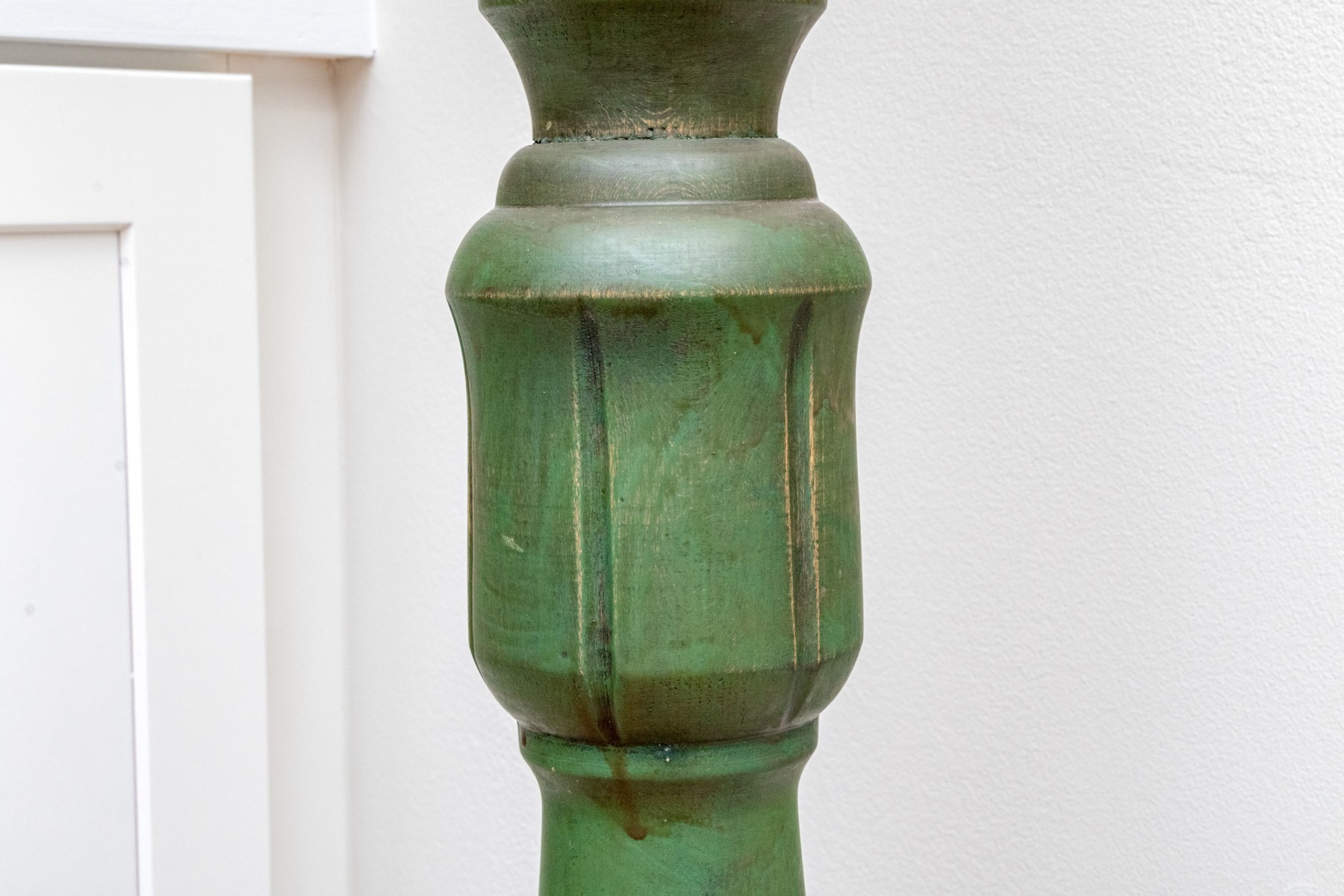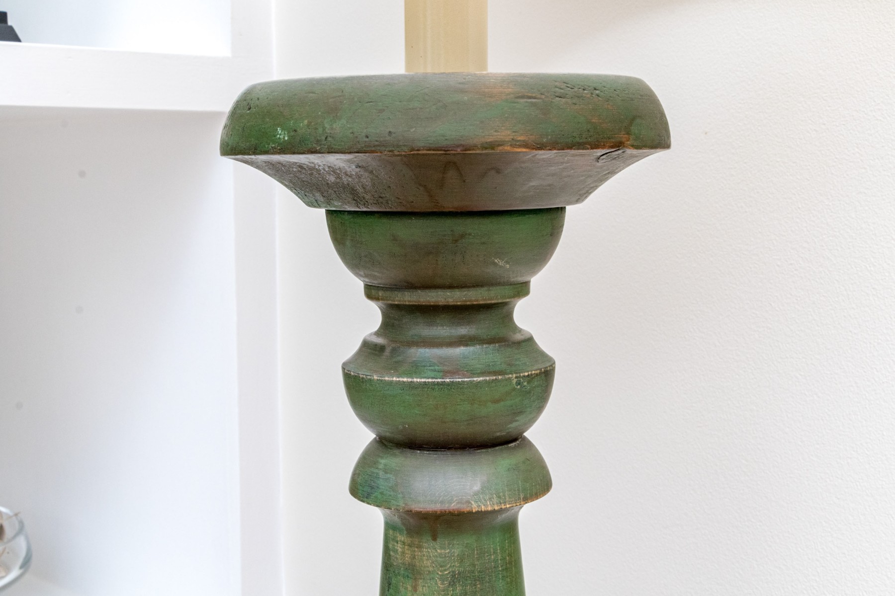 A charming floor lamp exuding a chic blend of rustic farmhouse elegance with a turned wood column sporting a candlestick socket over a baluster form with shapely knops in an attractive antiqued green painted finish. Surmounted with a white drum shade.