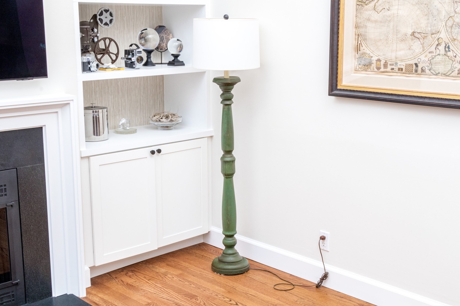 A charming floor lamp exuding a chic blend of rustic farmhouse elegance with a turned wood column sporting a candlestick socket over a baluster form with shapely knops in an attractive antiqued green painted finish. Surmounted with a white drum shade.