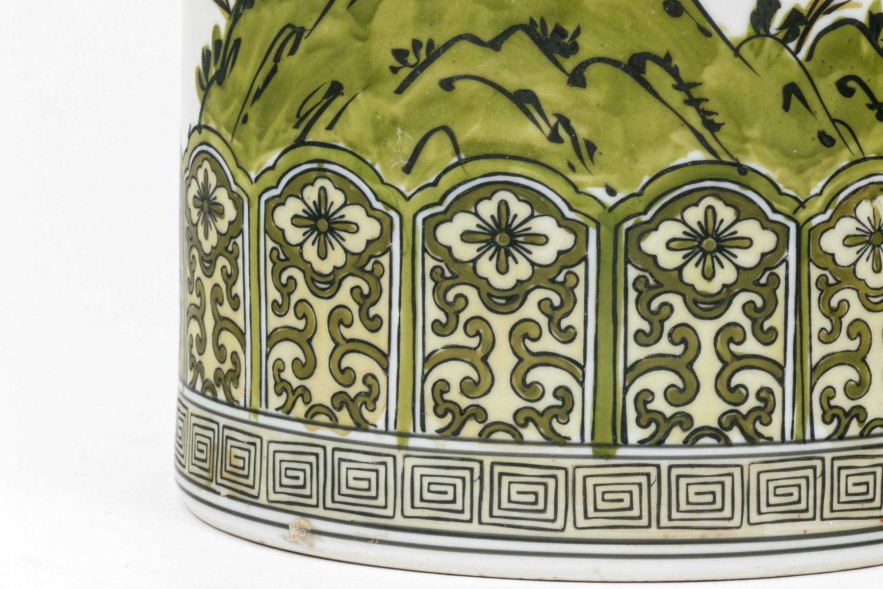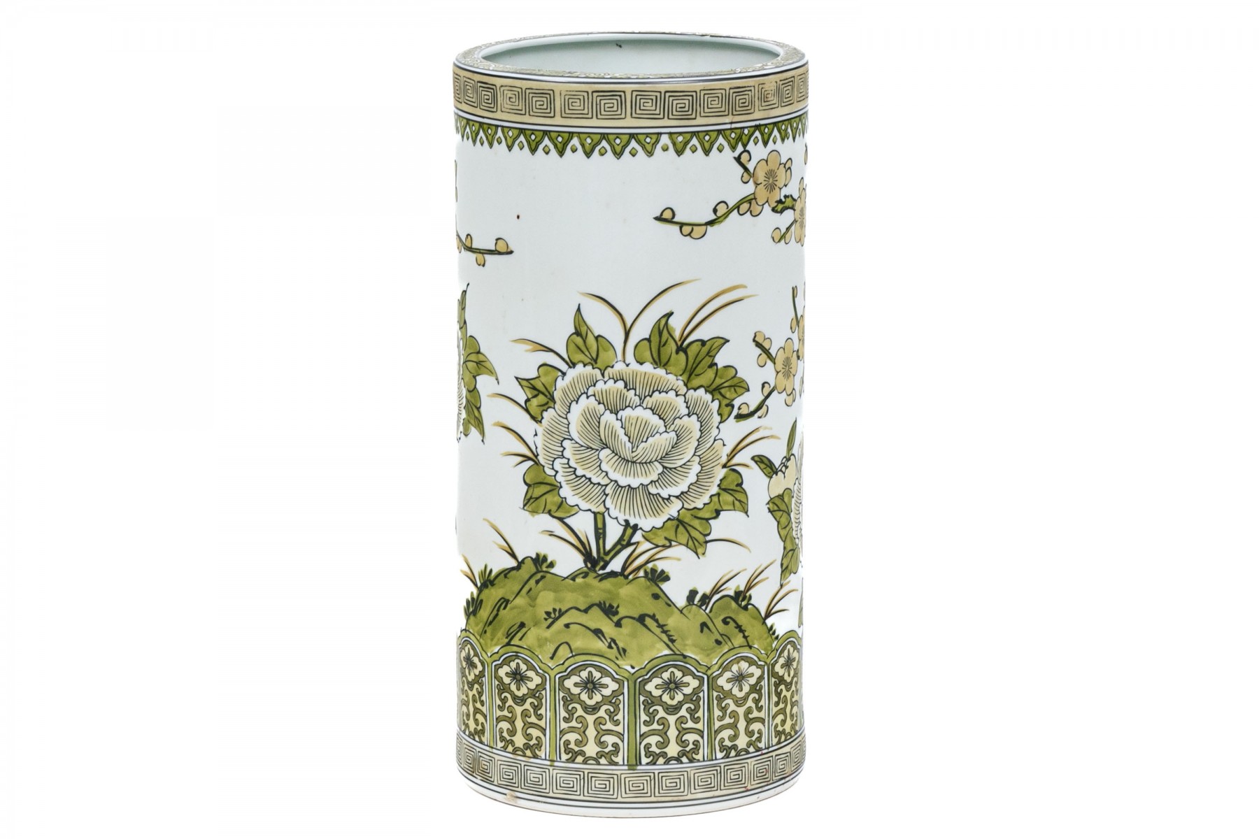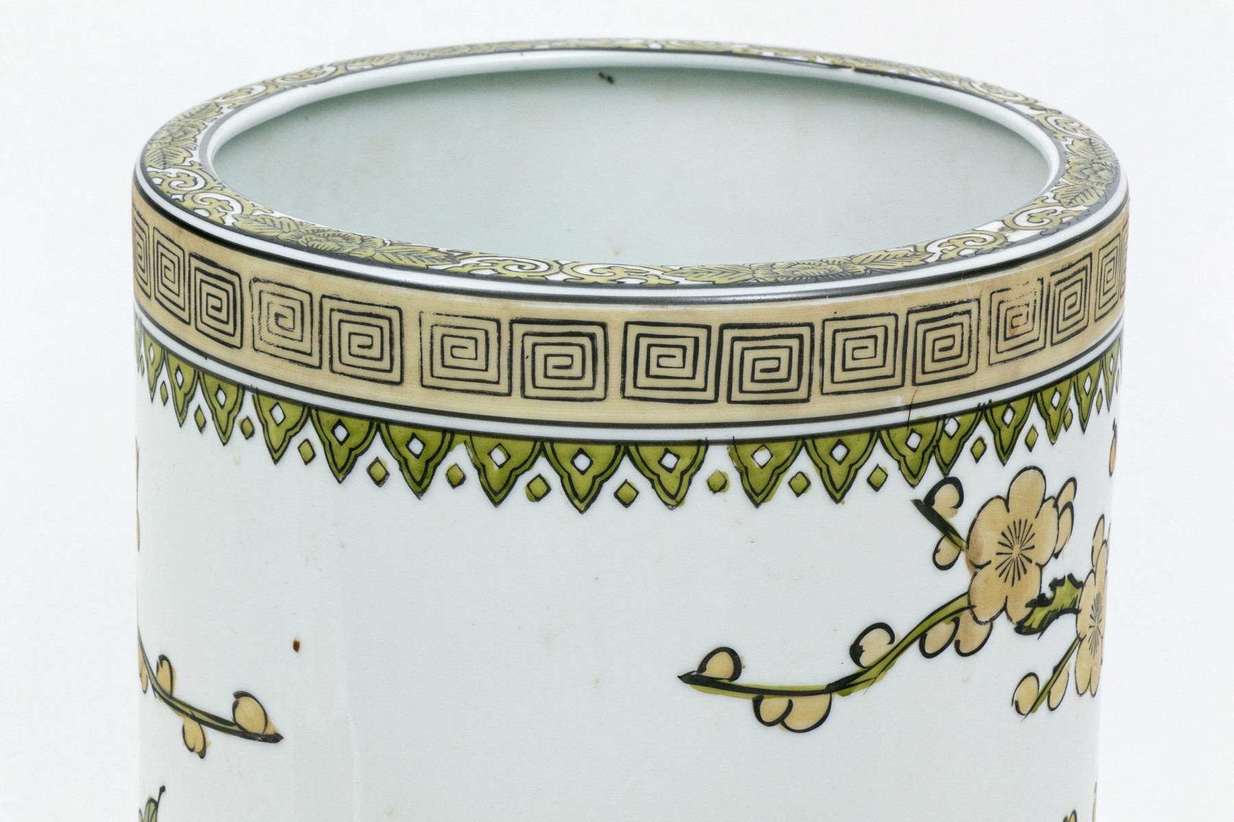 A vintage Japanese enameled porcelain umbrella stand. Cylindrical with floral landscape motif with lappet band at foot and bands with keyfret motif to mouth and foot rim.
