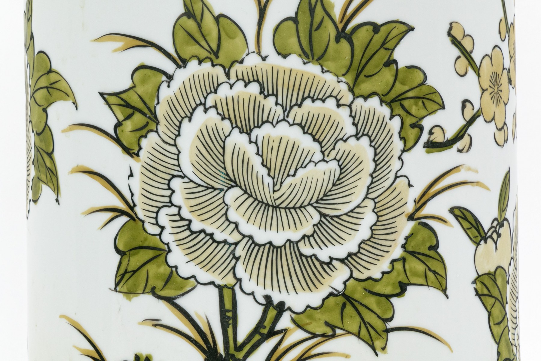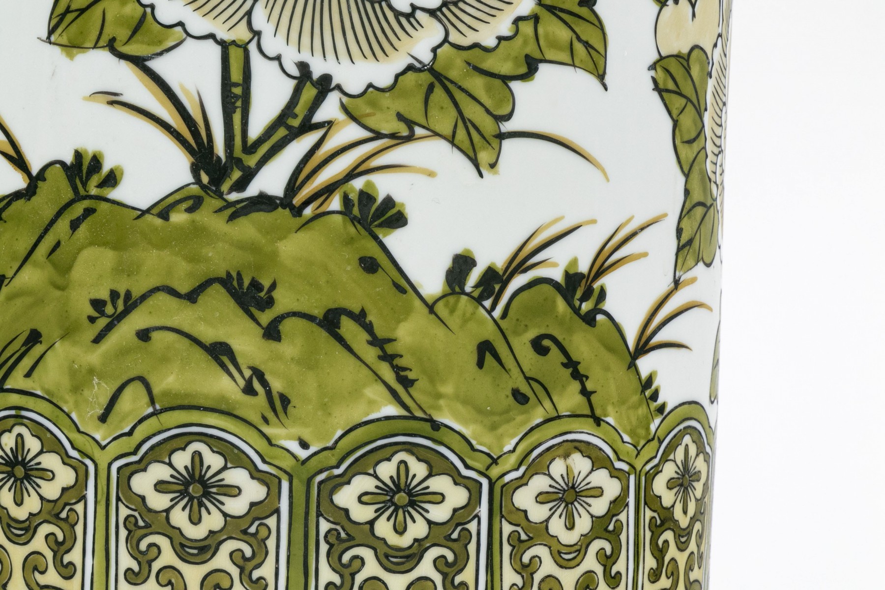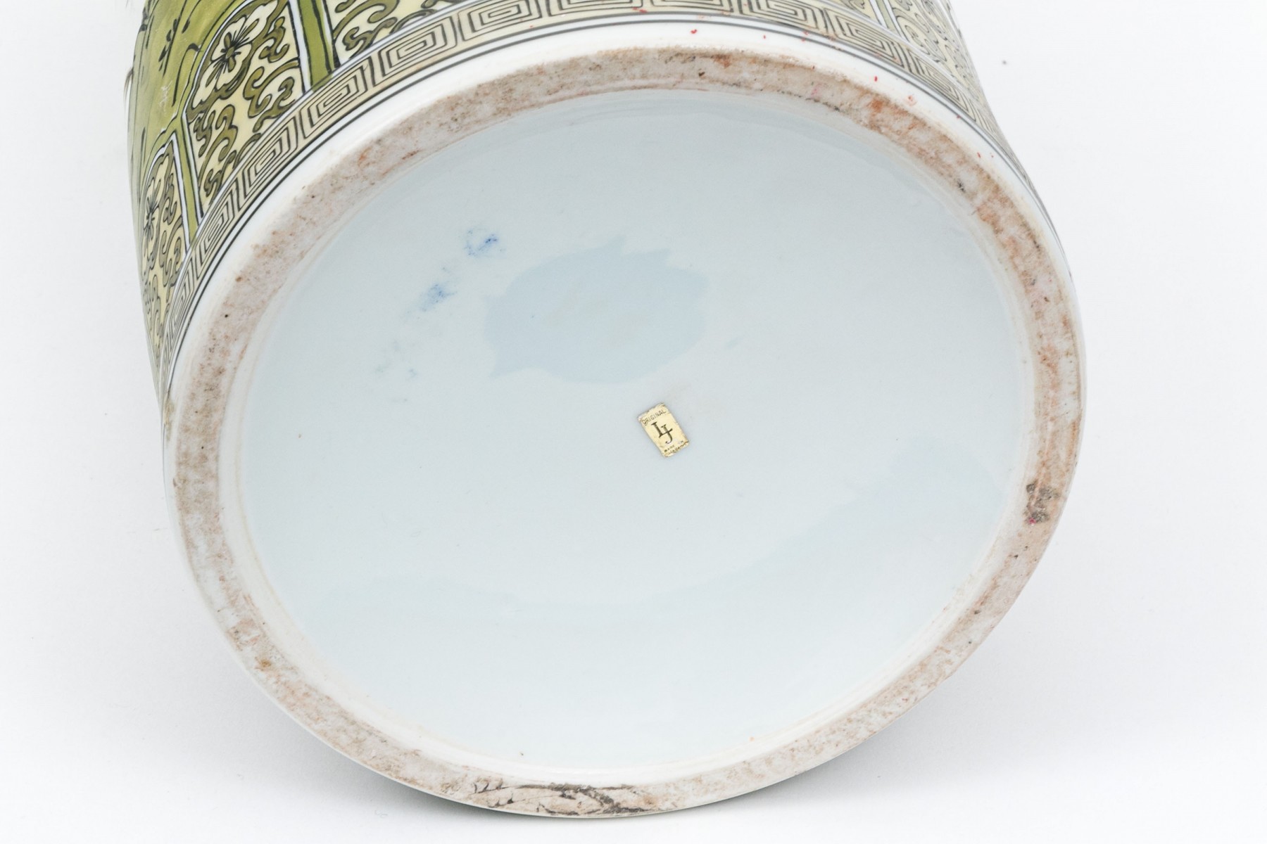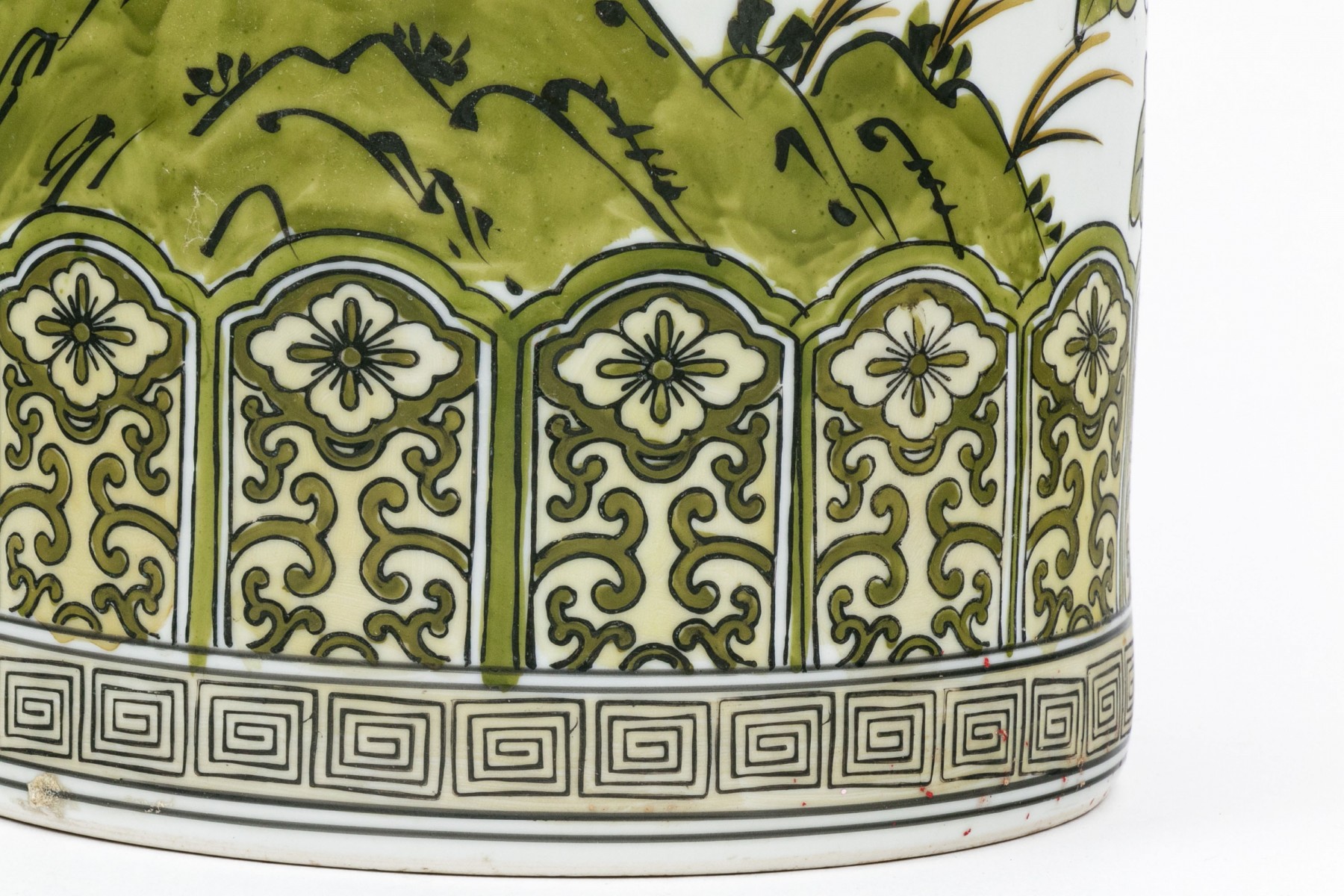 A vintage Japanese enameled porcelain umbrella stand. Cylindrical with floral landscape motif with lappet band at foot and bands with keyfret motif to mouth and foot rim.