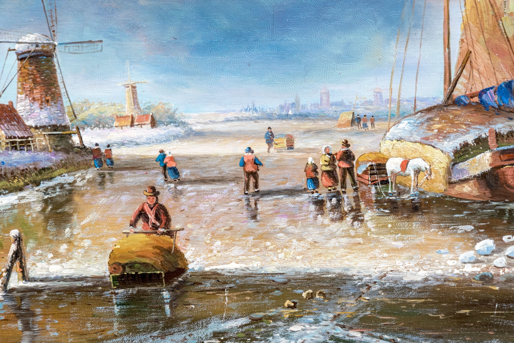 A charming oil painting on canvas in the Flemish style reminiscent of Jacob Jan Coenraad Spohler, depicting a winter scene of figure walking along a dirt path beside a windmill and a building with a stone archway surrounded by orange and green foliage, all beneath a vast, bright blue sky with colorful, billowing clouds. Appears to be unsigned.
